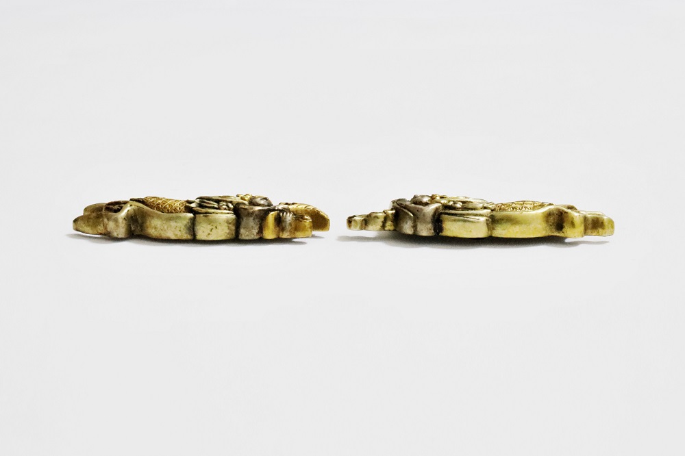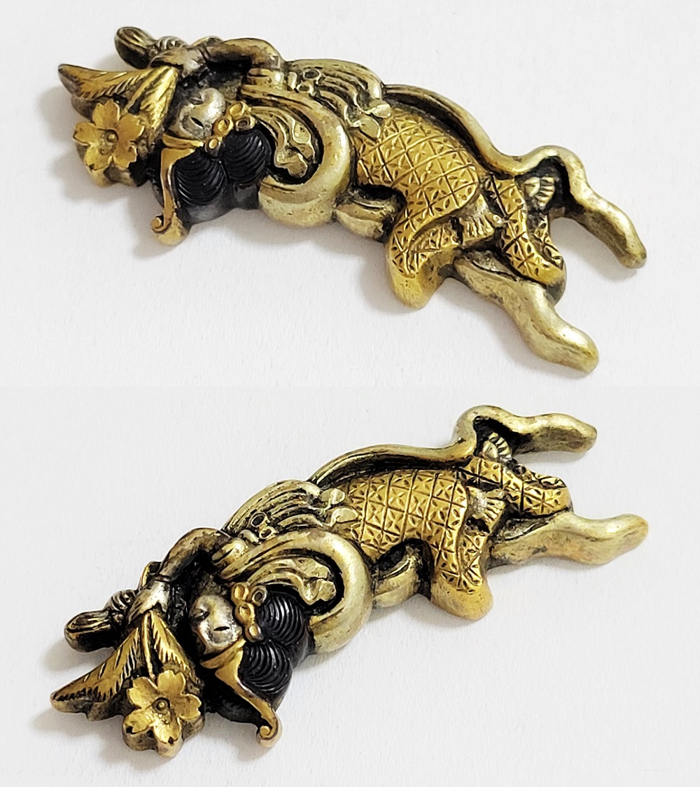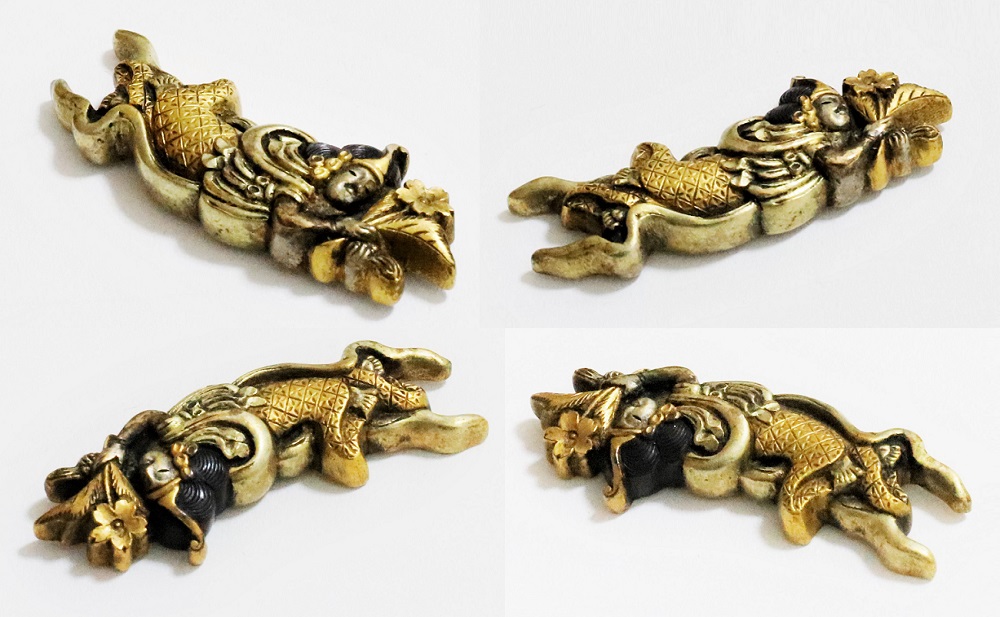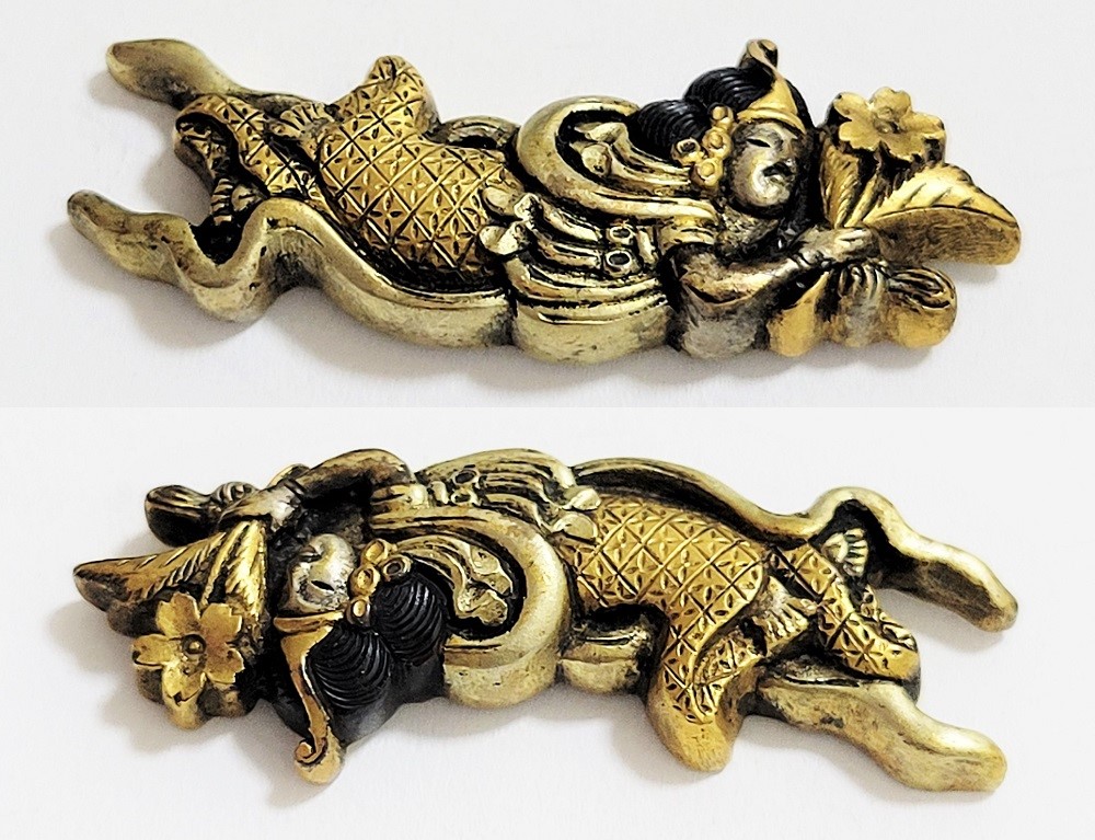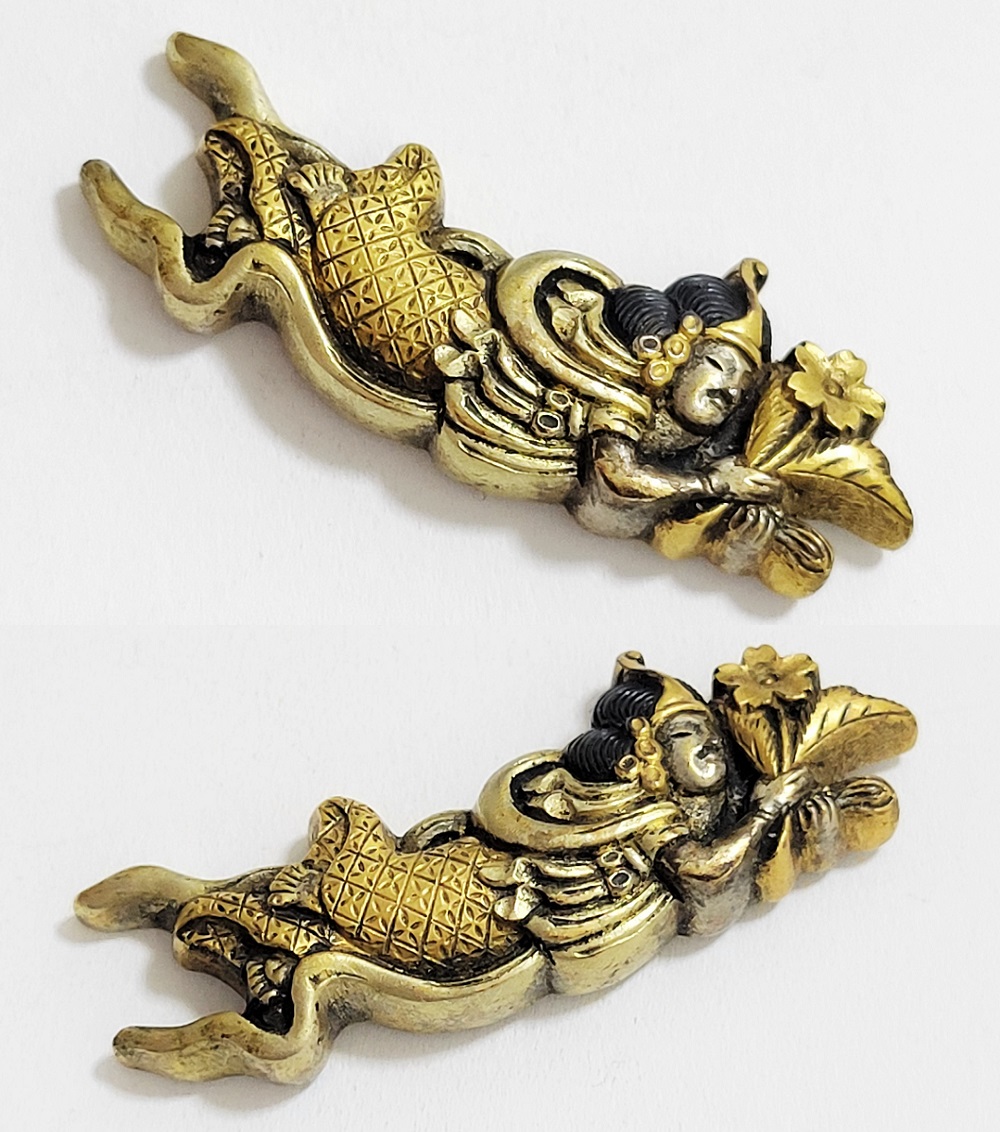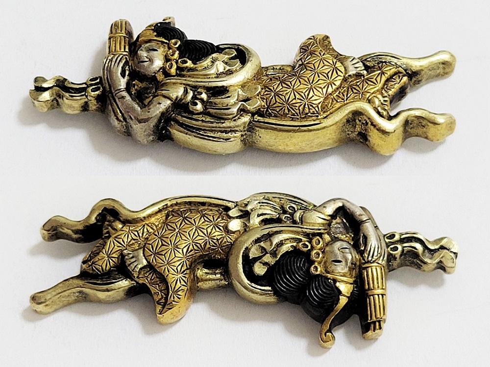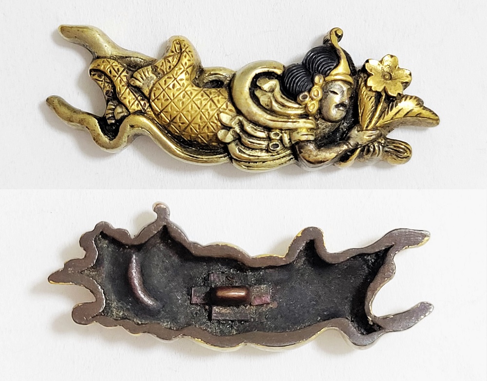 | 飛天(ひてん)は、阿弥陀仏など本尊の周囲を優雅に飛びながら舞い、花を散らし楽を奏し香を薫じるなどして仏を守りたたえる天人・天女のこと。中国では敦煌や雲崗の石窟寺院において、日本では法隆寺金堂壁画や平等院鳳凰堂後背、法界寺阿弥陀堂壁画などにその優美な姿を見せている。本作は天女図、京金具師と極められ2018年保存刀装具審査合格。 |