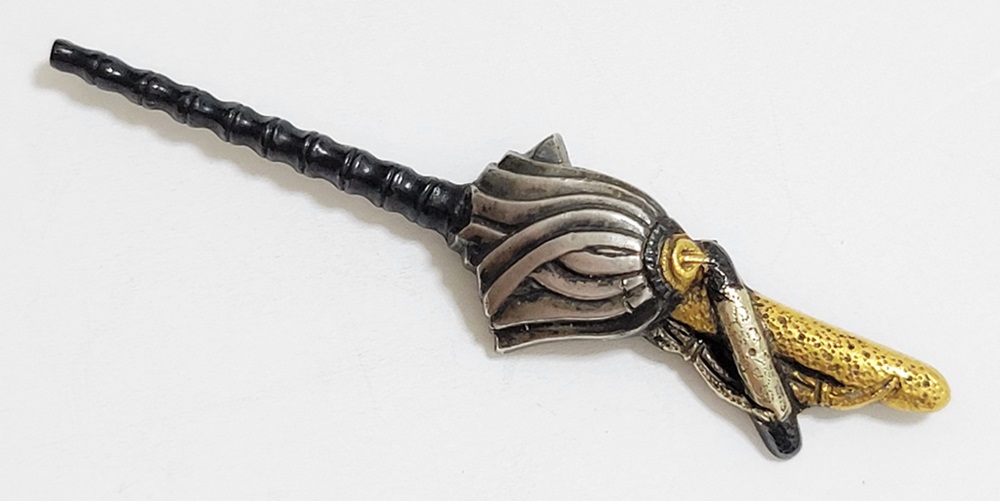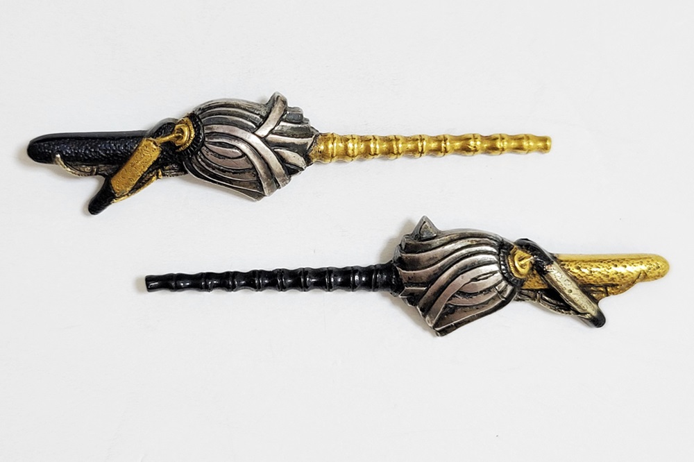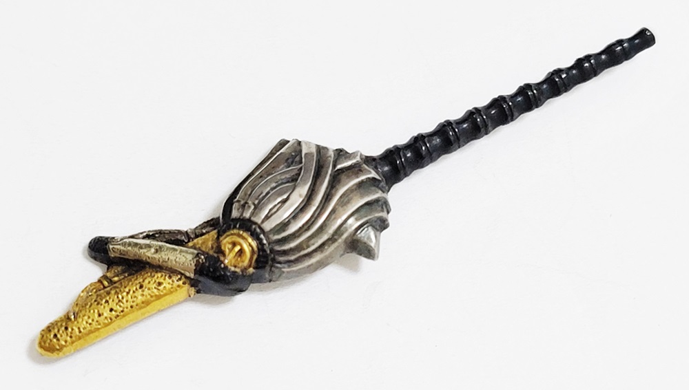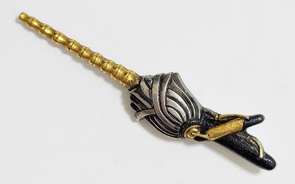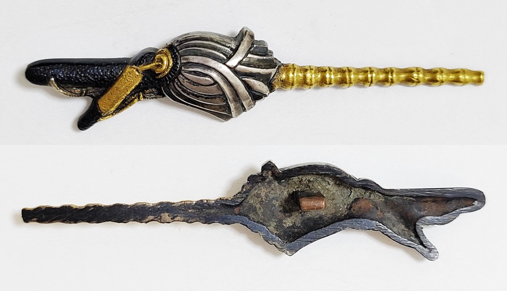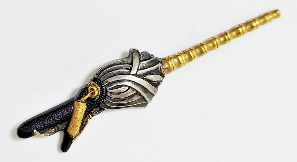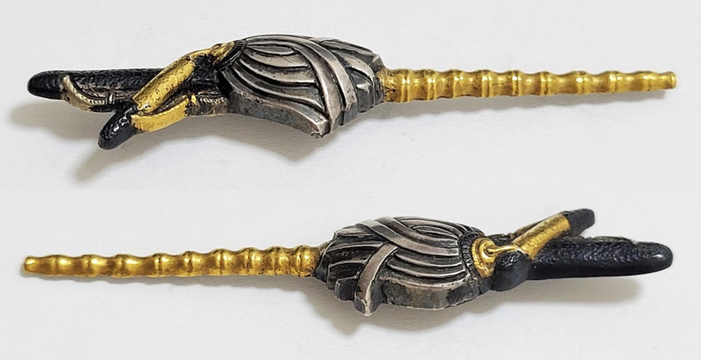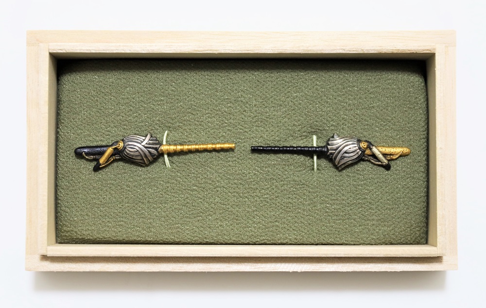 本作は采配と指揮棒図目貫。采配と指揮棒は、武士の時代、戦場で軍勢を率いる大将が手に持ち、陣営を指揮するために振るった指揮具。艶やかな金銀色絵が作を引き立てている。