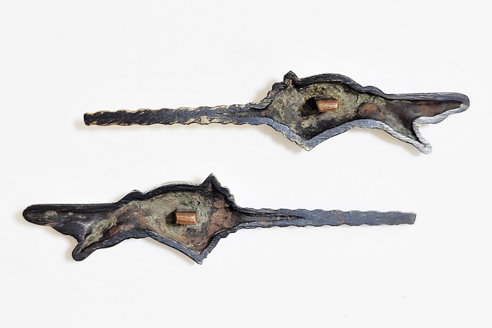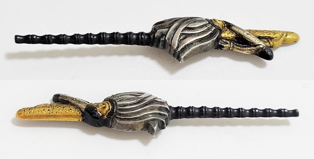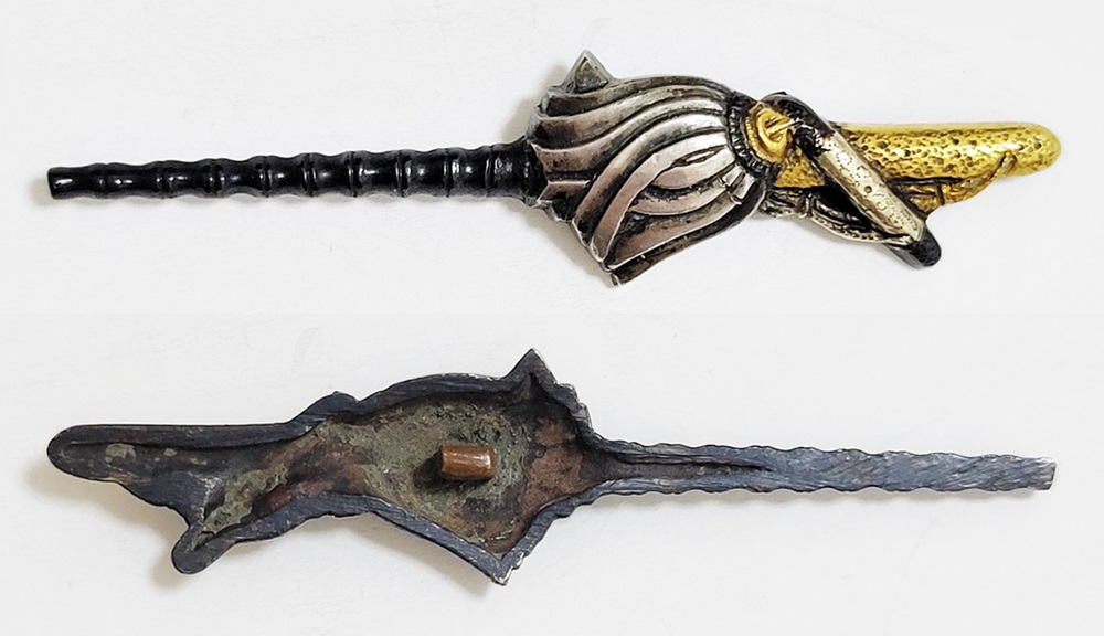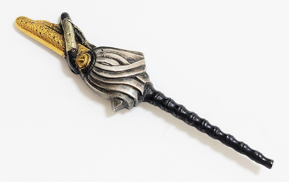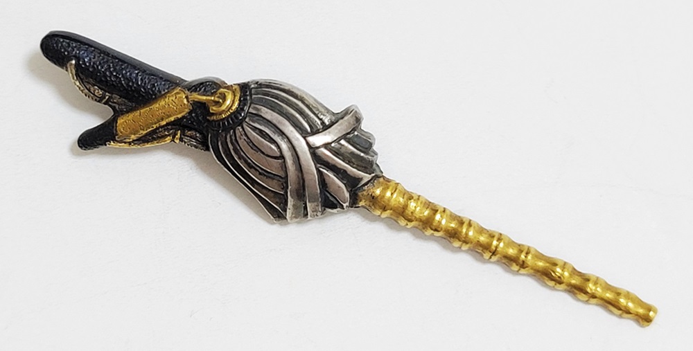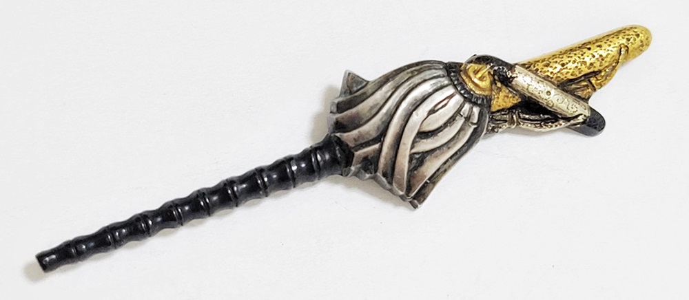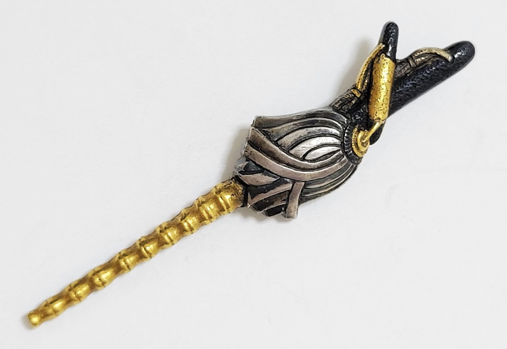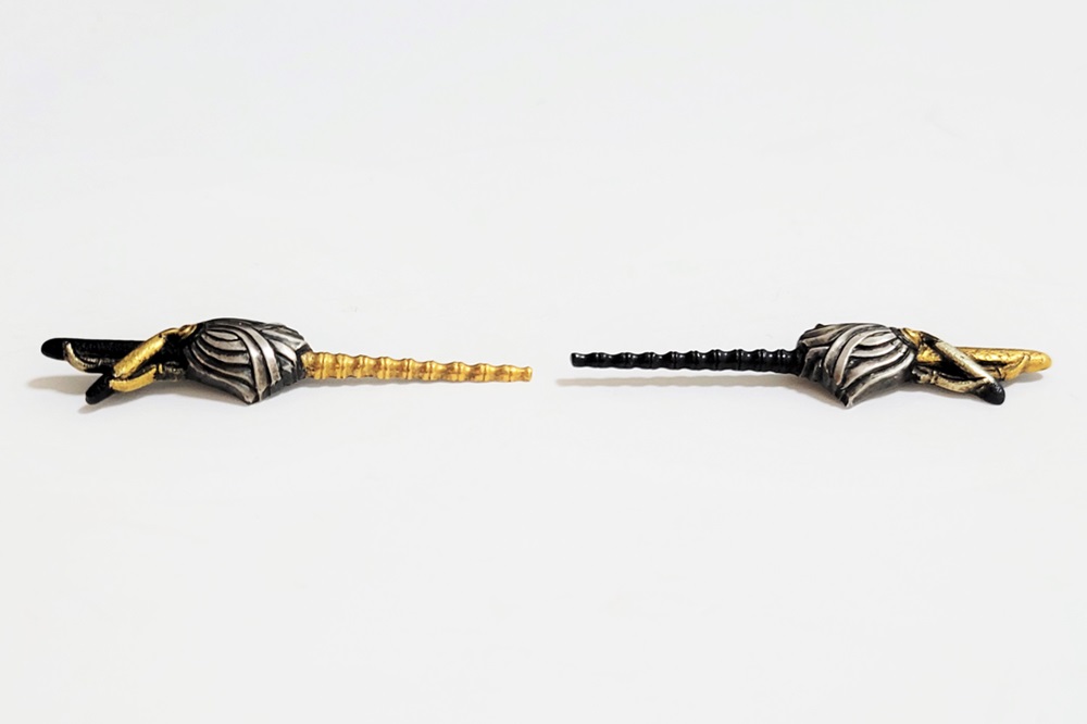 本作は采配と指揮棒図目貫。采配と指揮棒は、武士の時代、戦場で軍勢を率いる大将が手に持ち、陣営を指揮するために振るった指揮具。艶やかな金銀色絵が作を引き立てている。