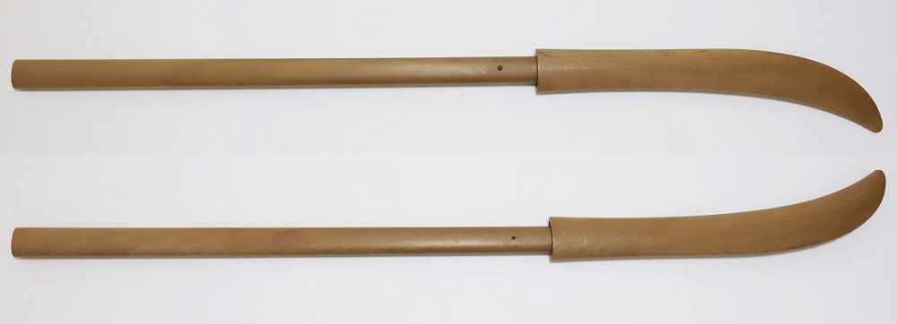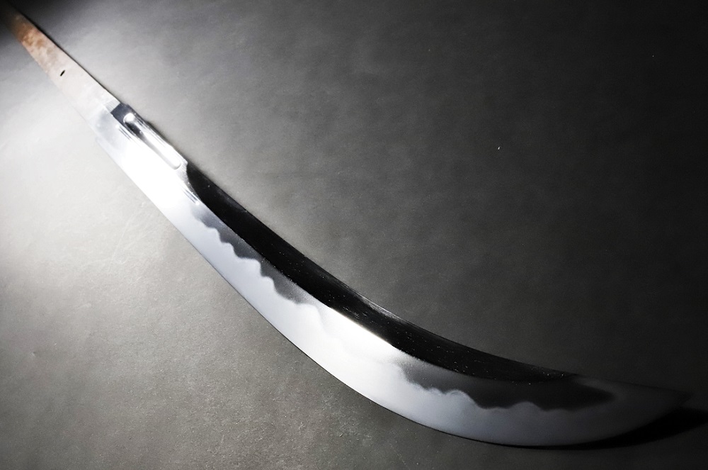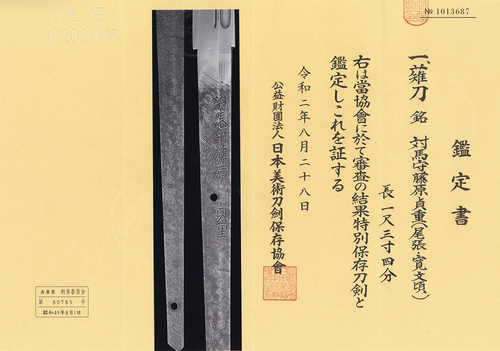 | 対馬守藤原貞重は尾張名古屋住、大阪にても造る。越中守貞幸門。良き業物刀工。本作は同工によるめずらしい薙刀作。焼幅広く健全で出来が良い。2020年6月審査で特別保存刀剣合格。 |