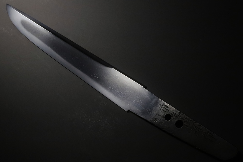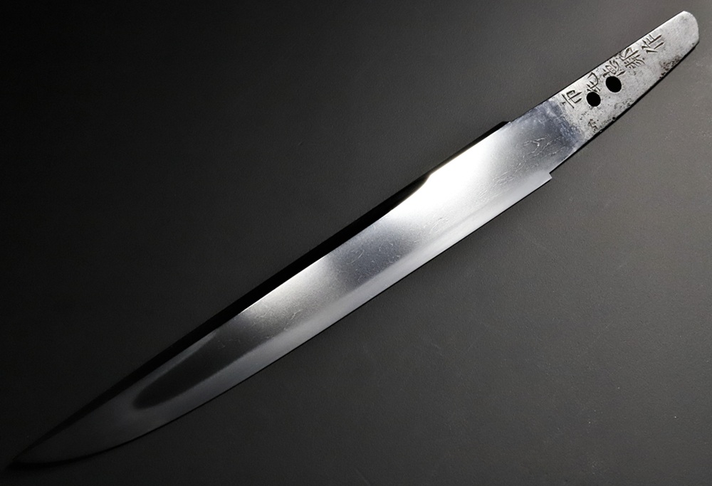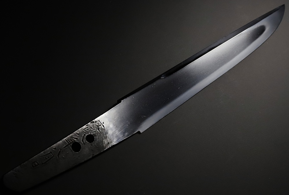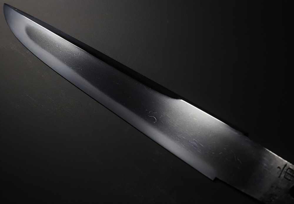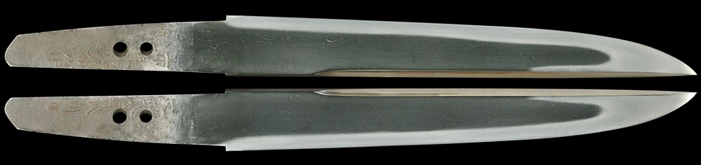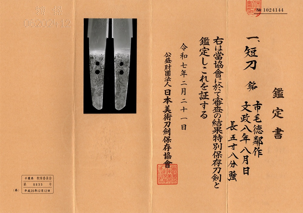 市毛源左衛門徳鄰(のりちか・とくりん)は安永六年(1777)常陸国茨城郡生まれ。寛政六年(1794)水戸藩士久米長徳に入門。後に摂津の尾崎助隆に入門。文化六年(1809)助隆同門の直江助共と同時に水戸藩工を命ぜられる。天保元年(1830)上京して伊賀守金道の斡旋で近江介を受領。天保六年(1835)59歳没。本作は、腰から上の棟側を削いで棟を僅かに残す変り形の造込み。特別な注文を受けた作であろう。小板目良く詰んだ地鉄に、小沸が付いて匂い口が深い穏やかな湾れ調刃文。水戸新々刀随一の刀工で作品希少の徳鄰らしさが存分にあらわれた出色の短刀。徳鄰49歳、円熟期の傑作。2004年審査保存刀剣を2024年12月審査で特別保存刀剣に昇格。