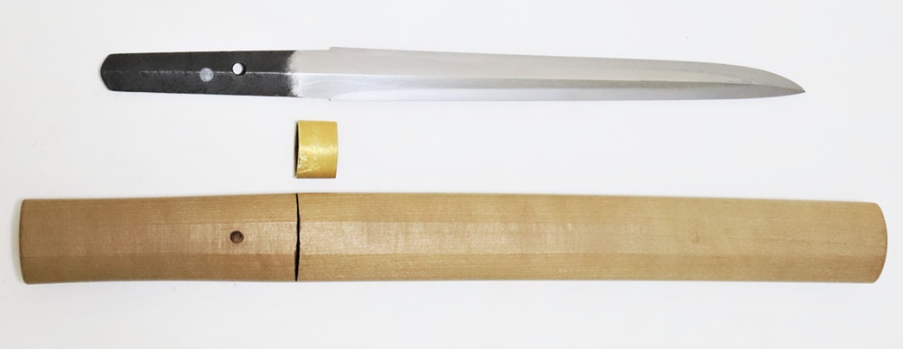 | 両刃は室町時代中期以降の短刀に限られ、菖蒲造りの両方に刃があり左右均衡でないものをいう。応仁の乱(1467)以降、乱れた世相の中で作り出され当時全国的に伝播した。本作は生ぶ無銘の両刃造り短刀。作柄備前の上位両刃と窺う。茎錆は落ち着いており、おそらく祐定銘から最高名手の与三左衛門尉(祐定偽銘)を入れられ後に除去された時代の産物と推察する。昭和26年岡山県登録、昭和38年特別貴重刀剣認定書が付されている。 |