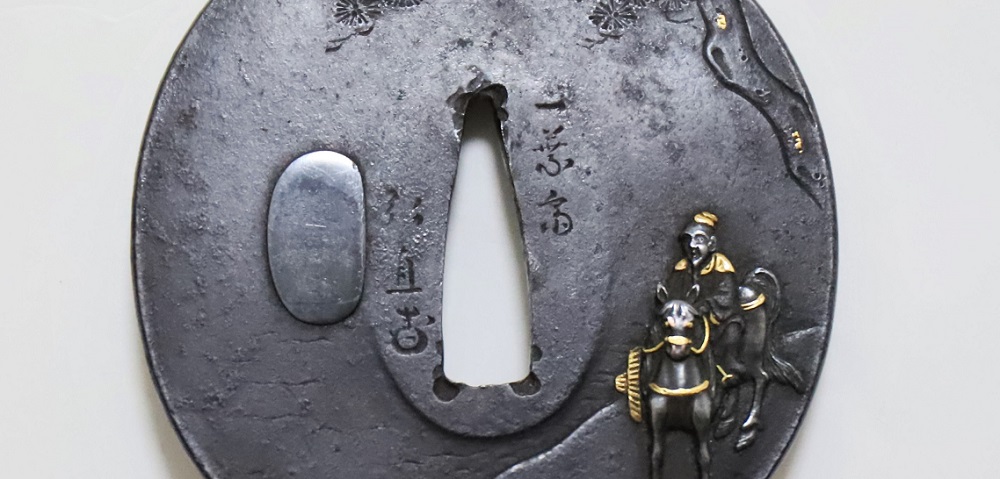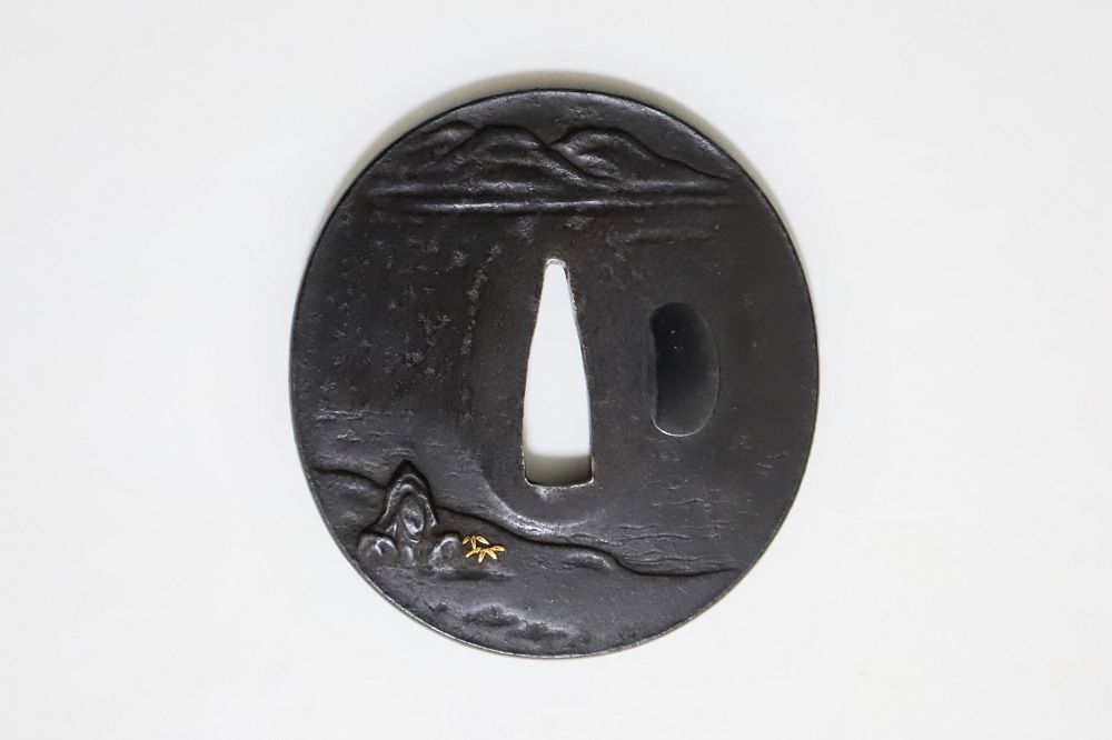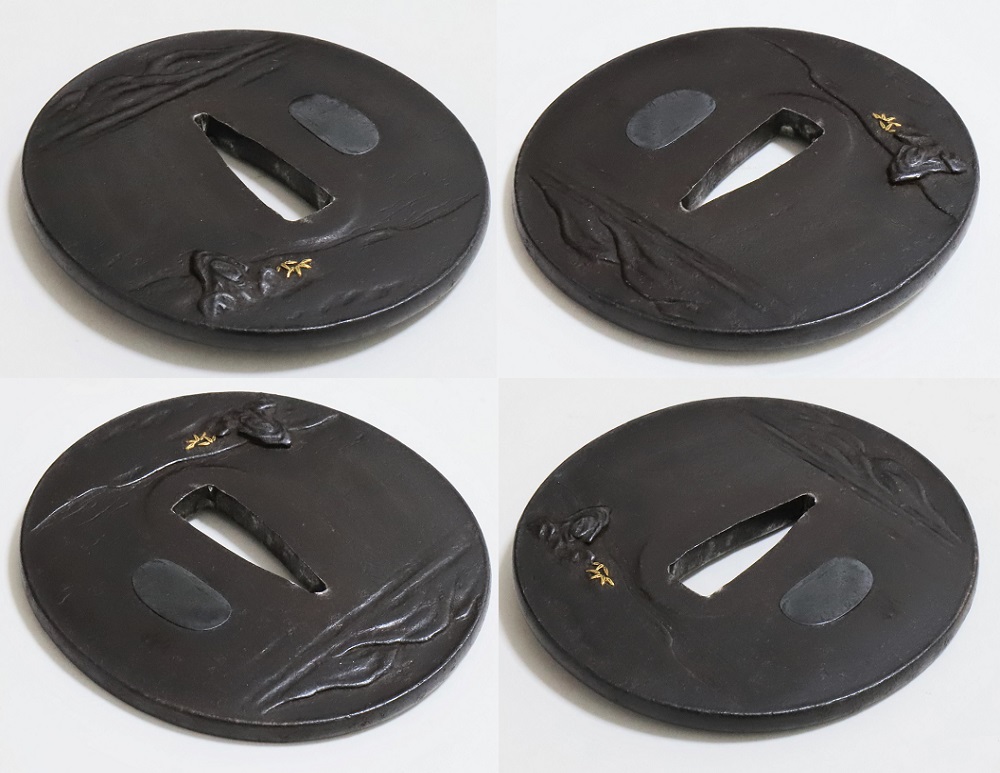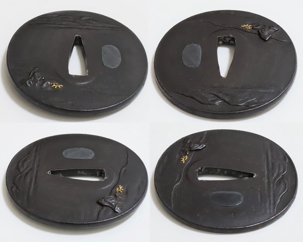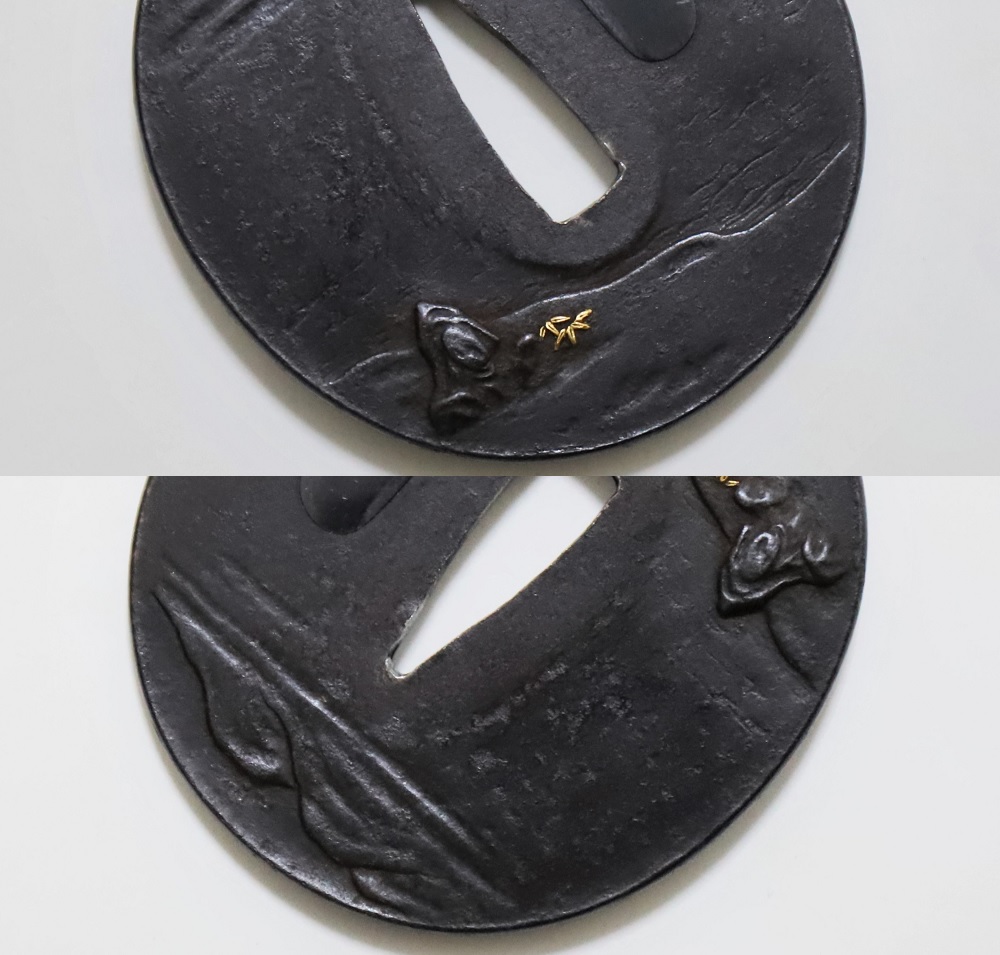| 一葉斎弘直は打越弘寿の門人で江戸時代後期の水戸金工。本作は、精錬された鉄、僅かな鋤残耳、簡素ながらも広がりを想起させる構図と彫法で非の打ち所がないと感じ得る上出来の名鐔。 |