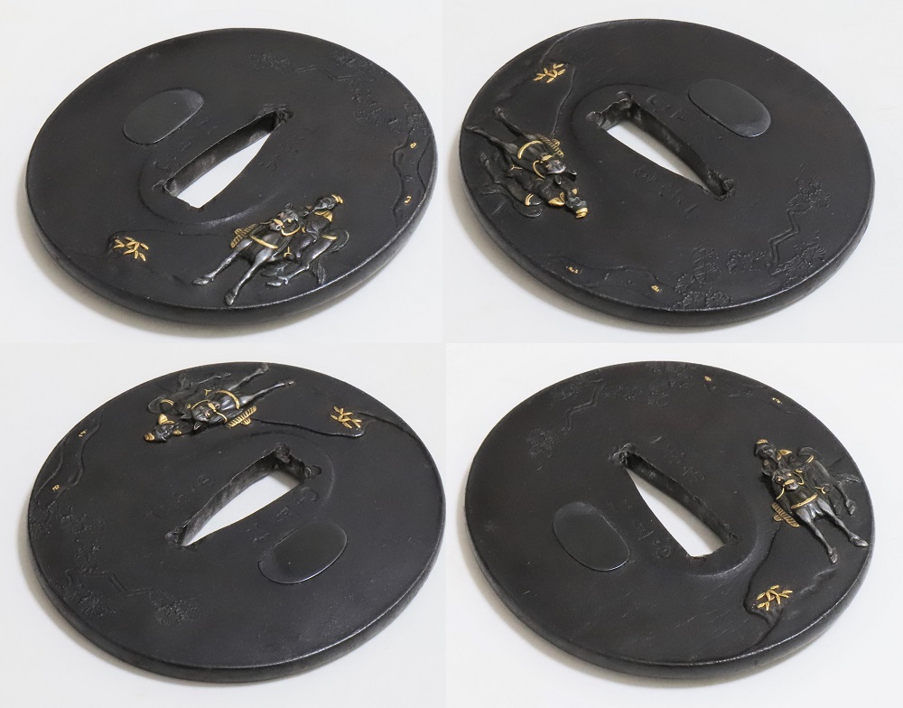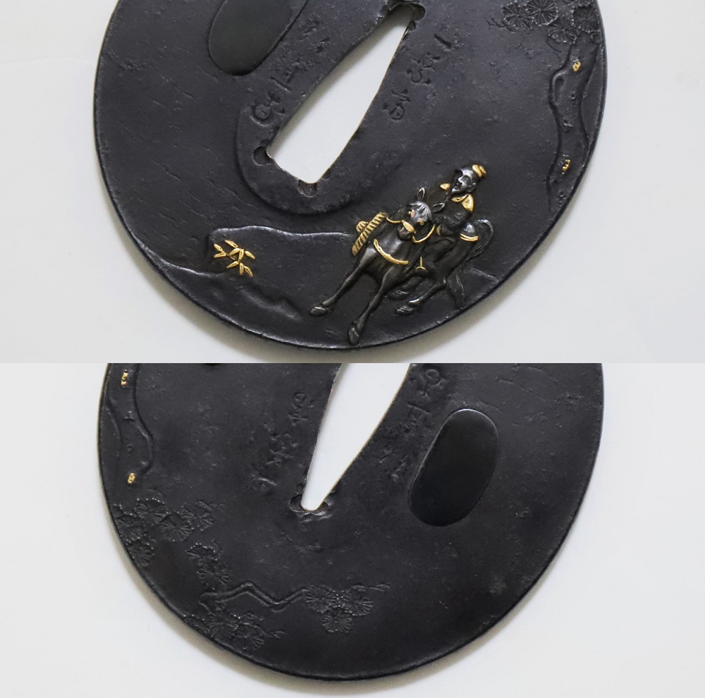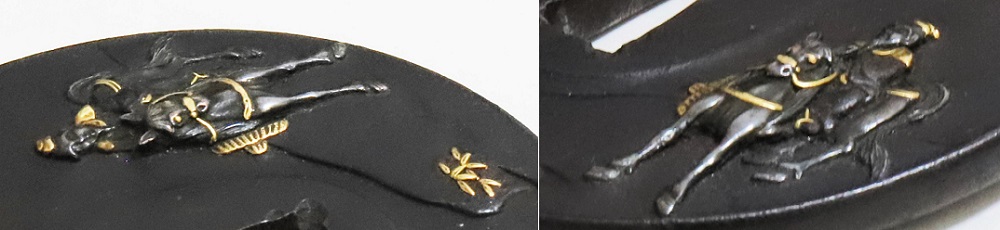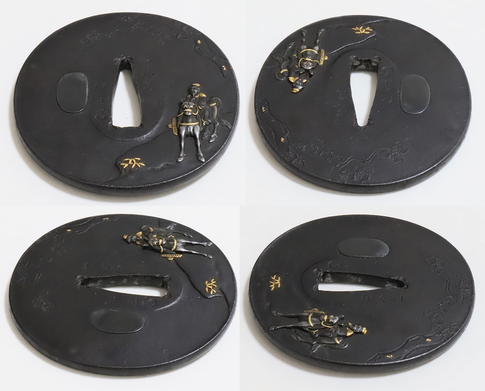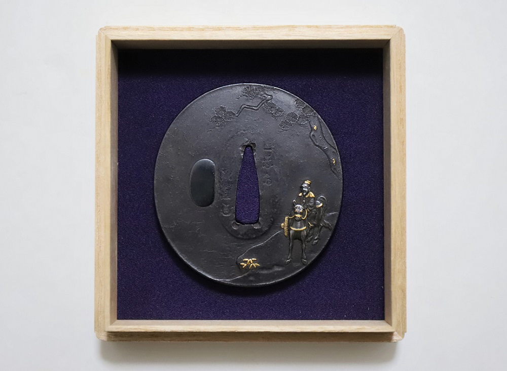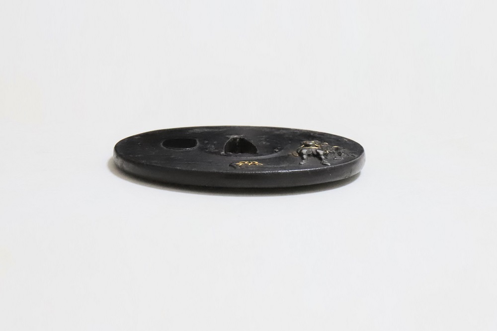 | 材質 | 鉄磨地 竪丸形 鋤出高彫 象嵌色絵 鋤残耳 |