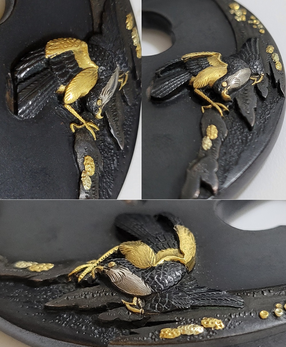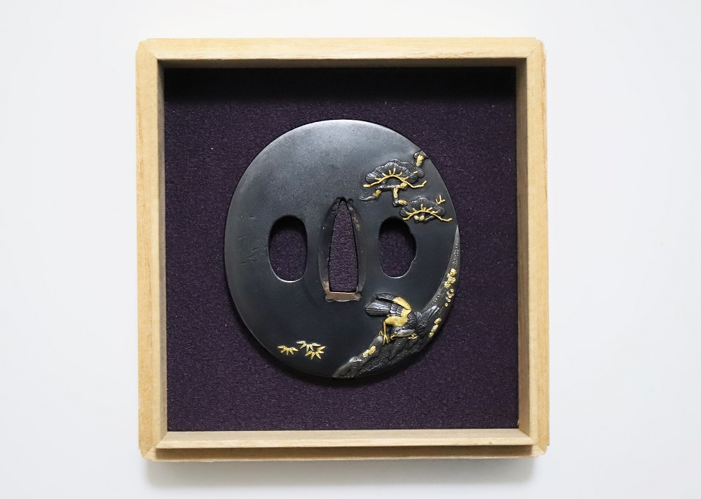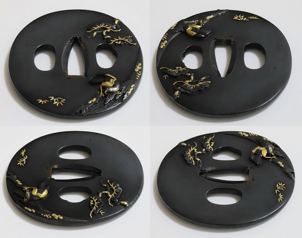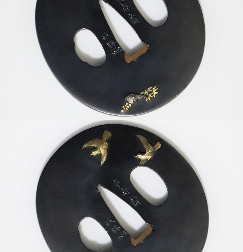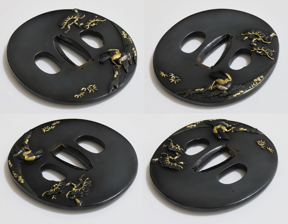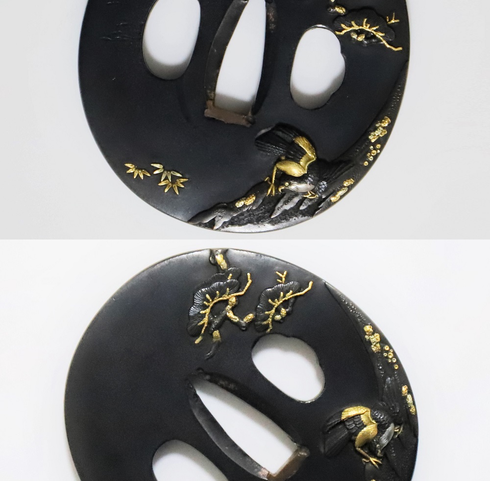 | 本作は「会津の美5武器・武具編」所載鐔。会津藩高禄武士からの注文作と思われる名鐔。以下「会津の美」記載説明:「赤銅地に、表は亭々たる老松と眼光鋭く獲物を狙う猛禽とを高彫金銀色絵にし、裏には金色絵の小鳥二羽を騒がせた図で、政勝の作品中でも簡素な図柄であるといえる。大空に向かって描写したとも考えられ、鐔面に広い空間を残しているところに同工の巧みさをより一層感じさせる。猛禽の樹幹を掴んでいる骨ばった脚や目と嘴の凄さにも政勝の技倆がうかがわれる作品である」 この皆川政勝は江戸に出て花鳥の図をお家芸とする石黒政常の門に入り、やがて師の一字を受けて帰郷し、優品を数多く製したが、この鐔は文政-天保頃の作品であろう。東壽齊を号とした。 |