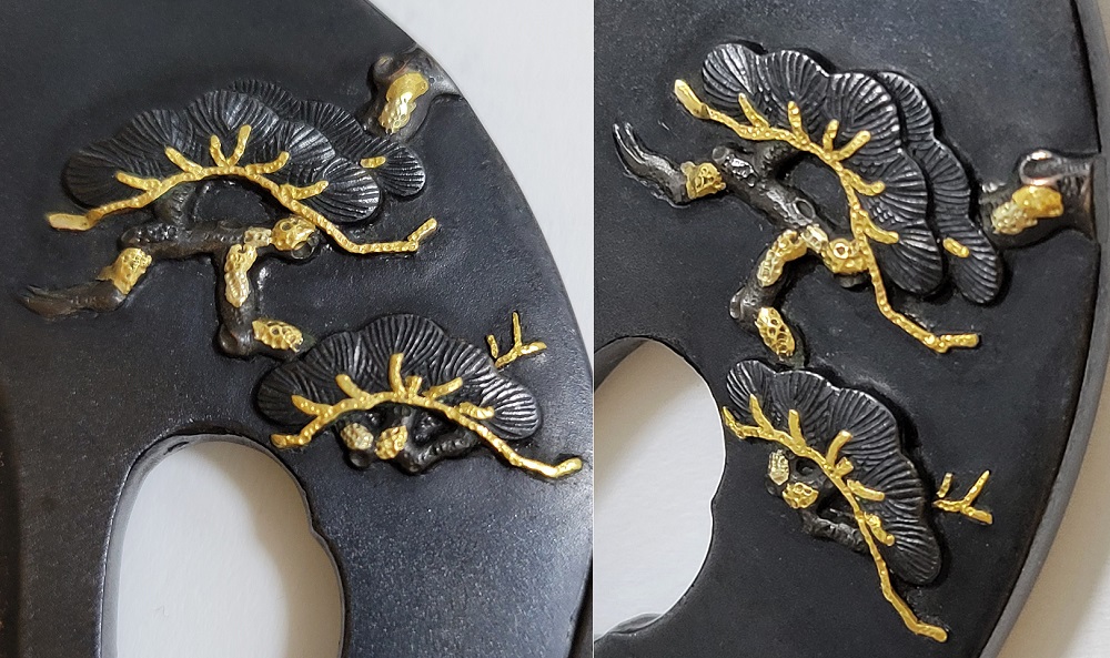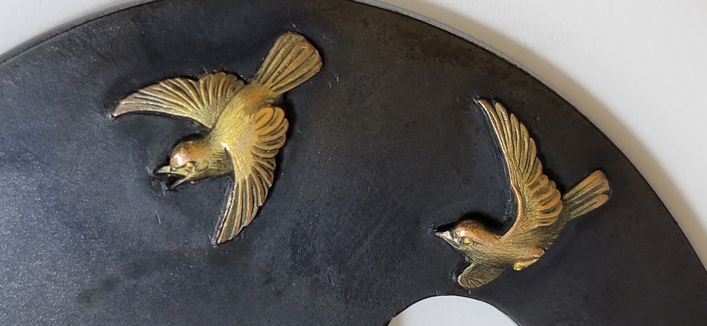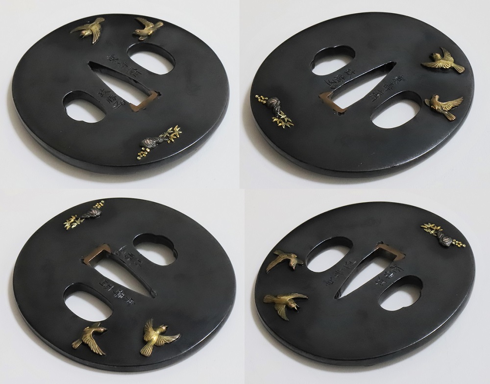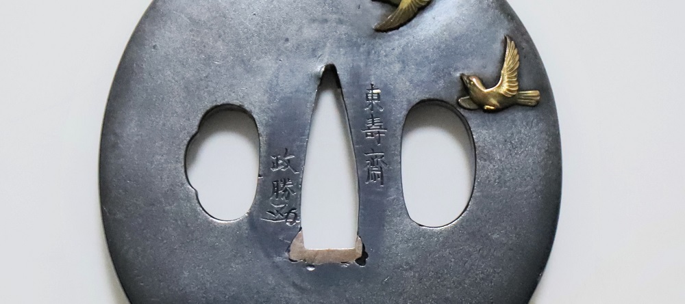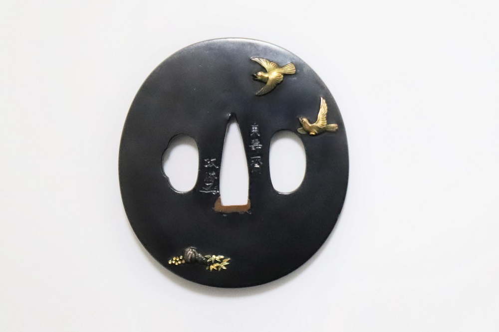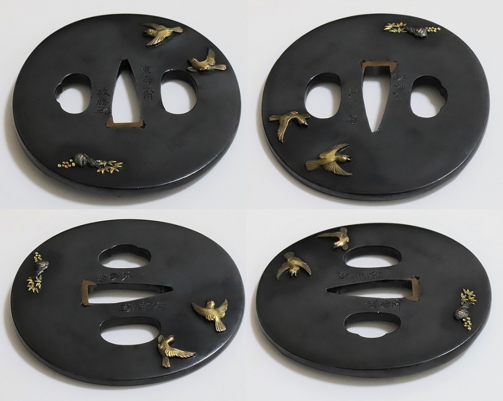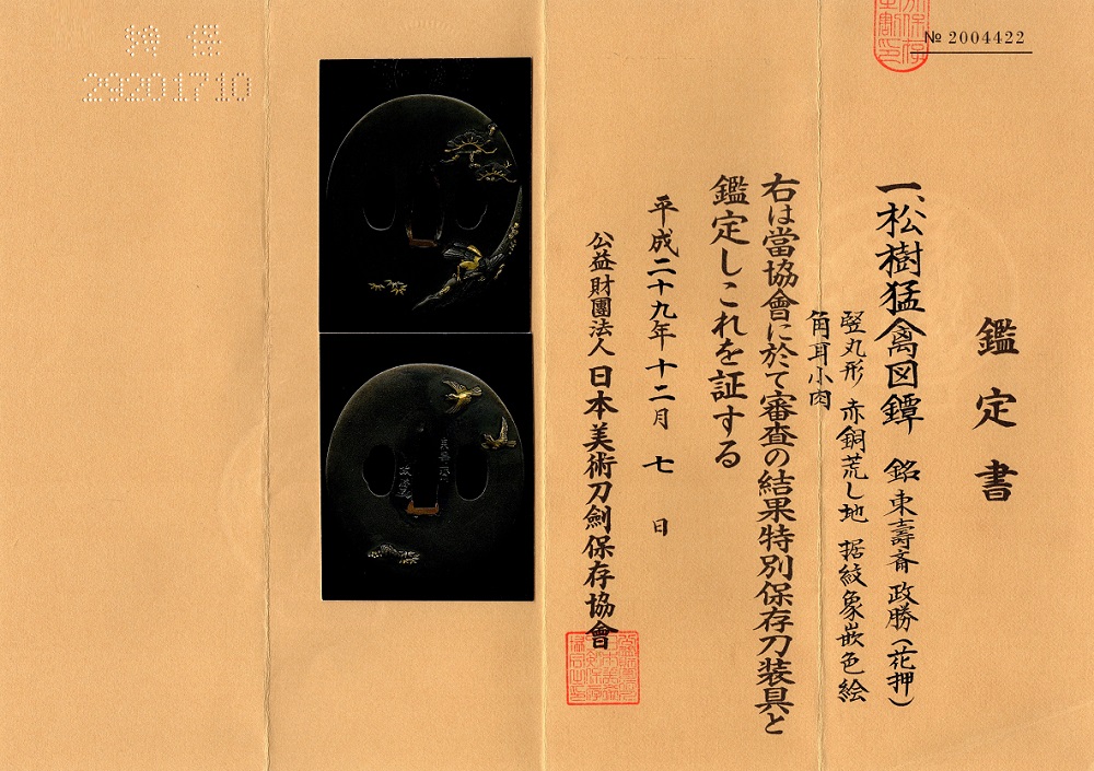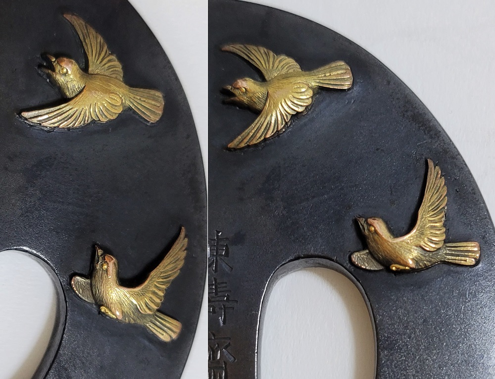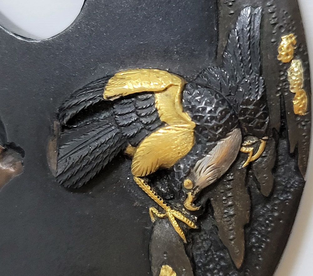| 本作は「会津の美5武器・武具編」所載鐔。会津藩高禄武士からの注文作と思われる名鐔。以下「会津の美」記載説明:「赤銅地に、表は亭々たる老松と眼光鋭く獲物を狙う猛禽とを高彫金銀色絵にし、裏には金色絵の小鳥二羽を騒がせた図で、政勝の作品中でも簡素な図柄であるといえる。大空に向かって描写したとも考えられ、鐔面に広い空間を残しているところに同工の巧みさをより一層感じさせる。猛禽の樹幹を掴んでいる骨ばった脚や目と嘴の凄さにも政勝の技倆がうかがわれる作品である」 この皆川政勝は江戸に出て花鳥の図をお家芸とする石黒政常の門に入り、やがて師の一字を受けて帰郷し、優品を数多く製したが、この鐔は文政-天保頃の作品であろう。東壽齊を号とした。 |