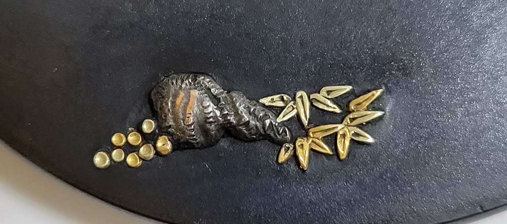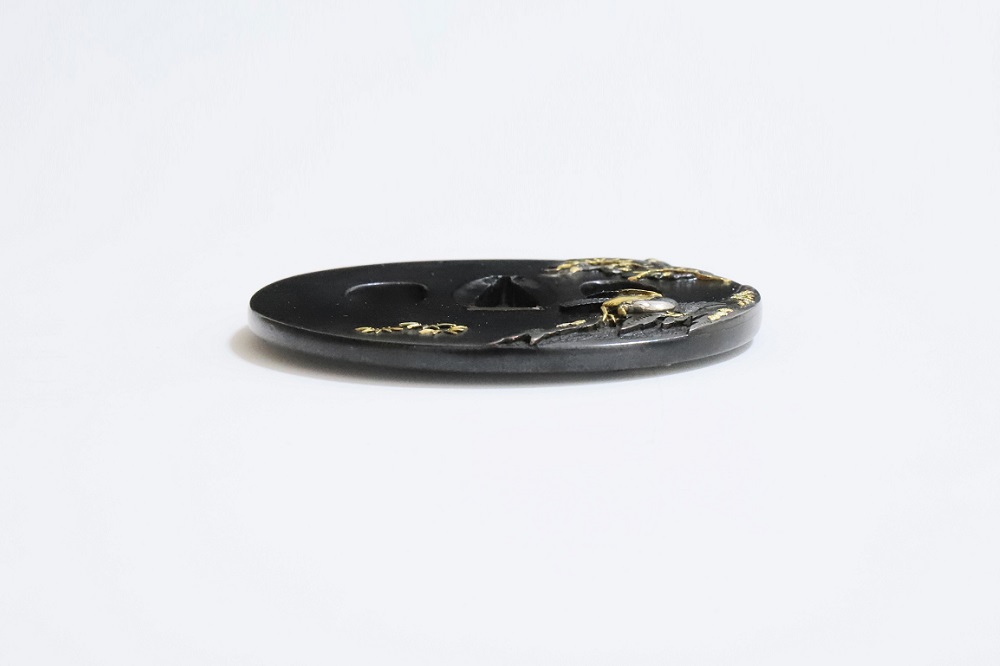 | 材質 | 赤銅荒し地 竪丸形 据紋象嵌色絵 角耳小肉 |