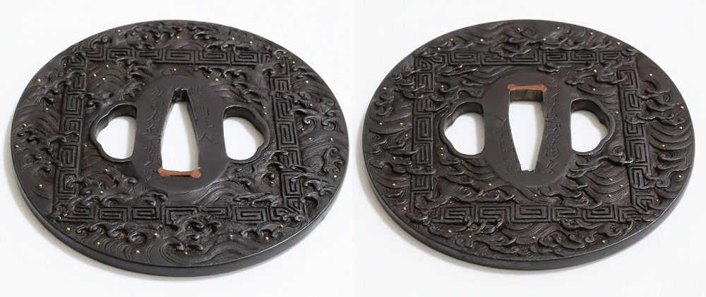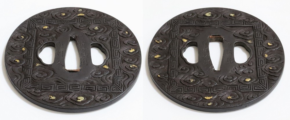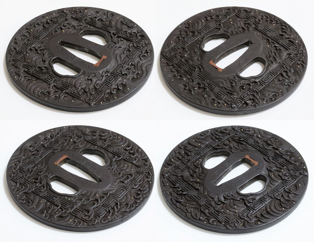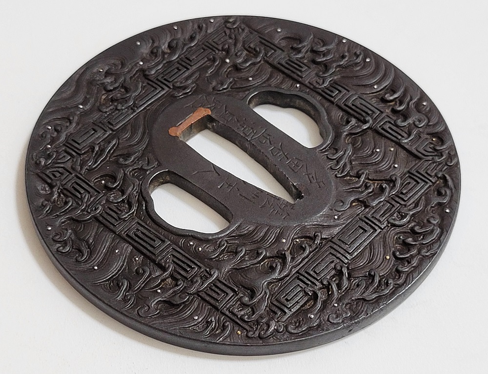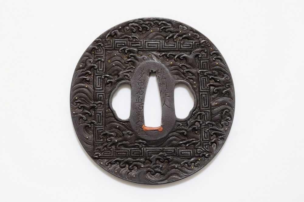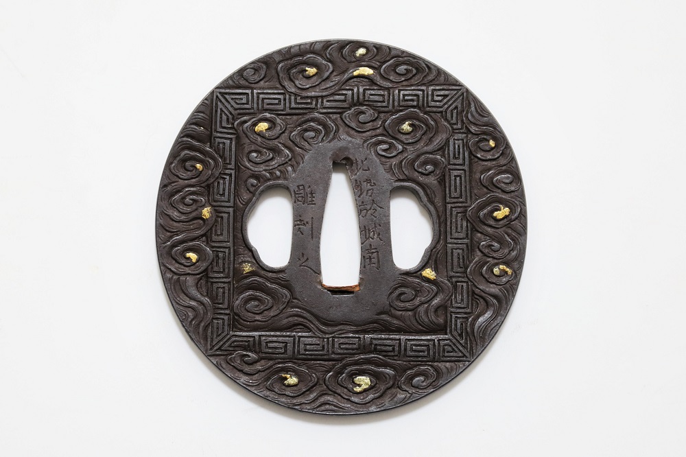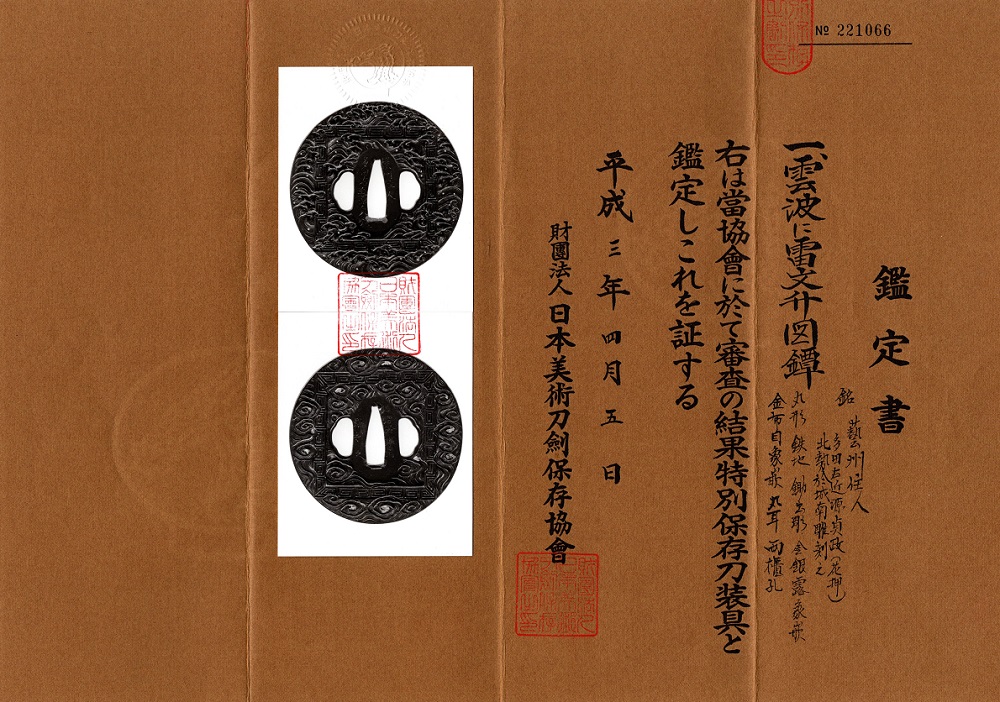 | 貞政は多田氏。右近といい源姓を称した。京都や北伊勢などの地方を遊歴し同地の添銘作を遺す。鉄地丸形に鋤出彫や肉彫の彫法で長州鐔似の作を得意とした。本作は、「芸州住人 多田右近源貞政(花押)・北勢於城南 彫刻之」と長銘。表波濤、裏瑞雲尽くしに表裏正方形の雷文を据え、見事な構図と技量の高さを示している。金工名鑑(小窪健一著)に所載される同工の代表作。特別保存刀装具。 |