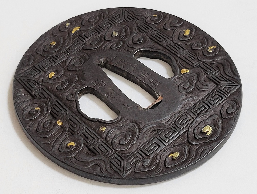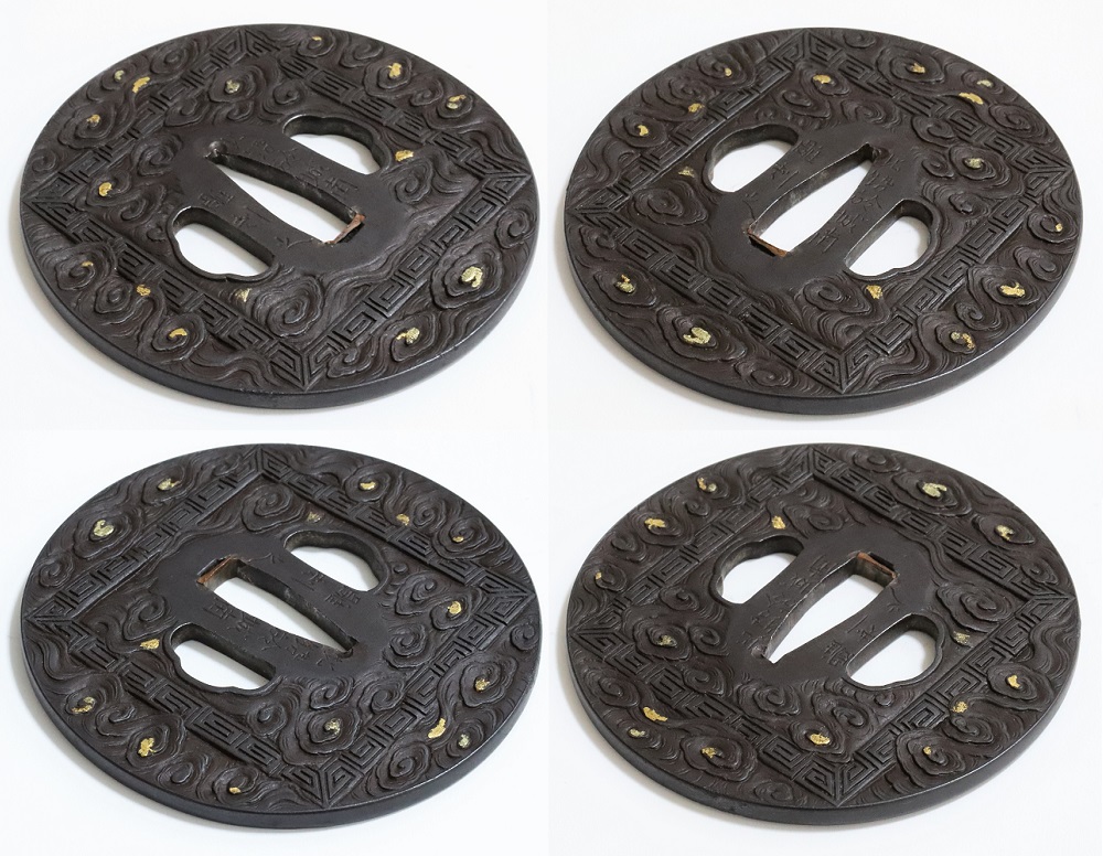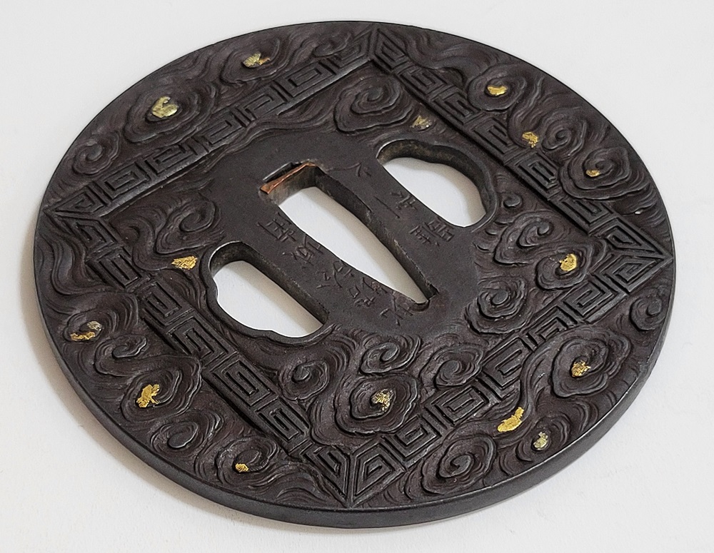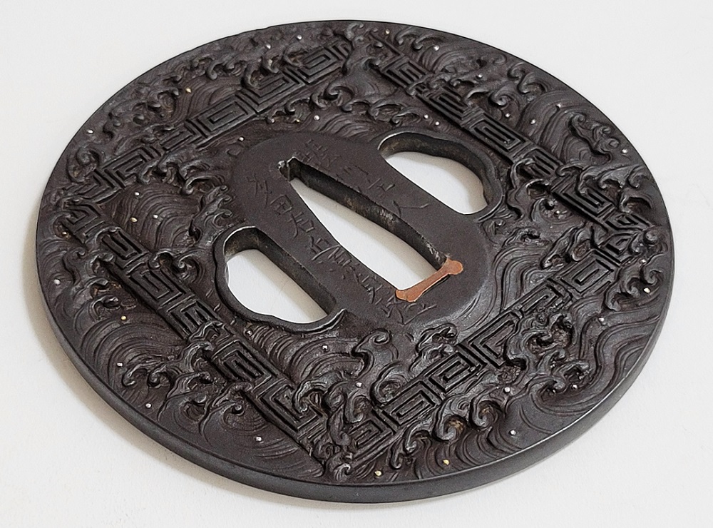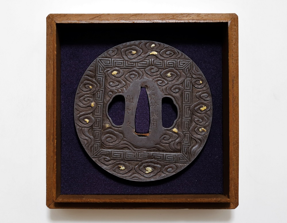 | 貞政は多田氏。右近といい源姓を称した。京都や北伊勢などの地方を遊歴し同地の添銘作を遺す。鉄地丸形に鋤出彫や肉彫の彫法で長州鐔似の作を得意とした。本作は、「芸州住人 多田右近源貞政(花押)・北勢於城南 彫刻之」と長銘。表波濤、裏瑞雲尽くしに表裏正方形の雷文を据え、見事な構図と技量の高さを示している。金工名鑑(小窪健一著)に所載される同工の代表作。特別保存刀装具。 |