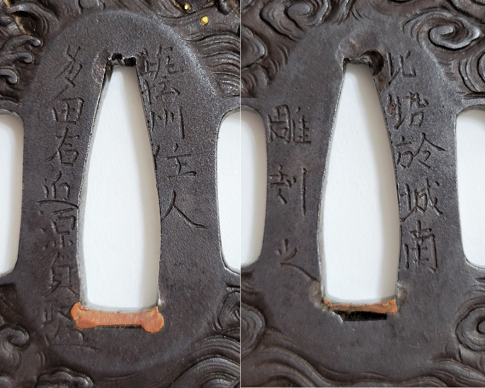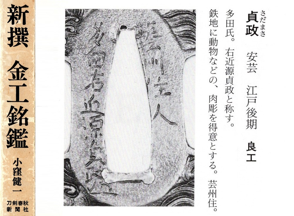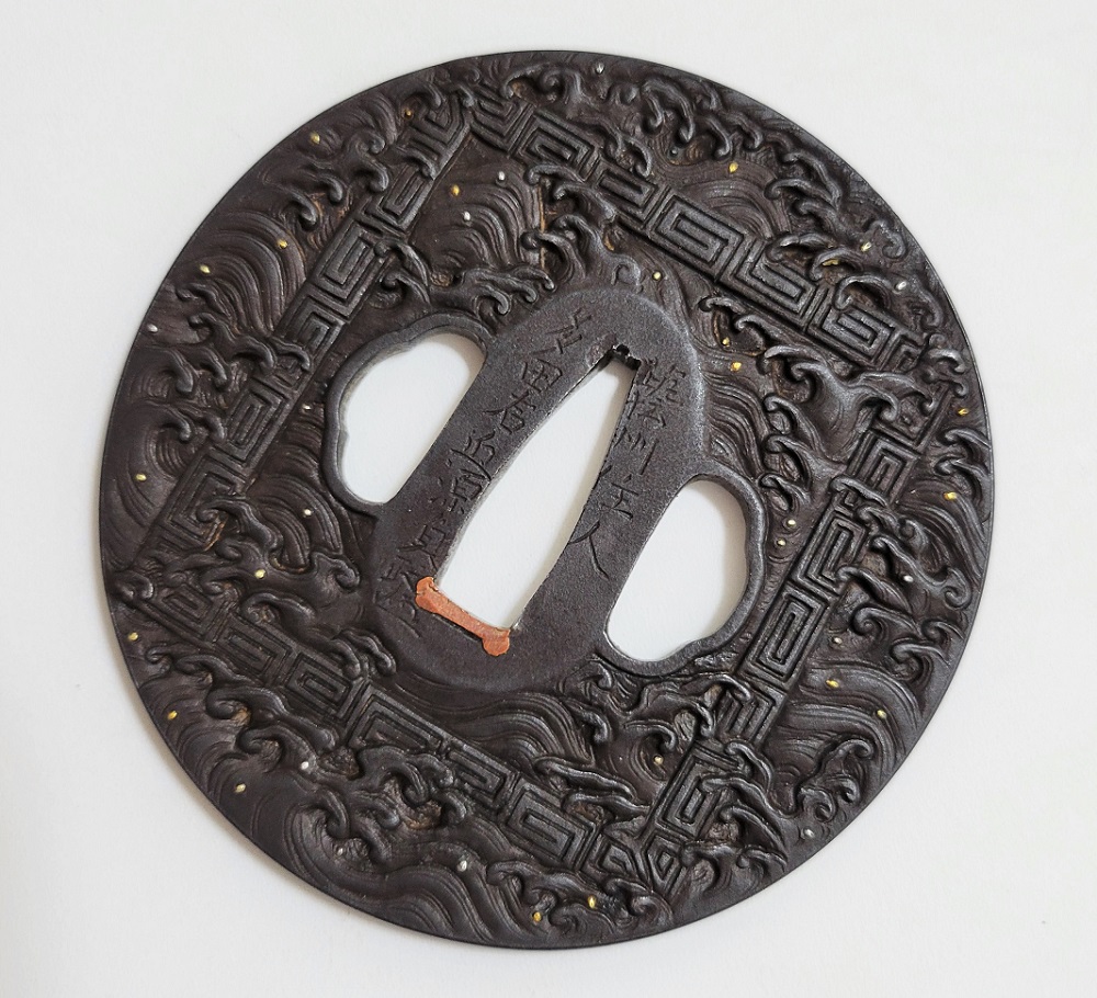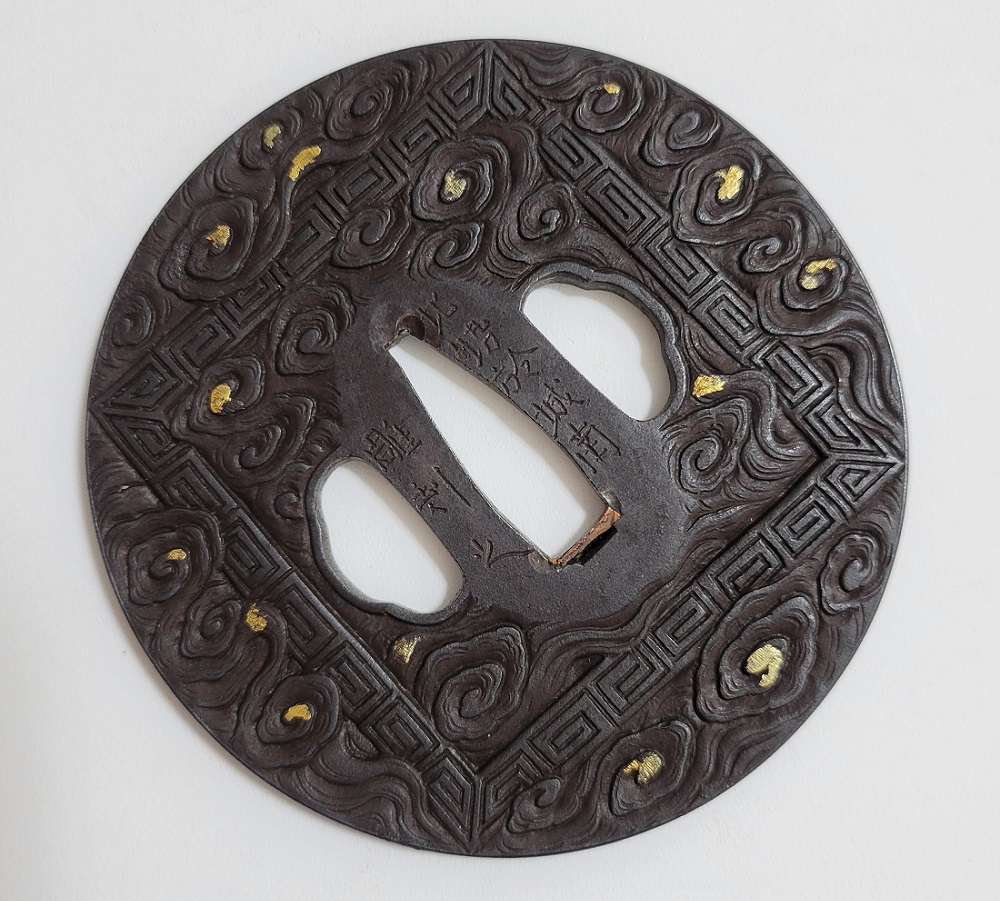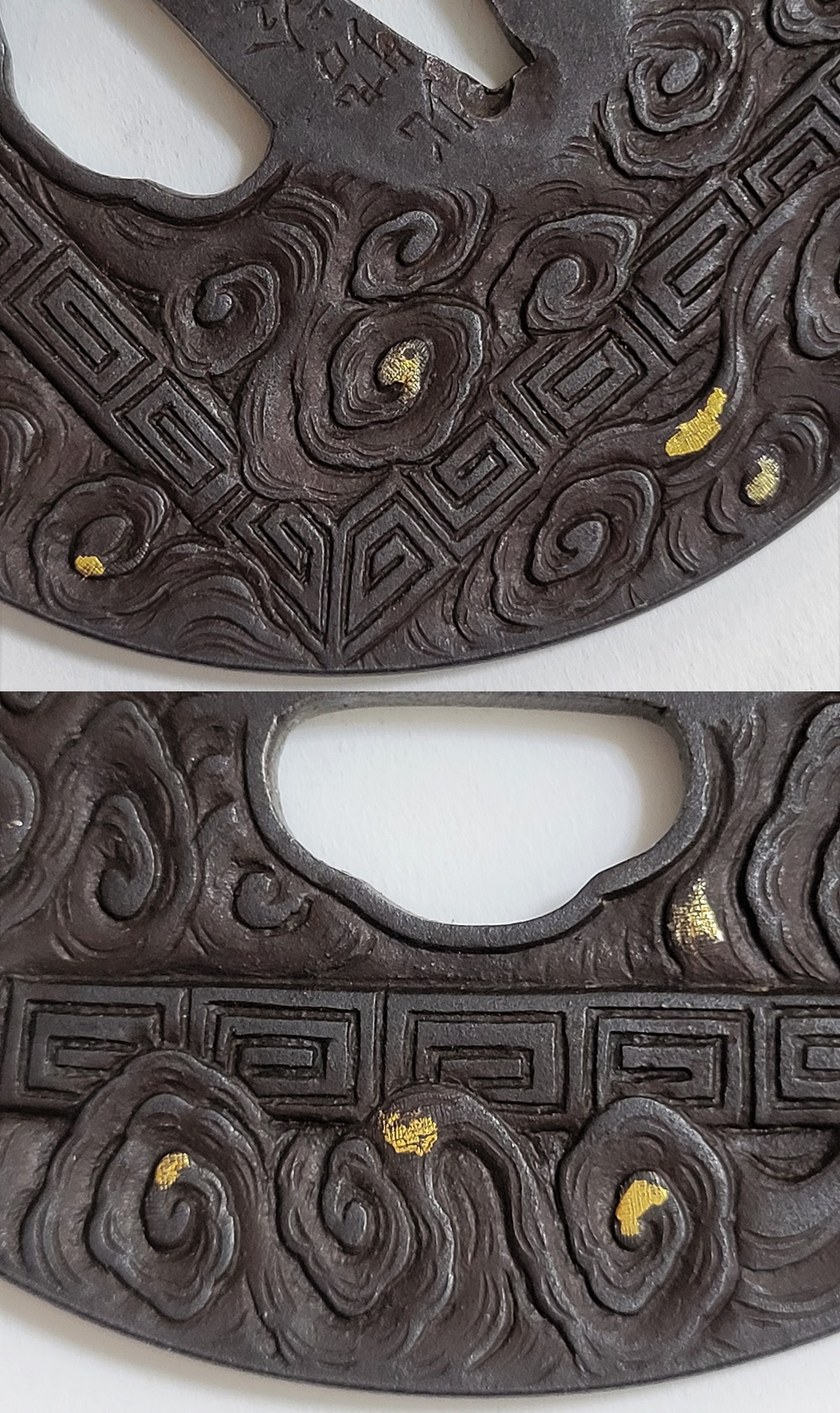 | 貞政は多田氏。右近といい源姓を称した。京都や北伊勢などの地方を遊歴し同地の添銘作を遺す。鉄地丸形に鋤出彫や肉彫の彫法で長州鐔似の作を得意とした。本作は、「芸州住人 多田右近源貞政(花押)・北勢於城南 彫刻之」と長銘。表波濤、裏瑞雲尽くしに表裏正方形の雷文を据え、見事な構図と技量の高さを示している。金工名鑑(小窪健一著)に所載される同工の代表作。特別保存刀装具。 |
