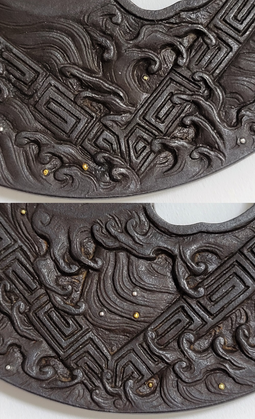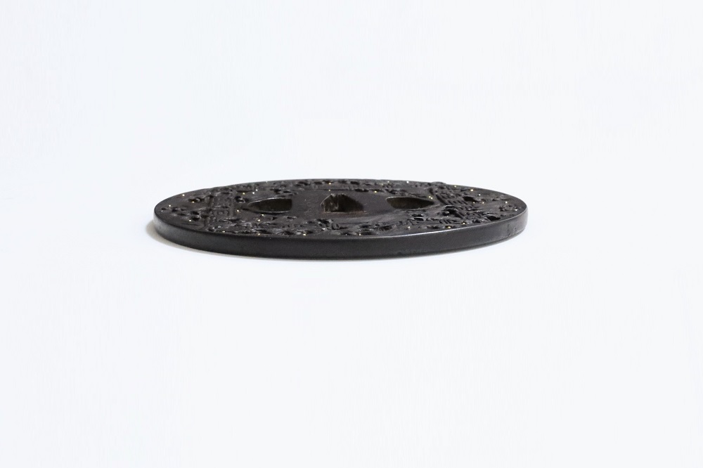 | 材質 | 鉄地 丸形 鋤出彫 金銀露象嵌 金布目象嵌 丸耳 両櫃孔 |