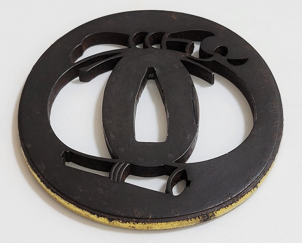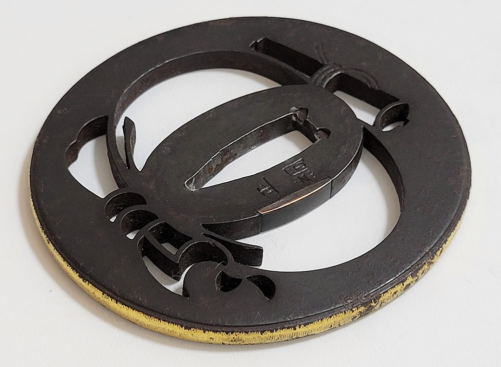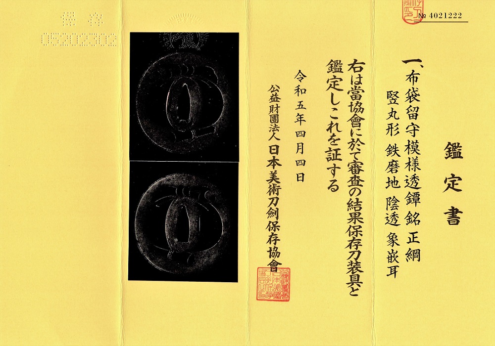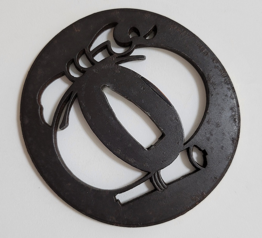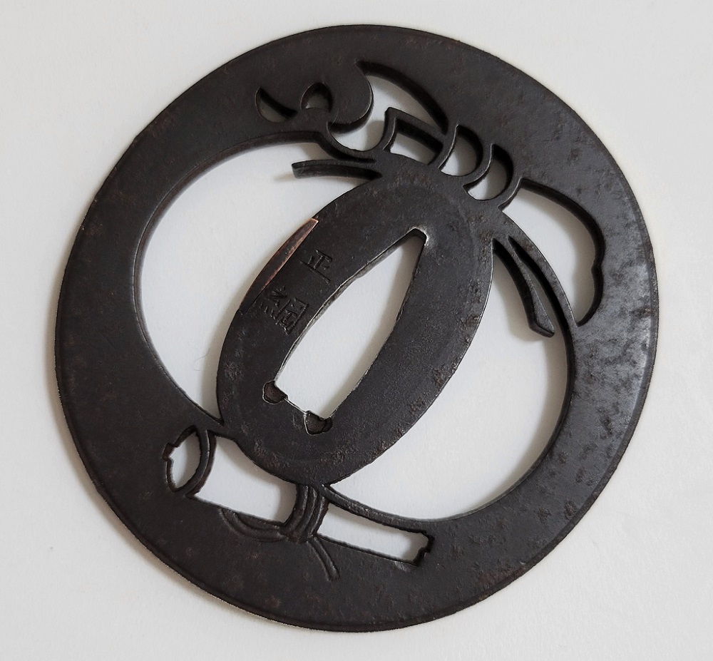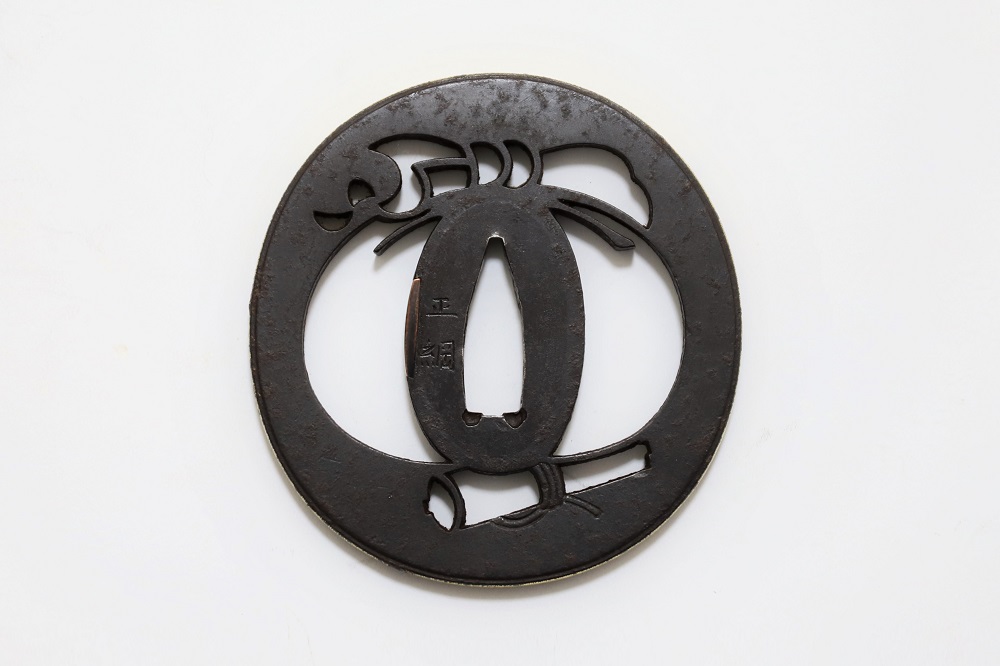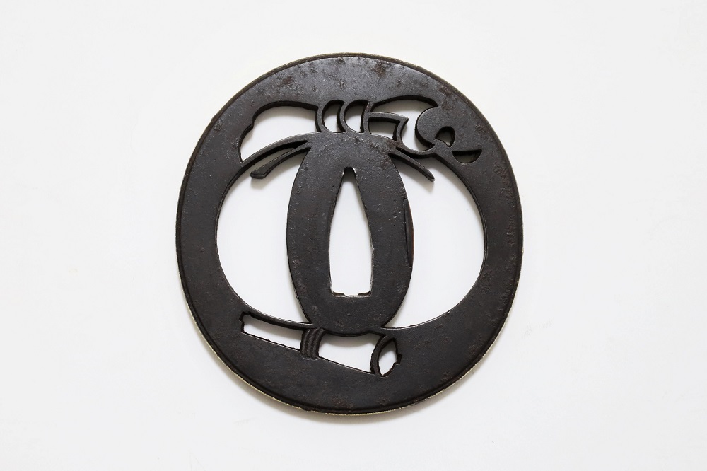 | 布袋は、唐代末から五代時代にかけて中国に実在したとされる伝説的な仏僧。太鼓腹で常に布の袋を背負っているため「布袋」と呼ばれた。広い度量や円満をあらわし、日本では富貴繁栄をつかさどる七福神の一神として信仰されている。本作は布袋(頭陀袋)と巻物の透図。巻物は経典を想像して仏僧を意味し、そして布袋で(仏僧の)布袋留守模様となる。正綱は江戸後期の武州伊藤派。機知に富む鐔。保存刀装具。 |