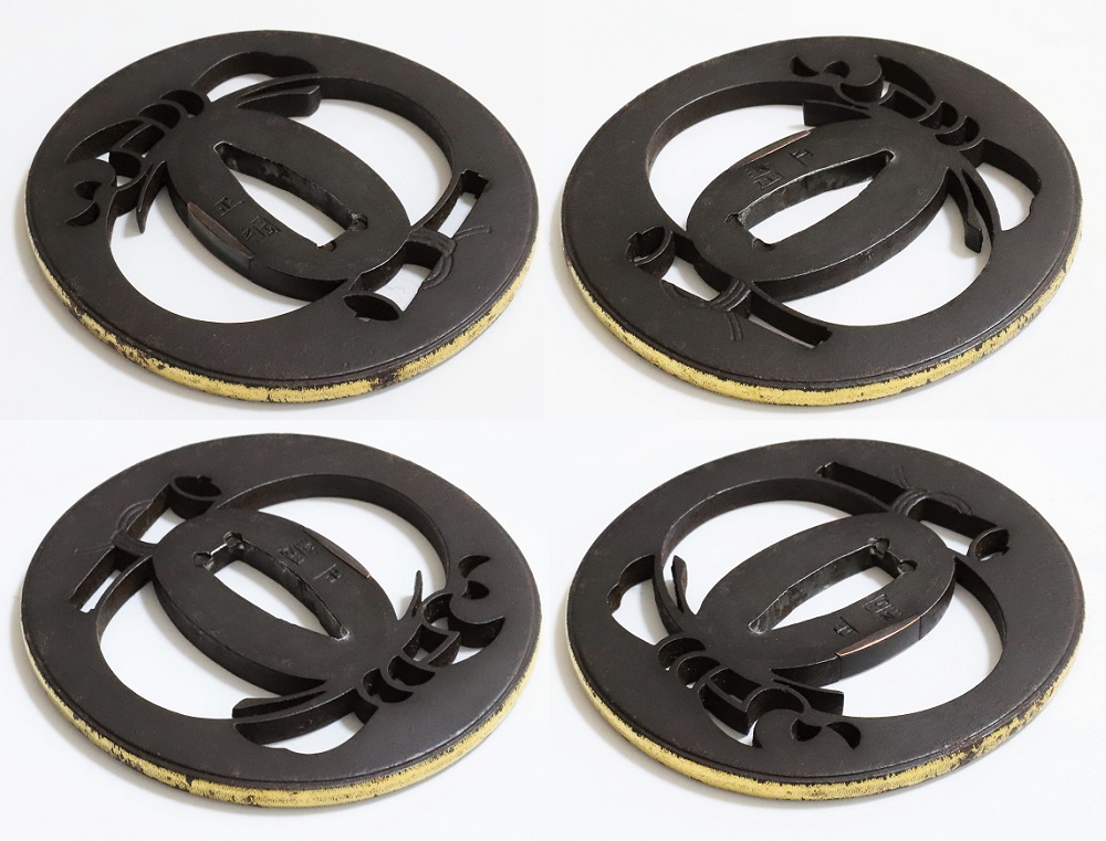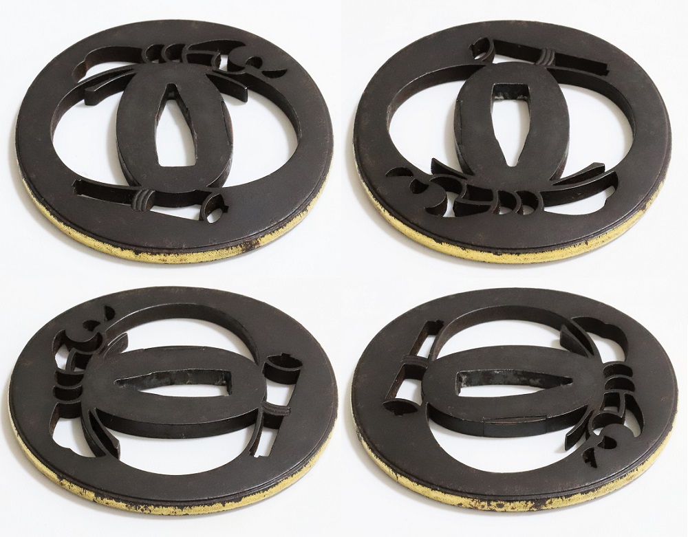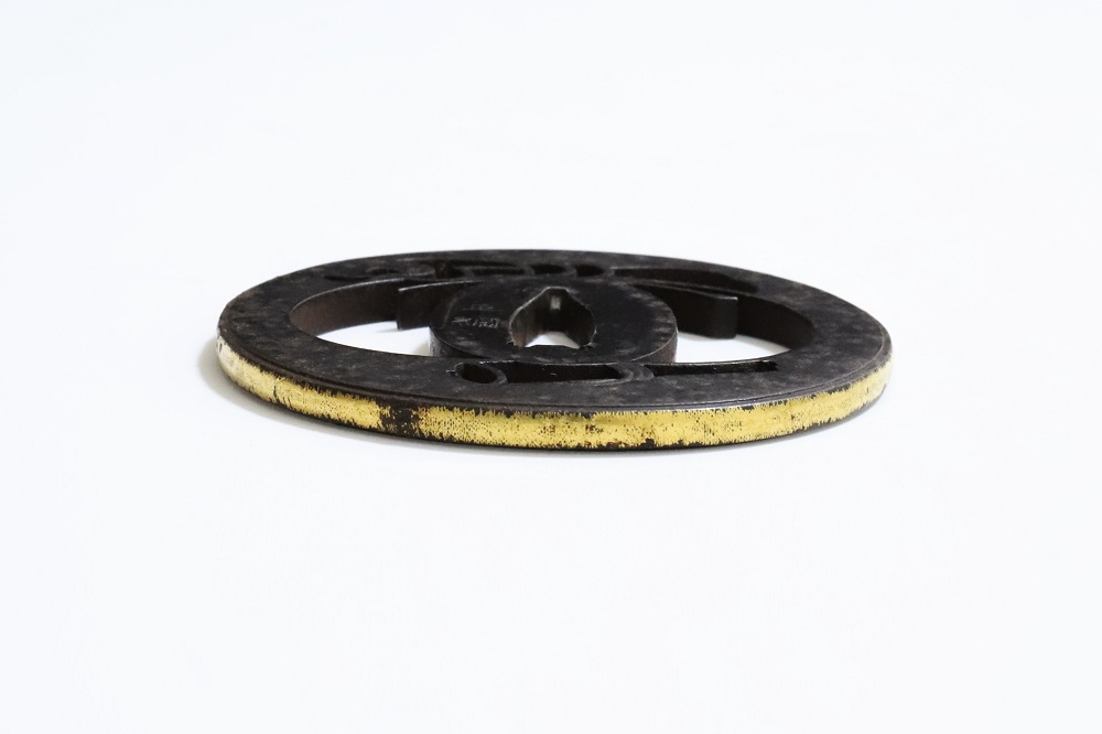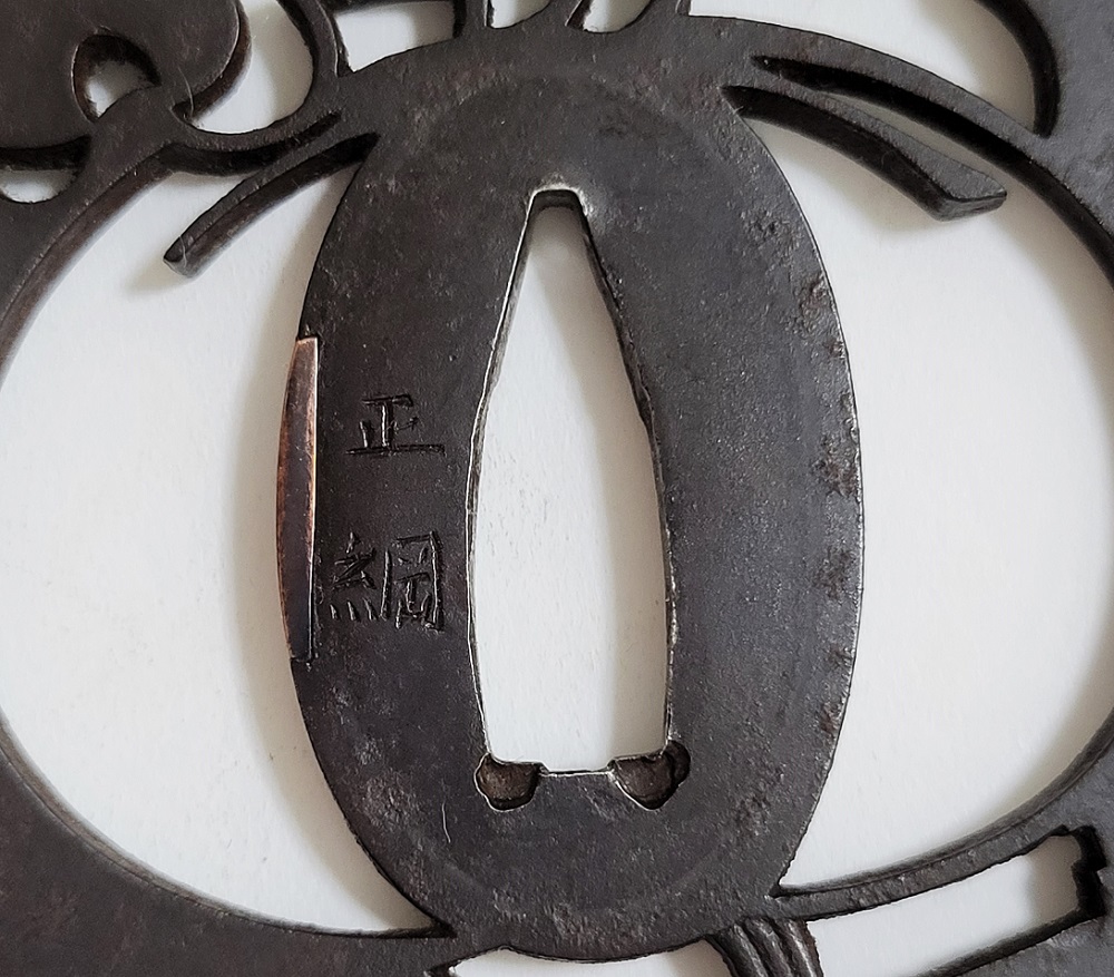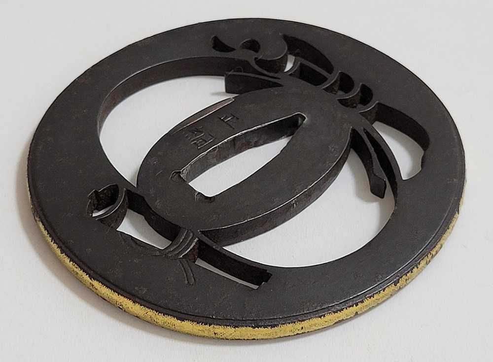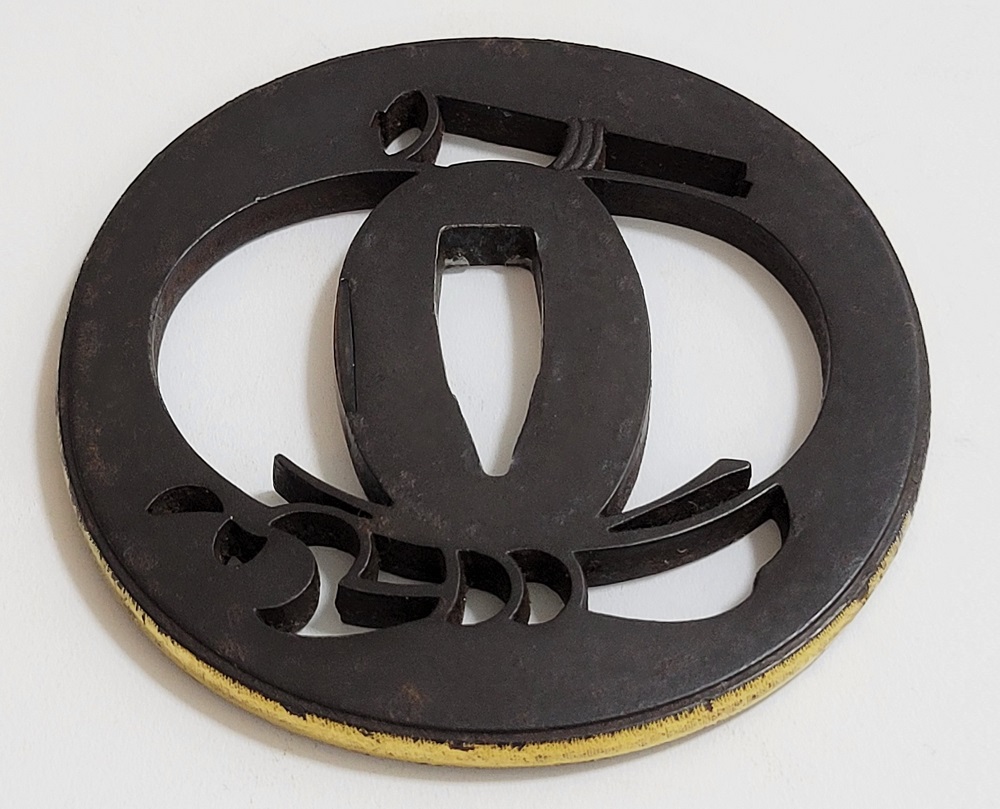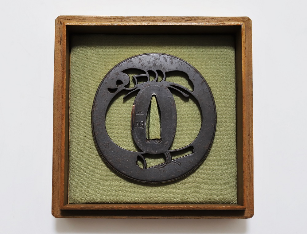 | 布袋は、唐代末から五代時代にかけて中国に実在したとされる伝説的な仏僧。太鼓腹で常に布の袋を背負っているため「布袋」と呼ばれた。広い度量や円満をあらわし、日本では富貴繁栄をつかさどる七福神の一神として信仰されている。本作は布袋(頭陀袋)と巻物の透図。巻物は経典を想像して仏僧を意味し、そして布袋で(仏僧の)布袋留守模様となる。正綱は江戸後期の武州伊藤派。機知に富む鐔。保存刀装具。 |