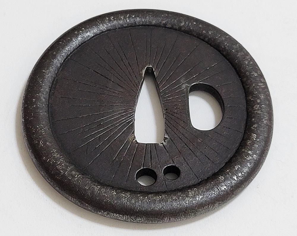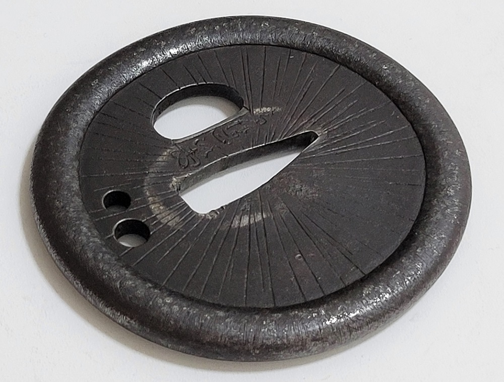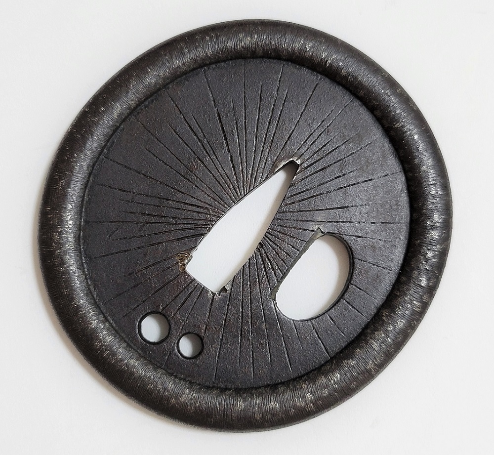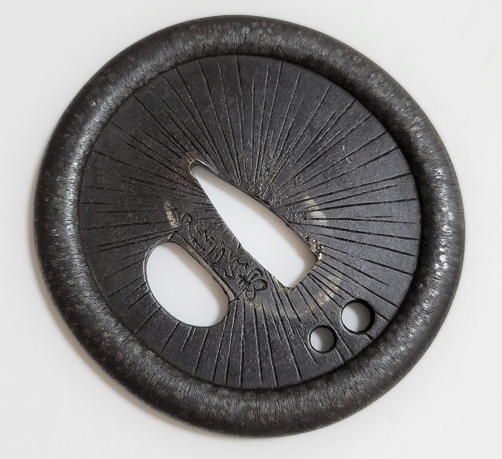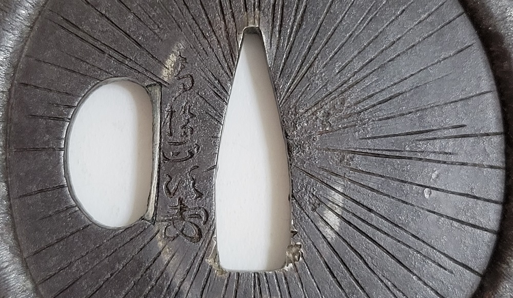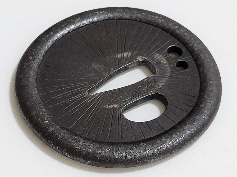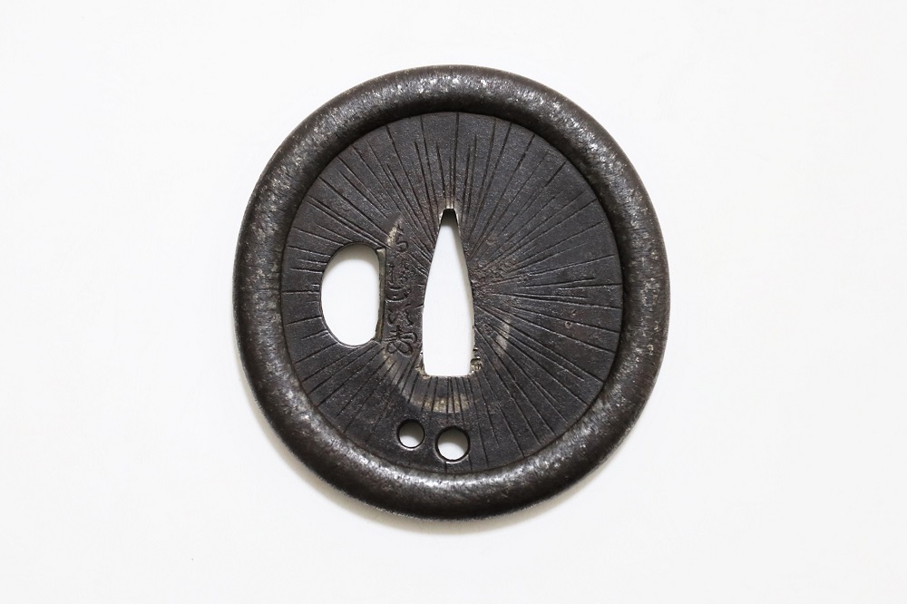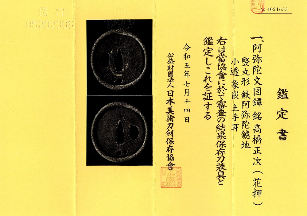 土手耳全体に鑢目を入れ銀布目象嵌を施し、平地には阿弥陀鑢を刻して腕抜孔を小透す。作者の高橋正次は赤尾吉次の門人。高橋家を成し「次」を通字(とおりじ)として、一族には寿次、家次、興次、吉次がいる。ぐり彫と肉彫地透の工法が得意で銘は草書体と楷書体がある。本作は特徴的な草書体銘。5月刀装具審査で保存合格。
