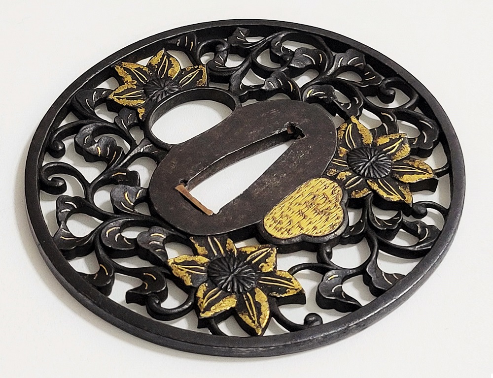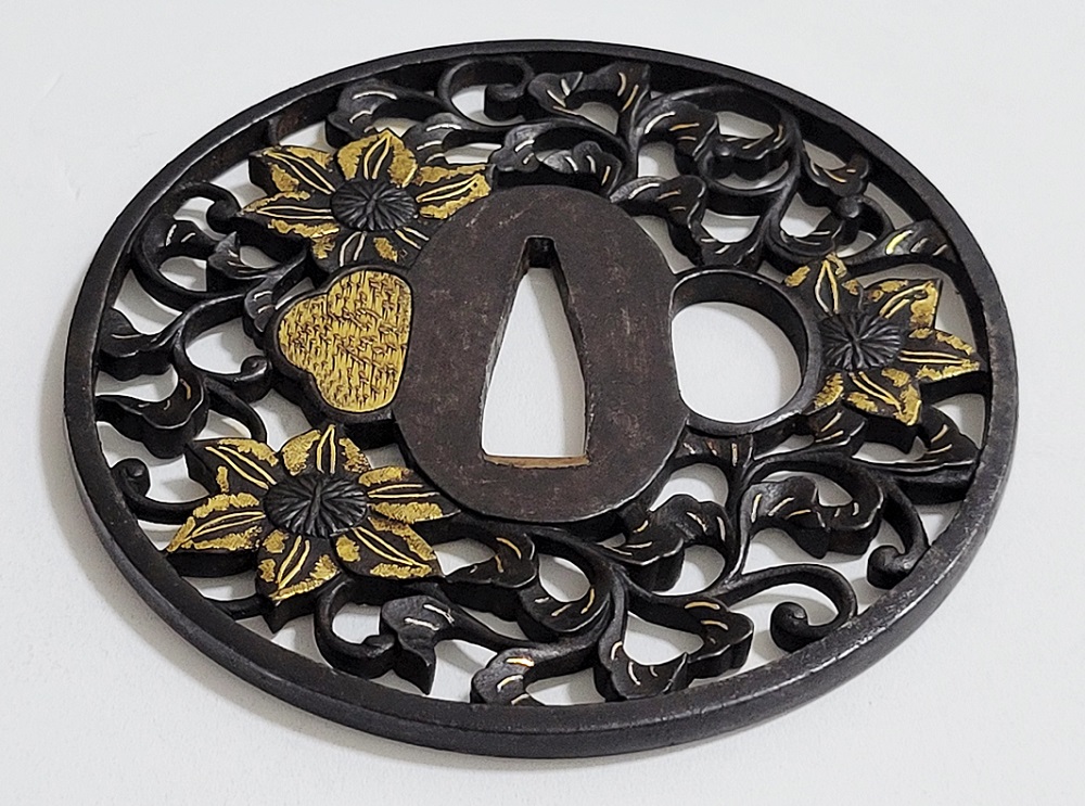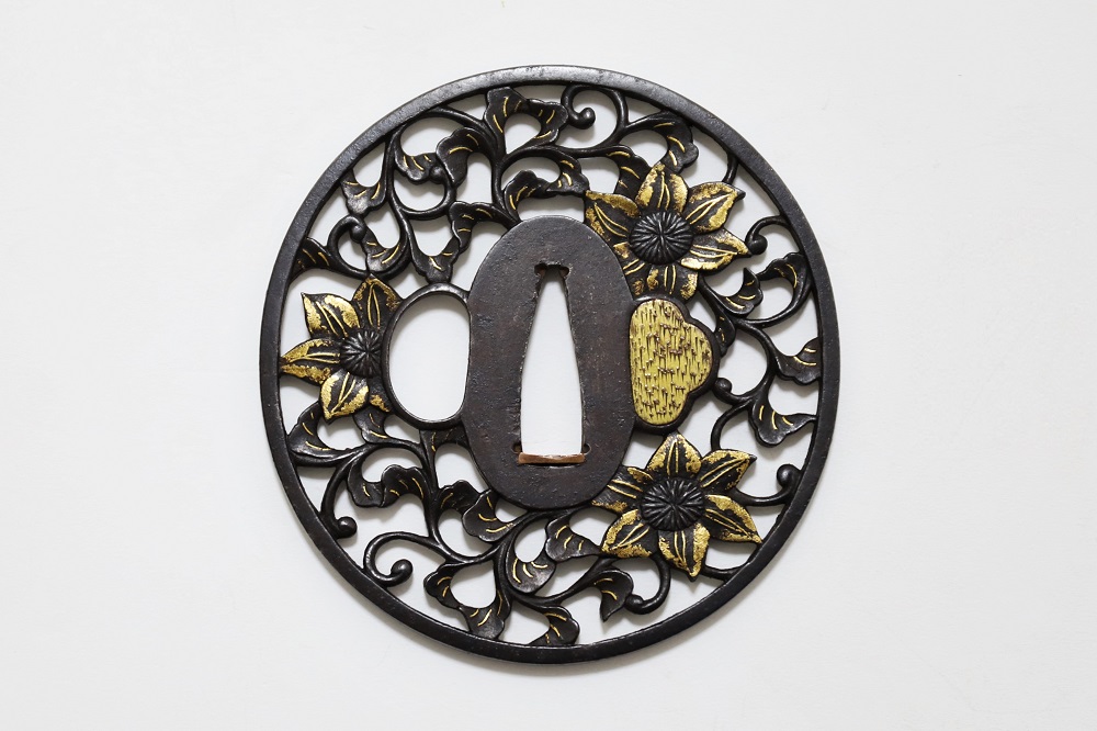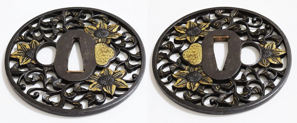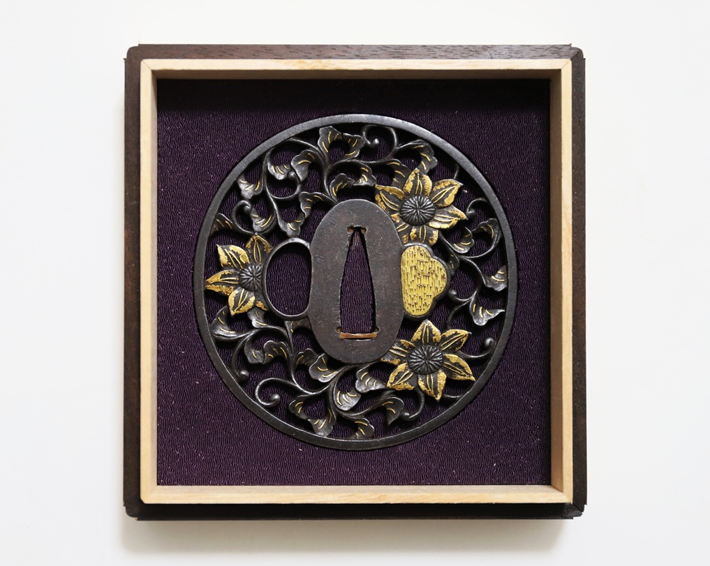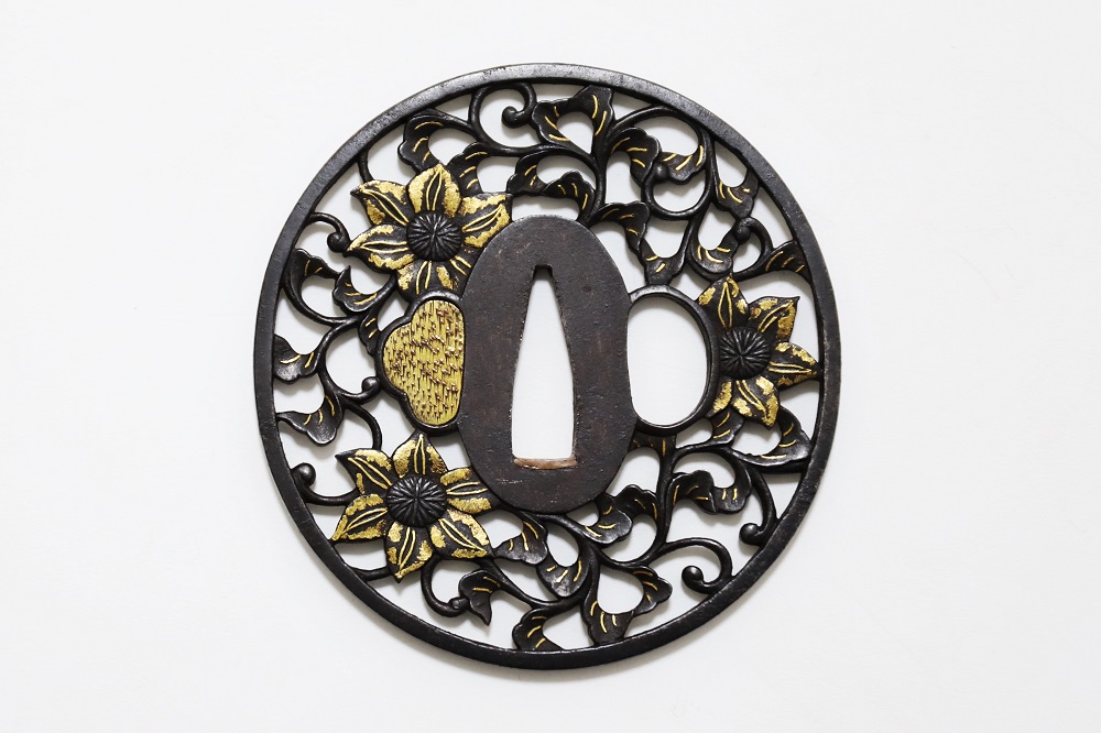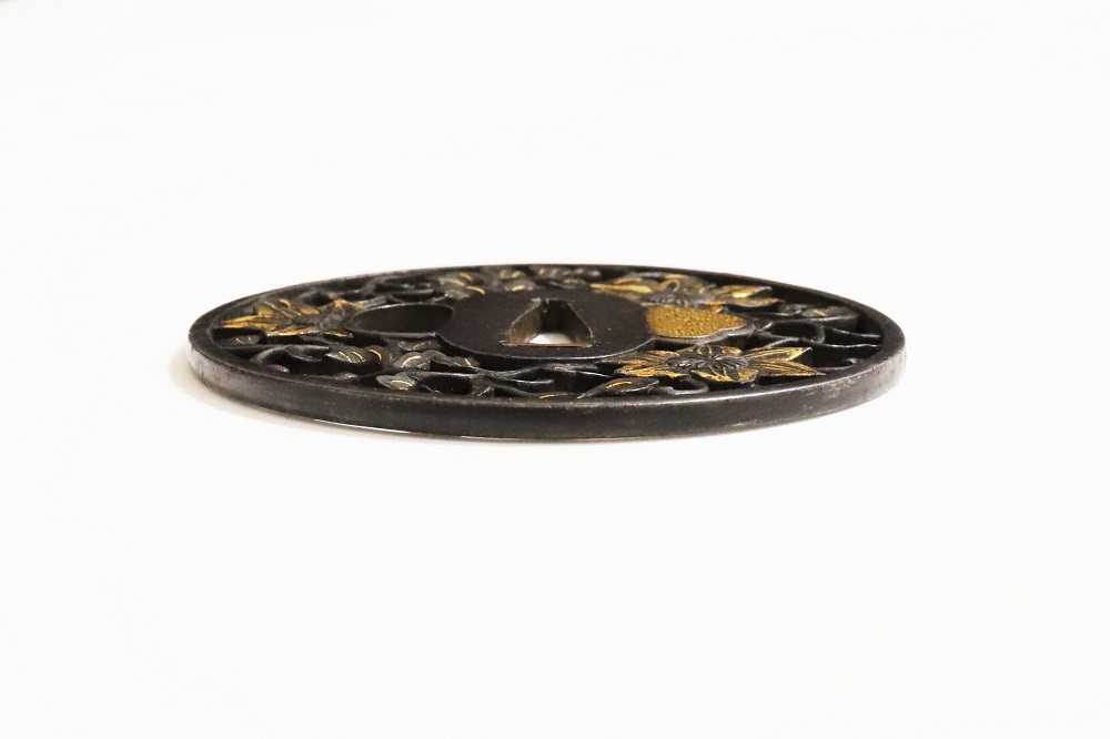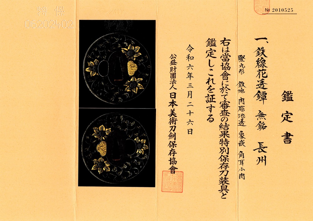 毛利家を藩主とする長州藩は、多くの鐔工を抱えて財政を潤すべく積極的に作鐔をおこない他国に鐔を供給。長州鐔は拵に用いて釣合いよく広く一般に愛好された。河治、中井、岡本の三家が主流をなし繁栄した。特徴は鉄を磨仕上げとし密画風に画面一杯綿密に山水、草花図を肉彫地透し象嵌を施す。本作は2024年2月審査で「長州」に極められ特別保存合格。精巧優美な鐔。
