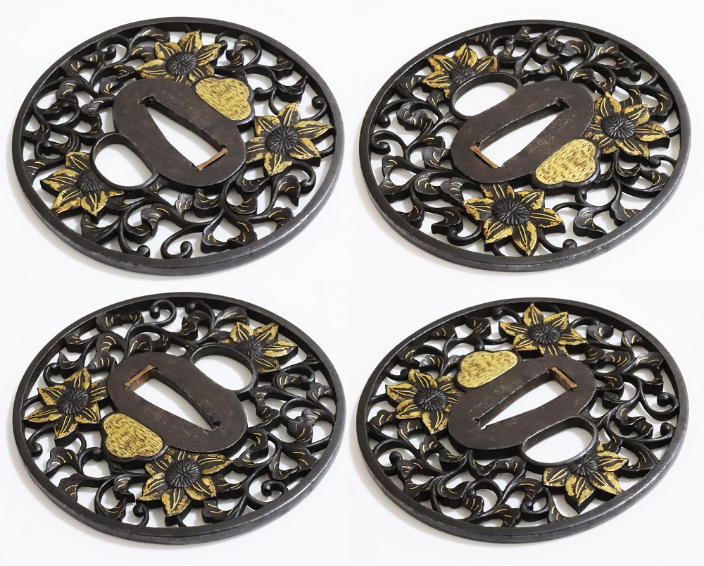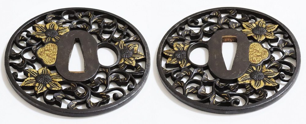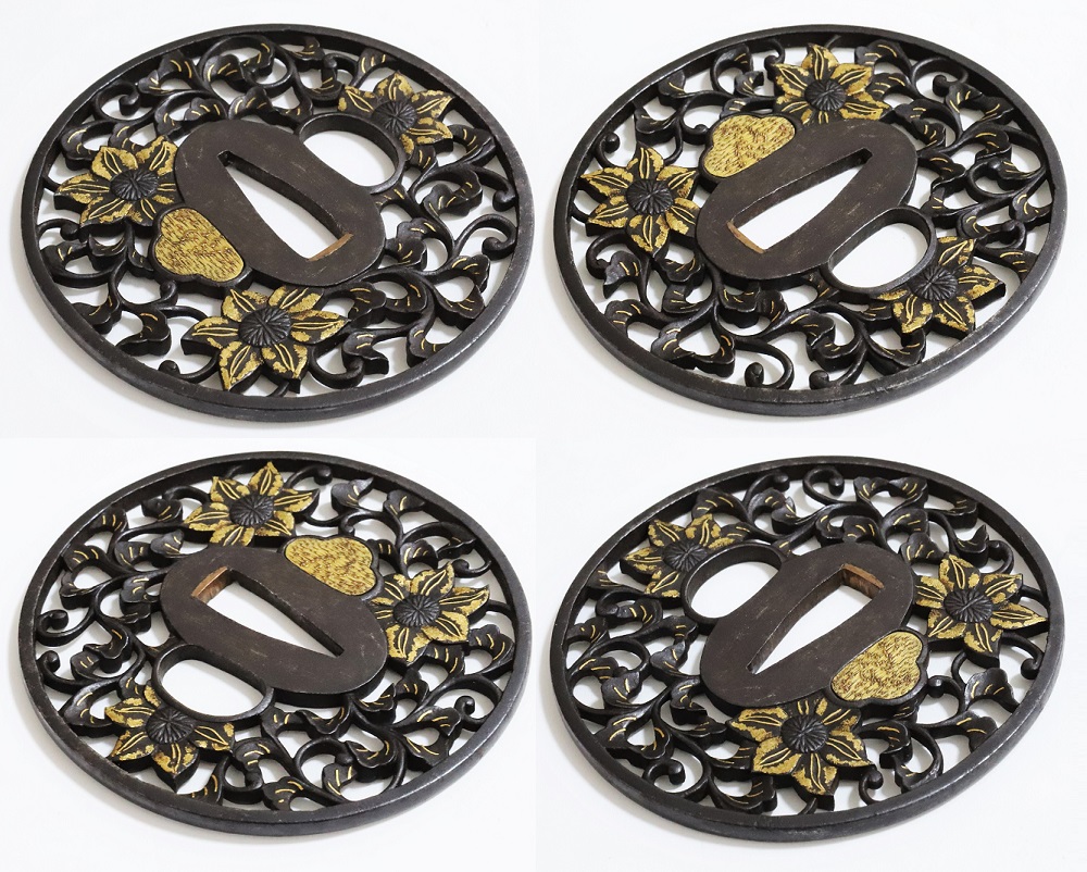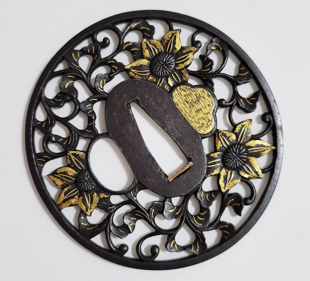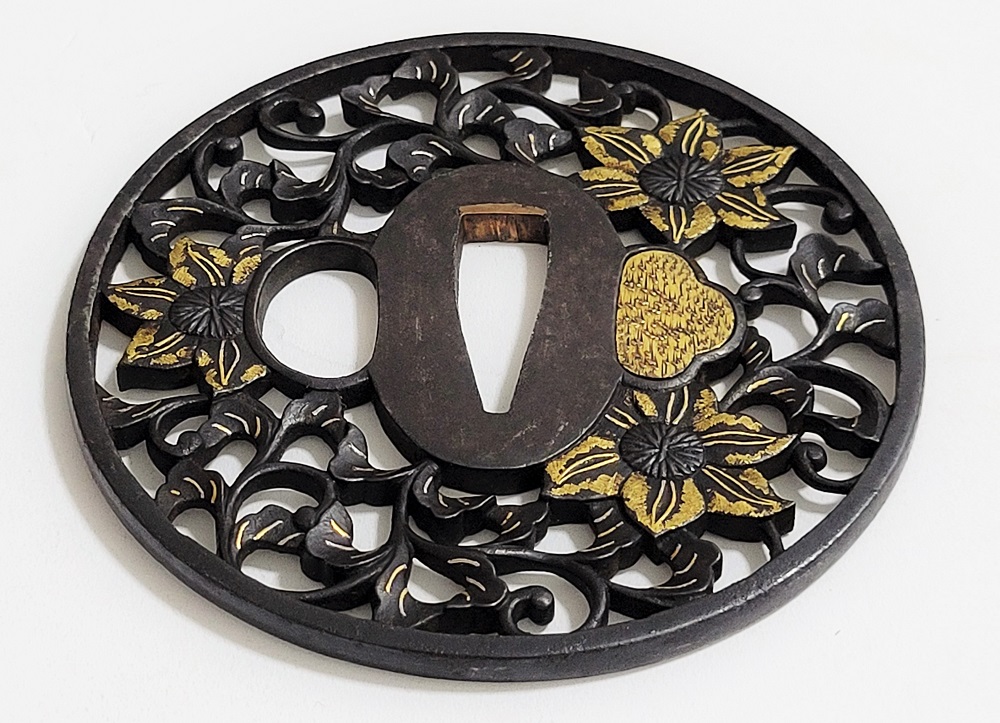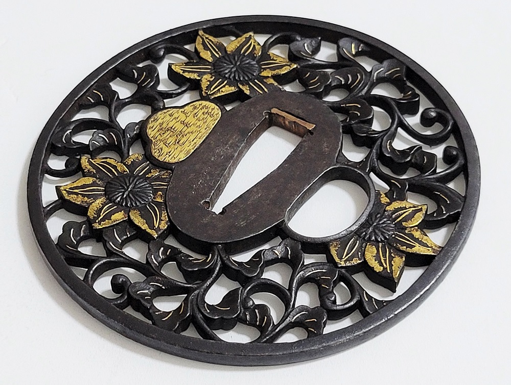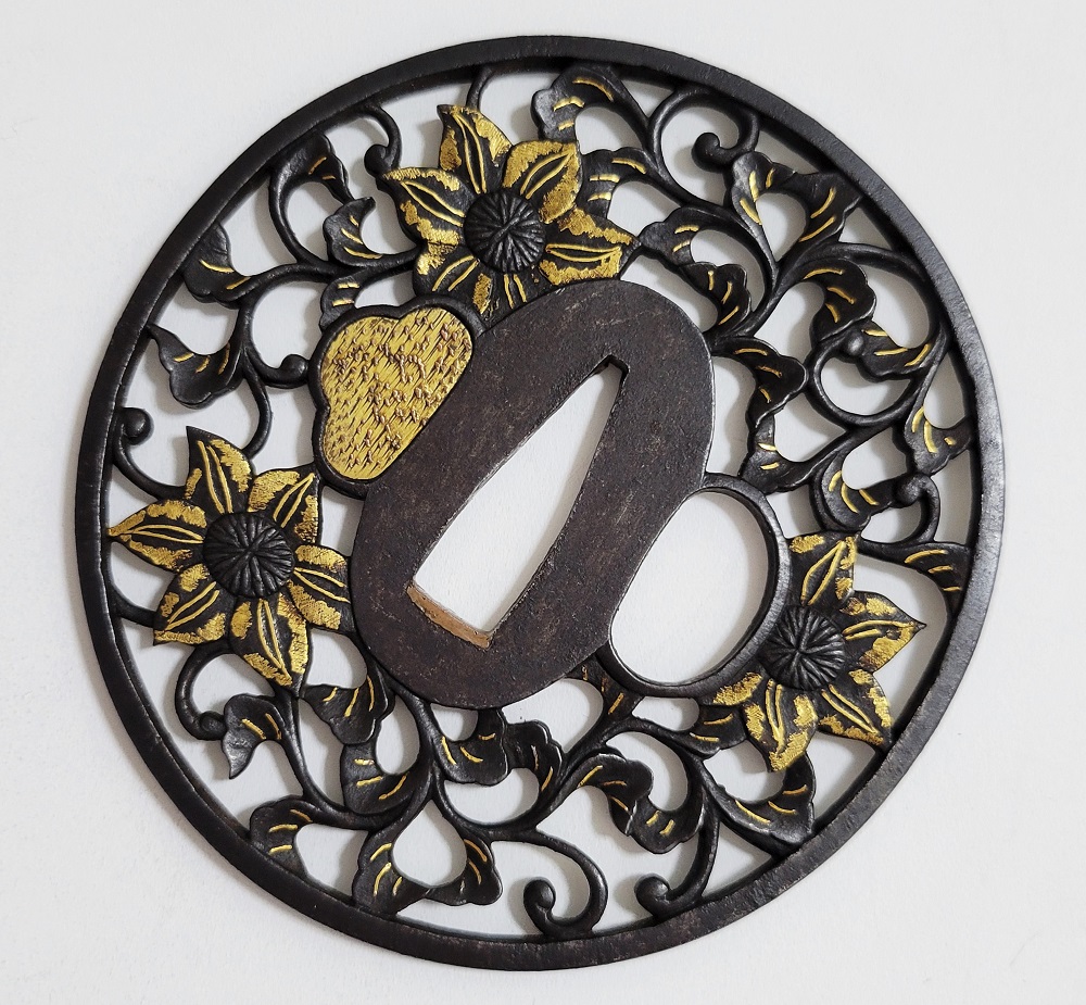 毛利家を藩主とする長州藩は、多くの鐔工を抱えて財政を潤すべく積極的に作鐔をおこない他国に鐔を供給。長州鐔は拵に用いて釣合いよく広く一般に愛好された。河治、中井、岡本の三家が主流をなし繁栄した。特徴は鉄を磨仕上げとし密画風に画面一杯綿密に山水、草花図を肉彫地透し象嵌を施す。本作は2024年2月審査で「長州」に極められ特別保存合格。精巧優美な鐔。