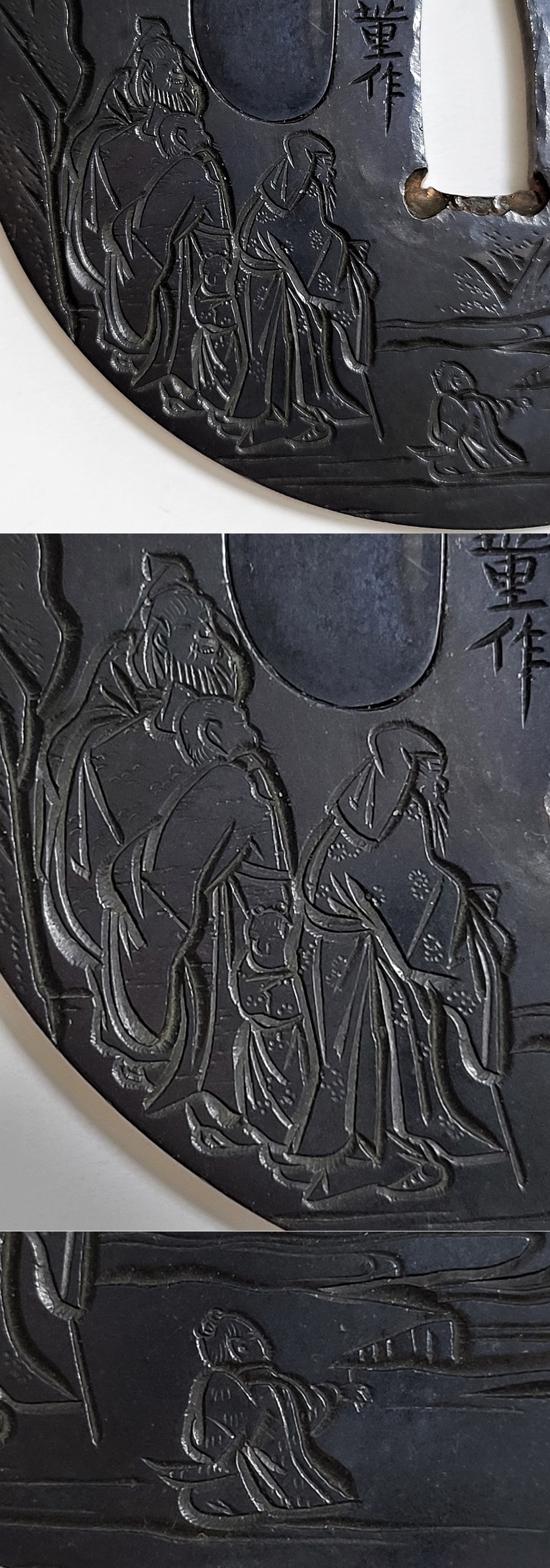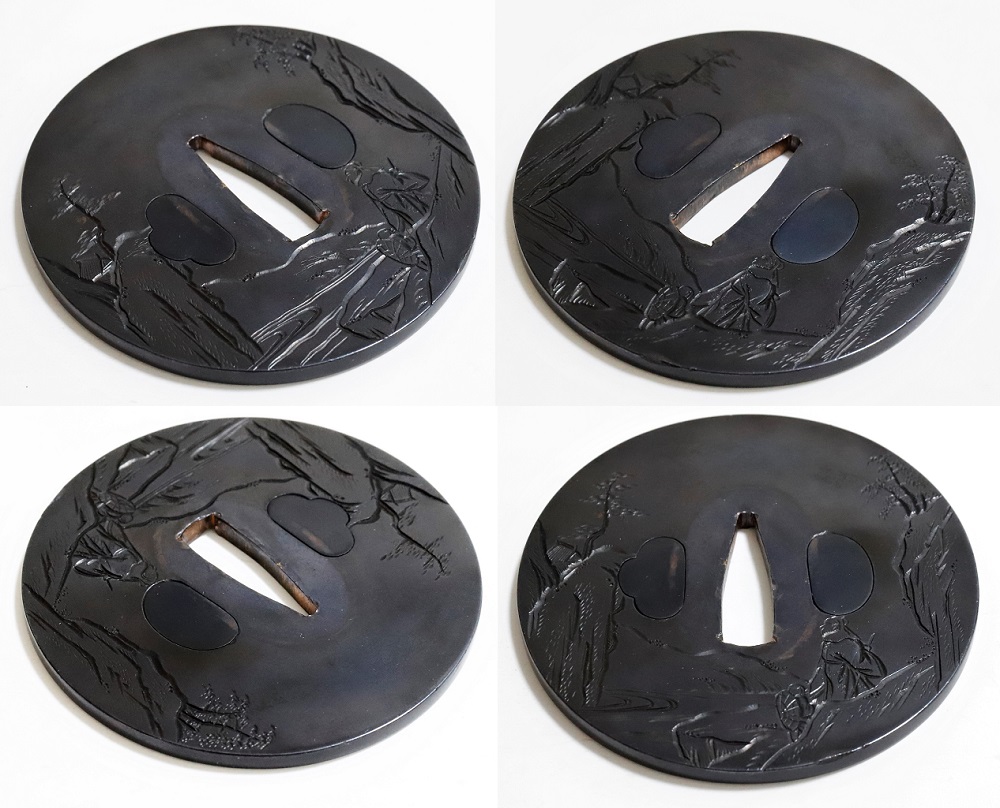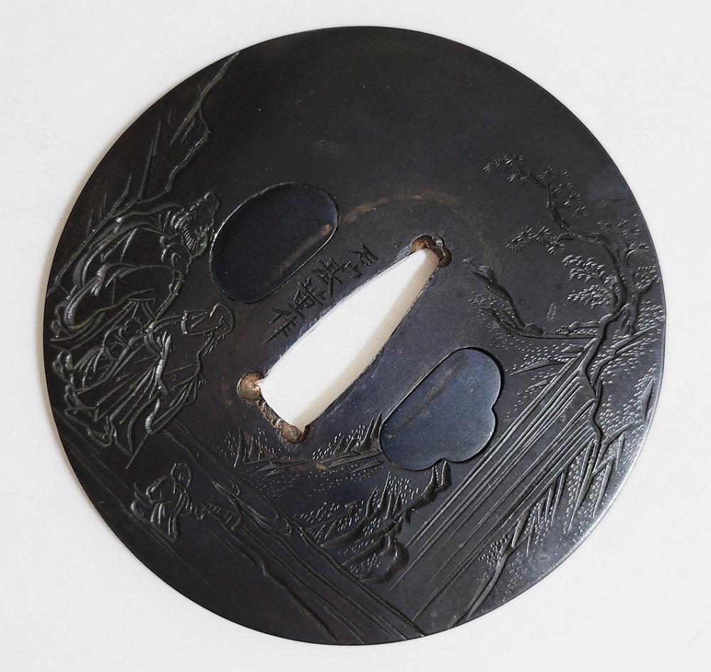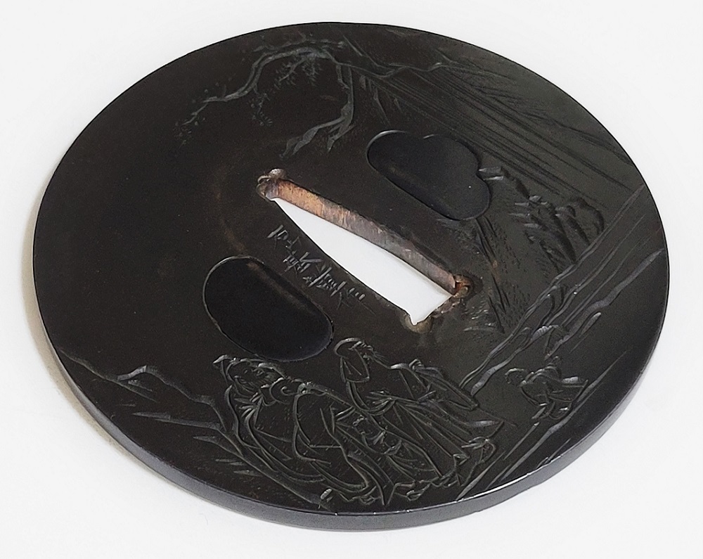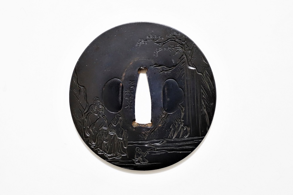 | 石山基董(もとただ/きとう)は江戸中期、山城国、従三位壬生基起の次男。寛文十二年(1672)生、享保十九年(1734)没。権中納言従二位に叙され彫金、連歌、絵画に秀でていた。本作は赤銅磨地に巧みな片切毛彫で高士観瀑図を描いている。 |
