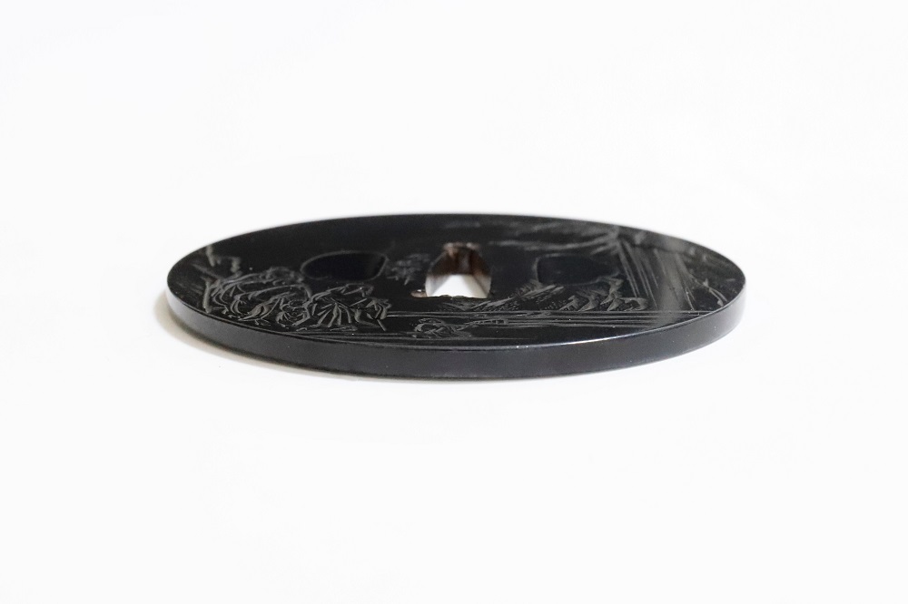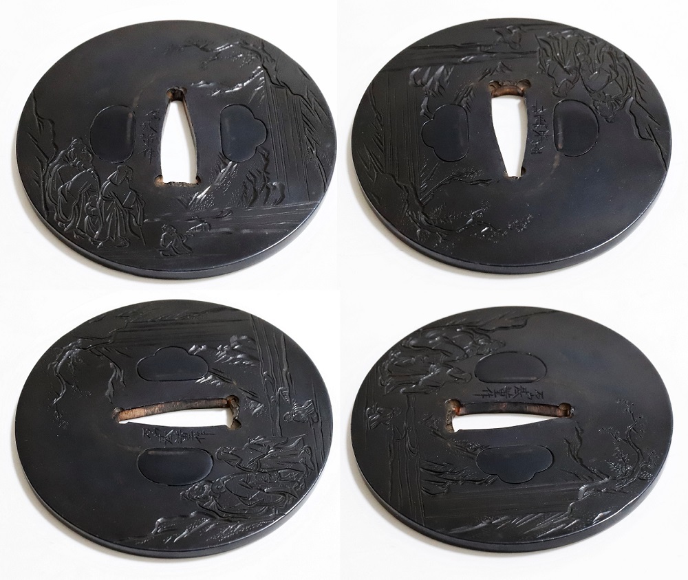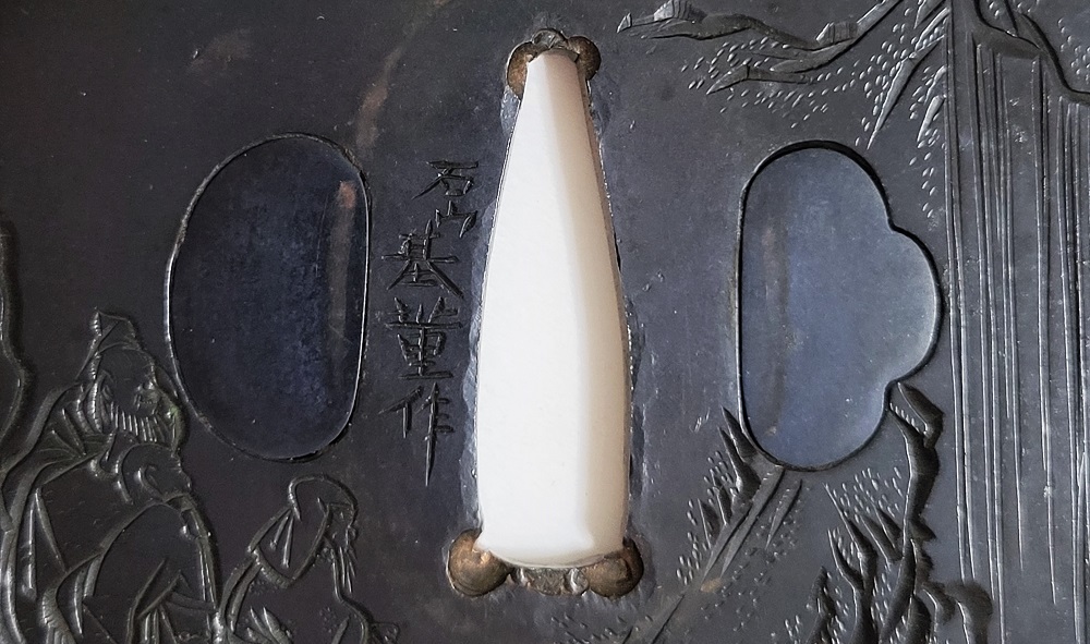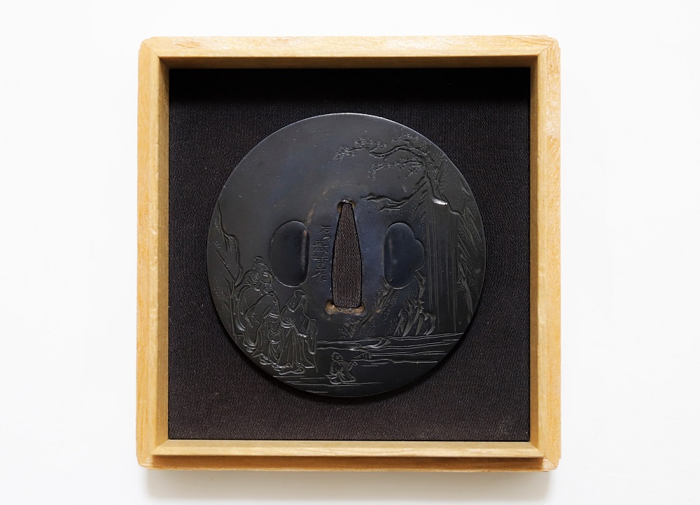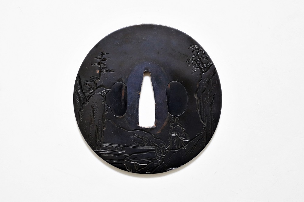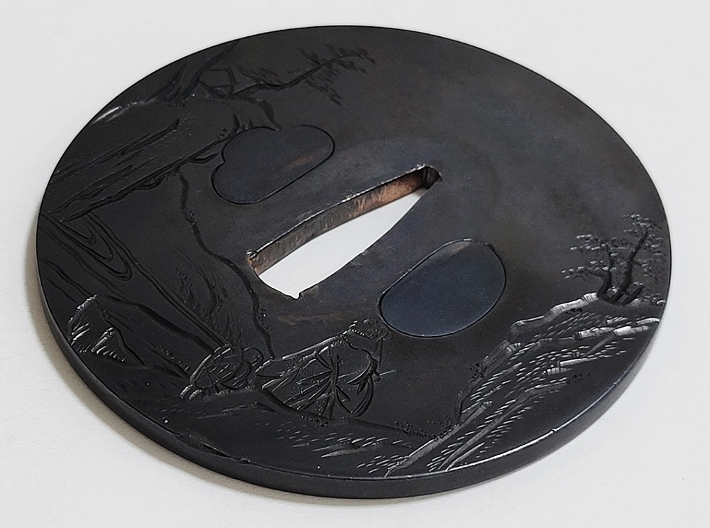 | 石山基董(もとただ/きとう)は江戸中期、山城国、従三位壬生基起の次男。寛文十二年(1672)生、享保十九年(1734)没。権中納言従二位に叙され彫金、連歌、絵画に秀でていた。本作は赤銅磨地に巧みな片切毛彫で高士観瀑図を描いている。 |