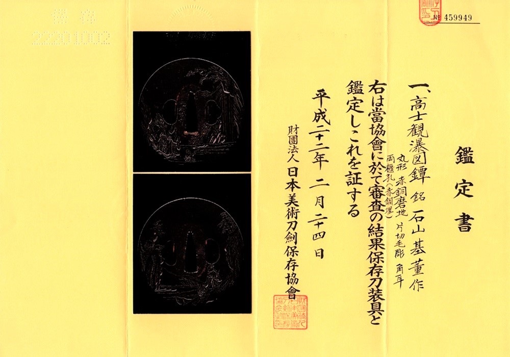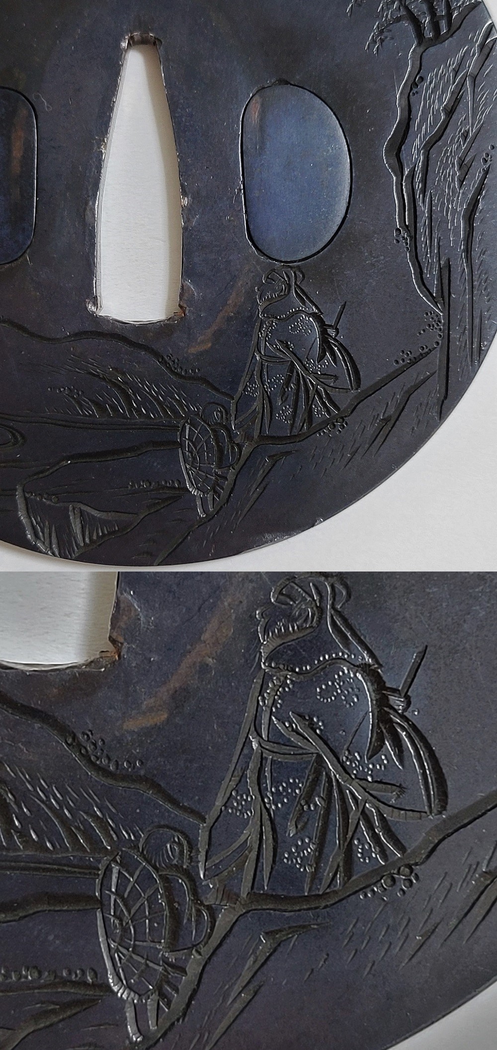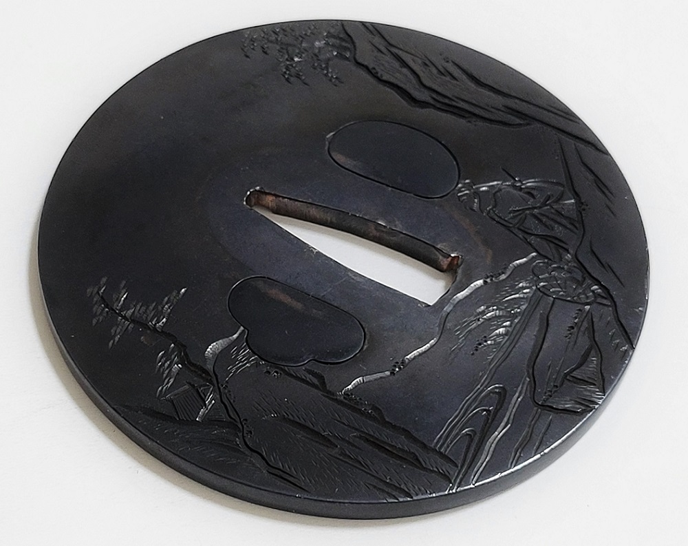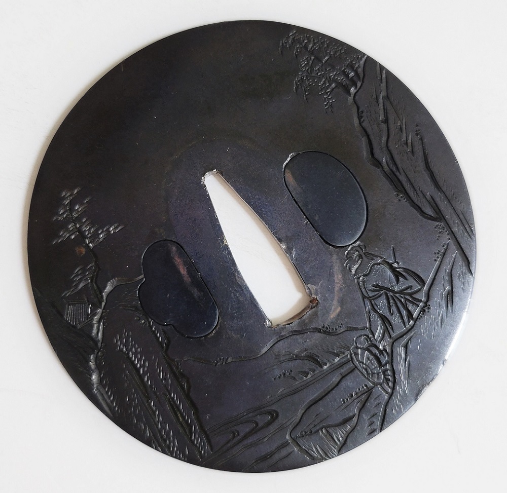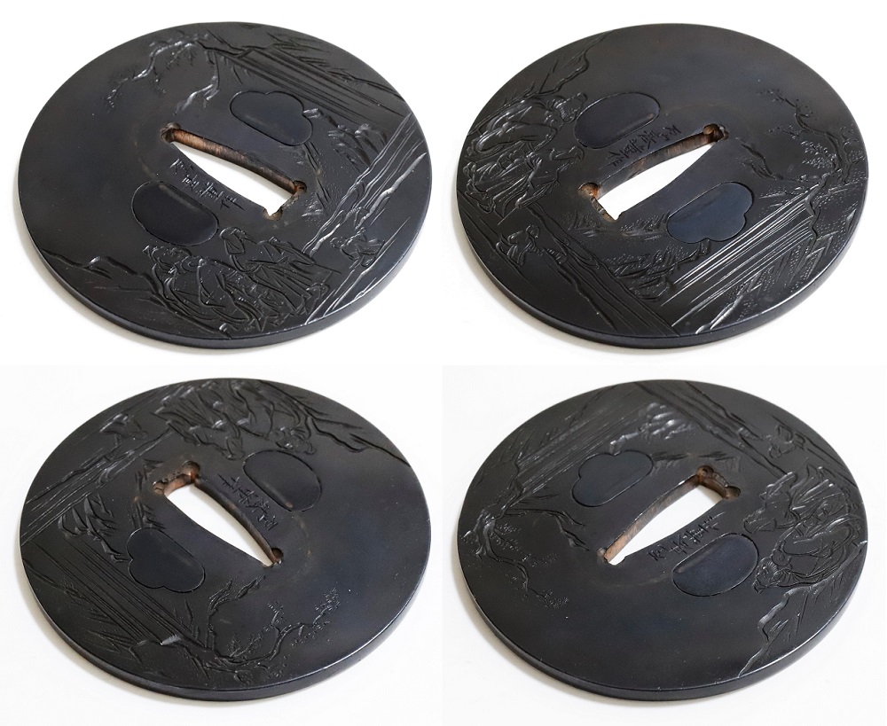 | 石山基董(もとただ/きとう)は江戸中期、山城国、従三位壬生基起の次男。寛文十二年(1672)生、享保十九年(1734)没。権中納言従二位に叙され彫金、連歌、絵画に秀でていた。本作は赤銅磨地に巧みな片切毛彫で高士観瀑図を描いている。 |