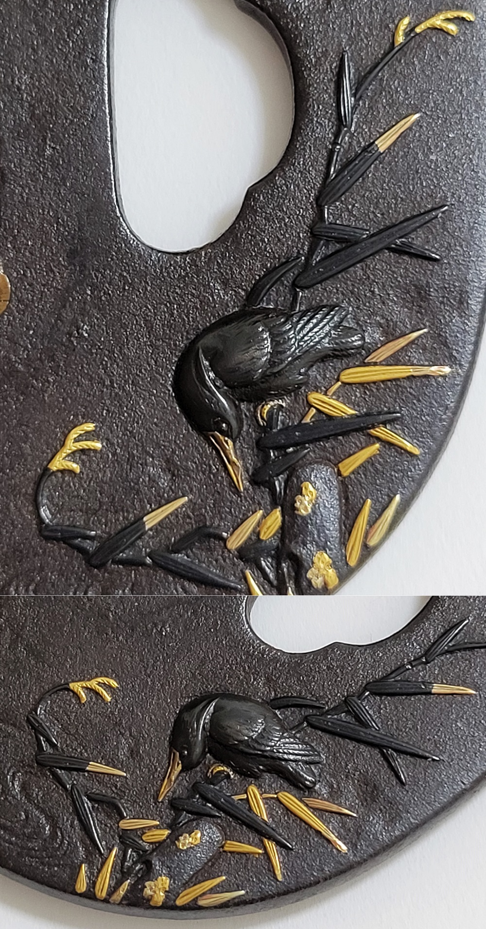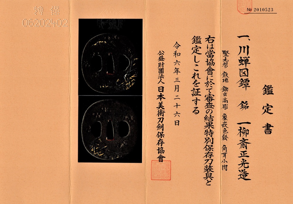 | 川蝉は、清流に棲む水辺鳥。長い嘴(くちばし)で水に飛び込んで魚を獲って食べる。狙った獲物は逃さないことから目標達成や望みが叶う縁起の良い鳥として画題になった。正光は、江戸末期の会津を代表する名工。江戸石黒風の作風が見受けられ石黒政常に学んだと考えられる。風景動植物図を精巧な高彫色絵や鋤出彫、据紋高彫色絵などの技法で忠実にあらわす。2024年2月審査で特別保存合格。 |
