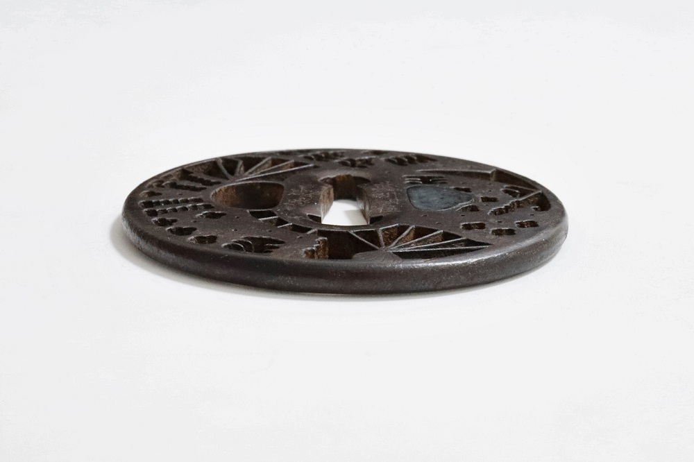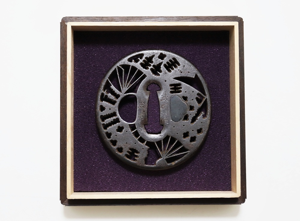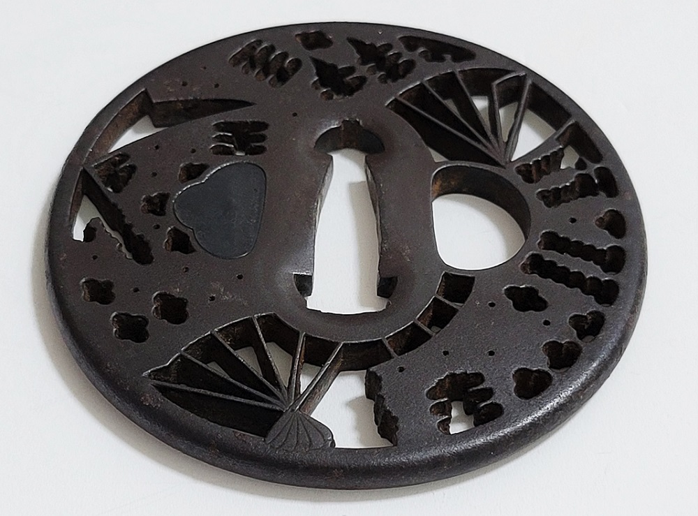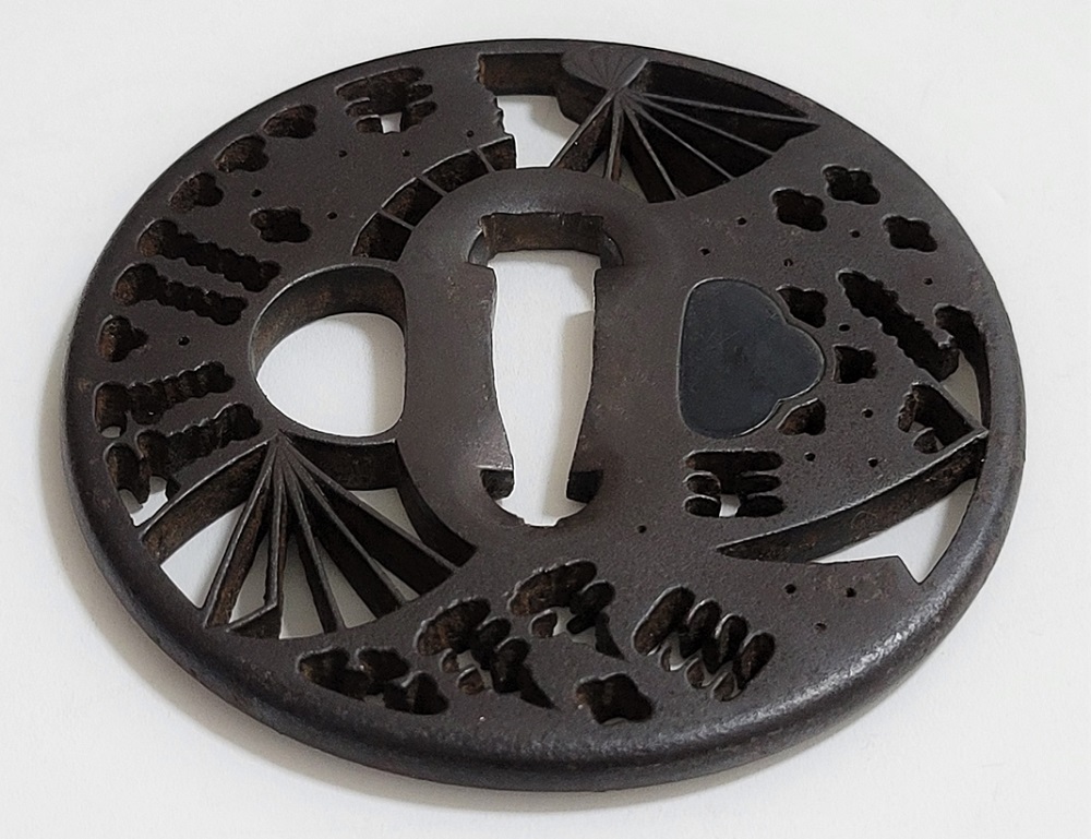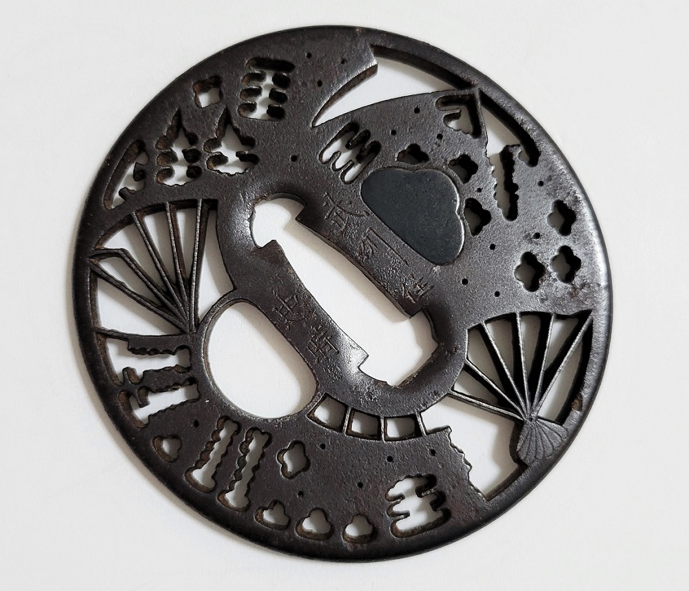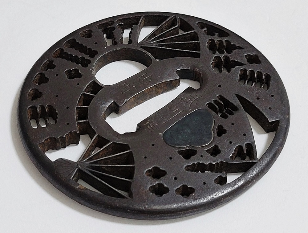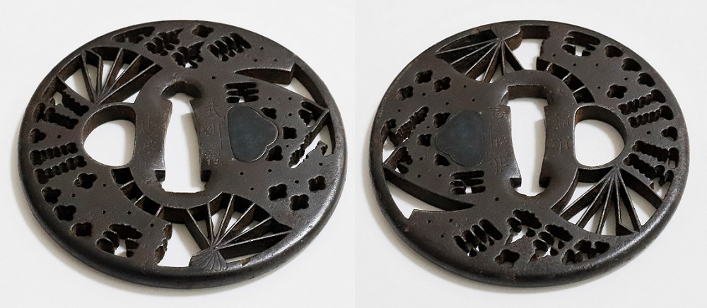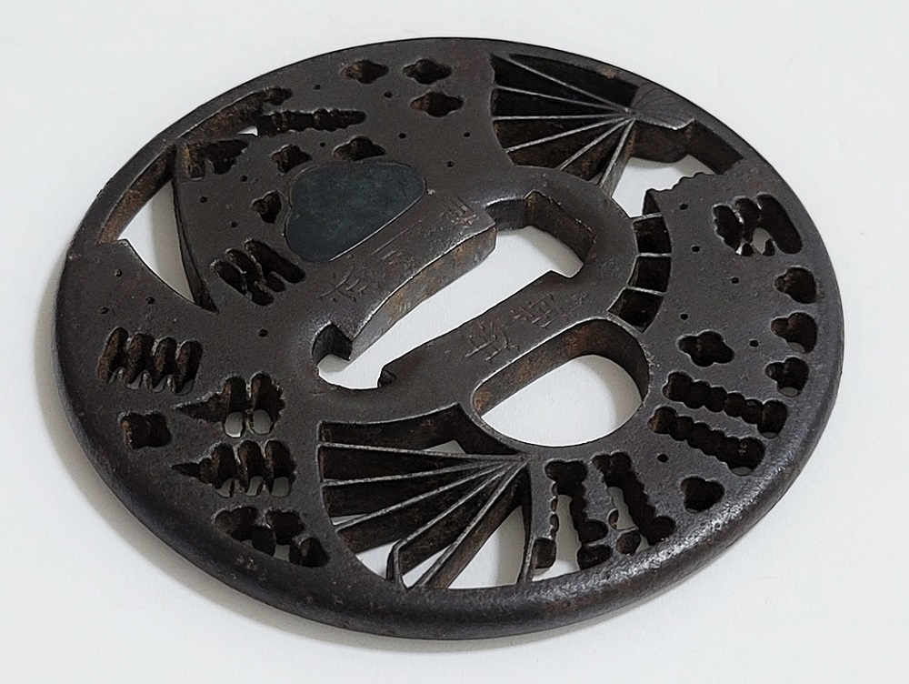 | 破れ扇は敵に後ろを見せて逃げ帰ることなく、軍扇がボロボロになっても戦い続けるという不退転の決意を表す武士が好んだ意匠。本作は銘振りより赤坂宗家六代(忠時三代)と鑑せられる。同工は先代(忠時二代)の実子で父没後に家督を相続し、忠重(忠時二代弟)の後見を得て成長、三十余年間にわたり活躍した。寛政八年(1796)没。赤坂は、初代忠時が赤坂家四代目にあたり以下6人が幕末まで忠時同名を襲名して赤坂九代目まで継承した。本作は洗練された赤坂六代目(忠時三代)の在銘鐔。2023年11月刀装具審査で特別保存合格。 |