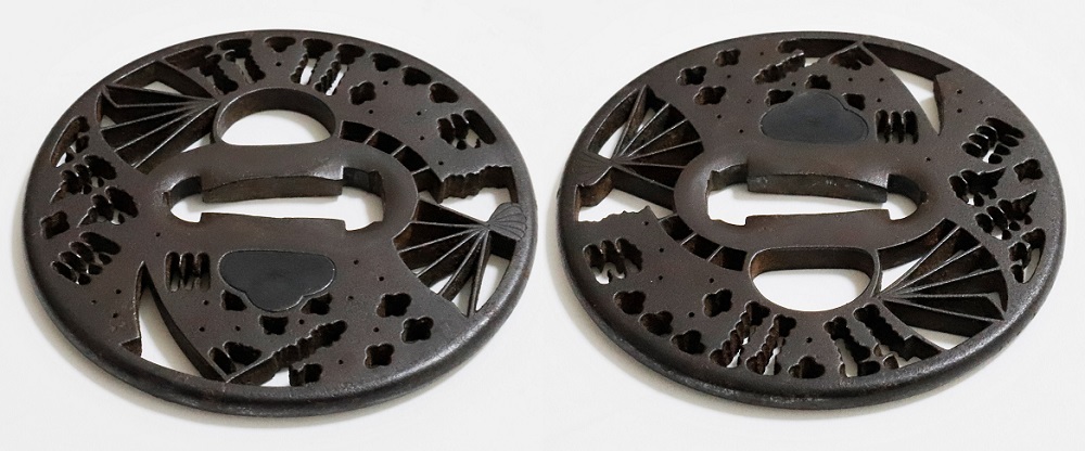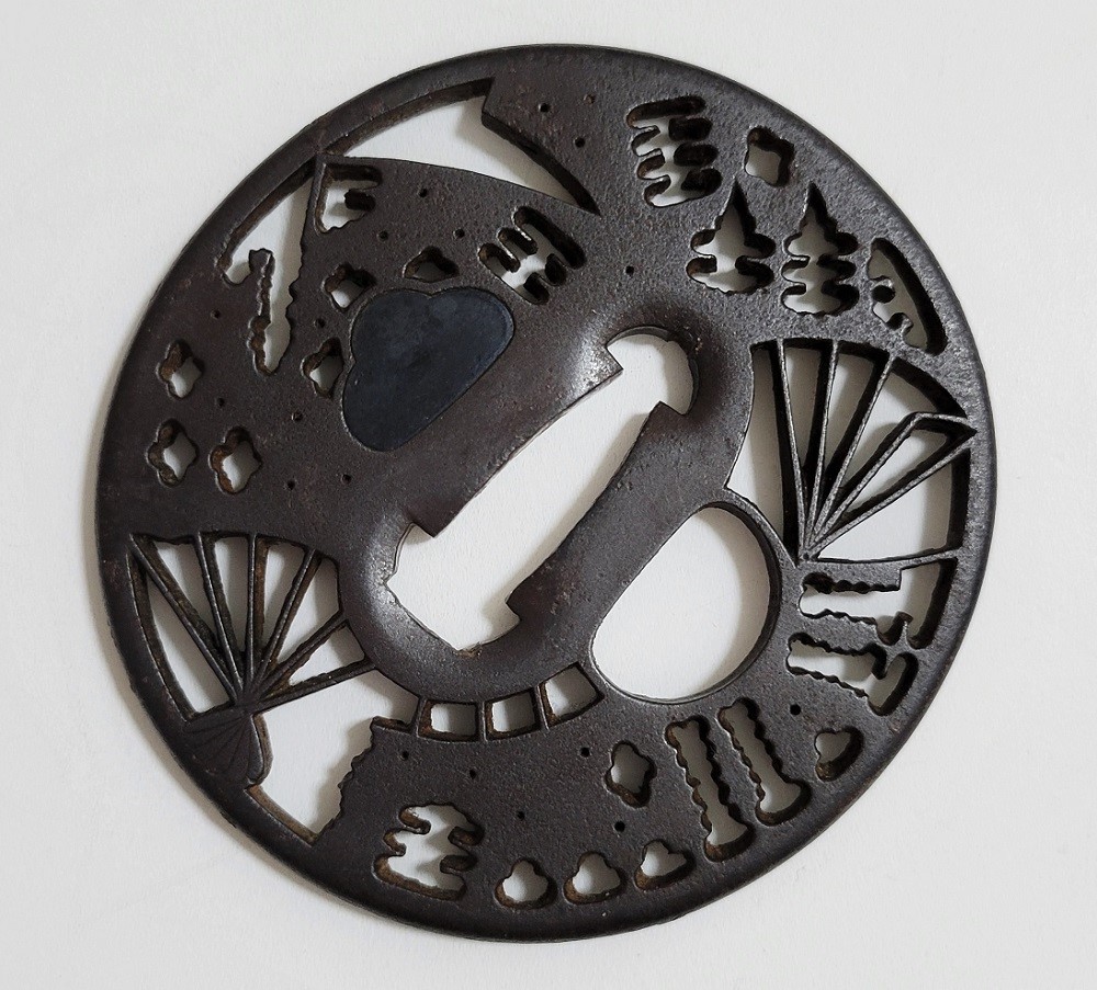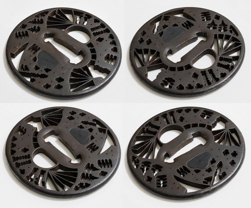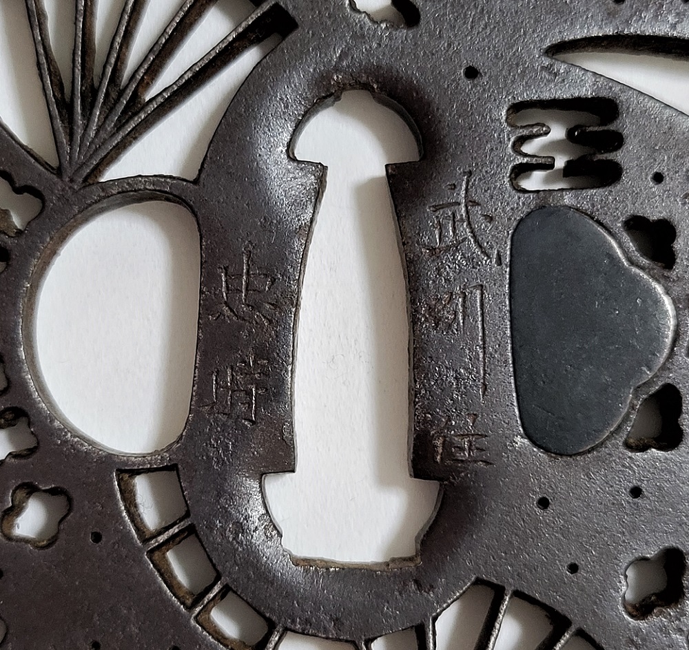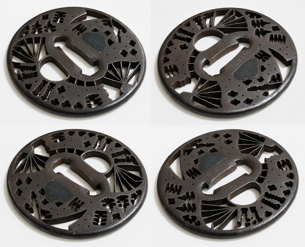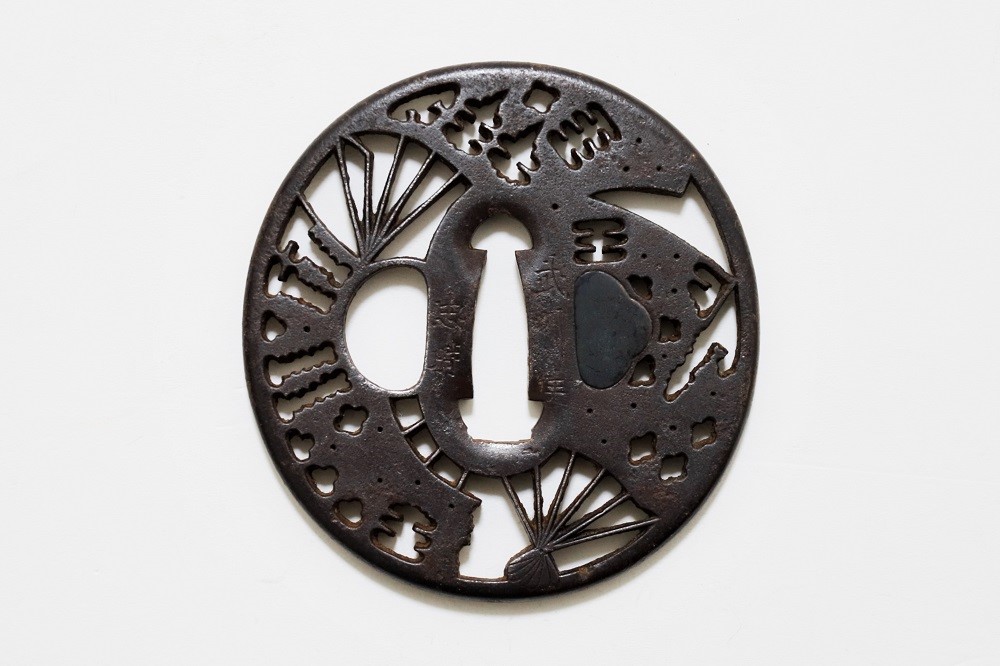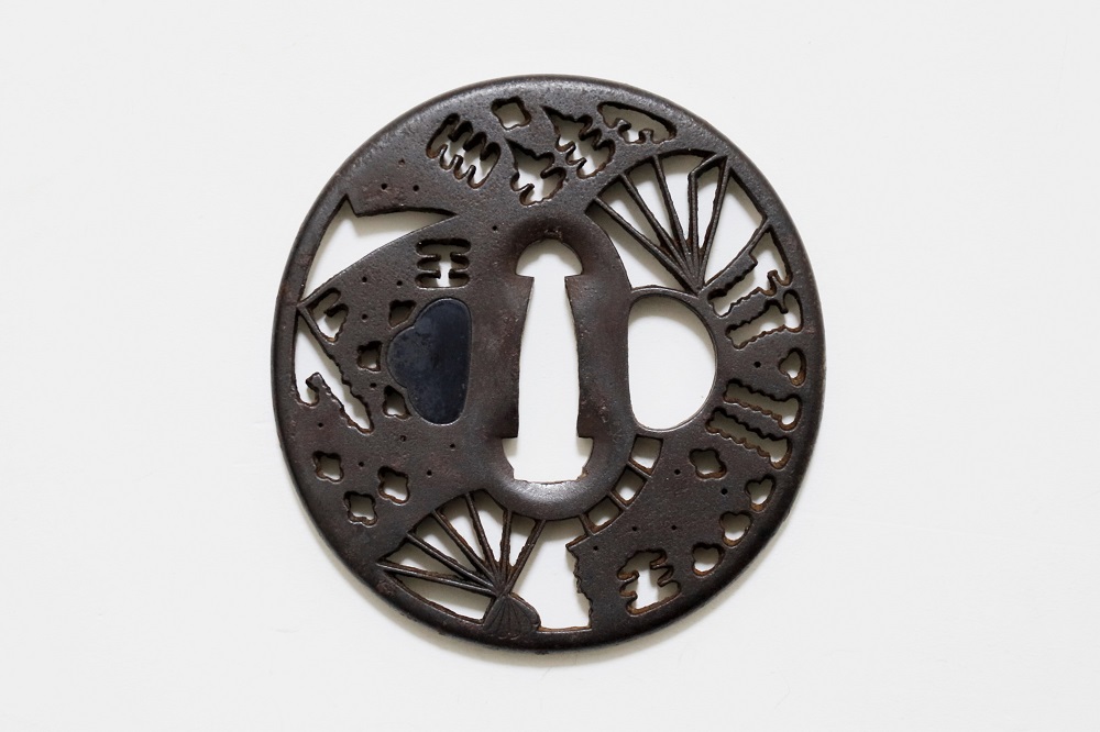 | 破れ扇は敵に後ろを見せて逃げ帰ることなく、軍扇がボロボロになっても戦い続けるという不退転の決意を表す武士が好んだ意匠。本作は銘振りより赤坂宗家六代(忠時三代)と鑑せられる。同工は先代(忠時二代)の実子で父没後に家督を相続し、忠重(忠時二代弟)の後見を得て成長、三十余年間にわたり活躍した。寛政八年(1796)没。赤坂は、初代忠時が赤坂家四代目にあたり以下6人が幕末まで忠時同名を襲名して赤坂九代目まで継承した。本作は洗練された赤坂六代目(忠時三代)の在銘鐔。2023年11月刀装具審査で特別保存合格。 |