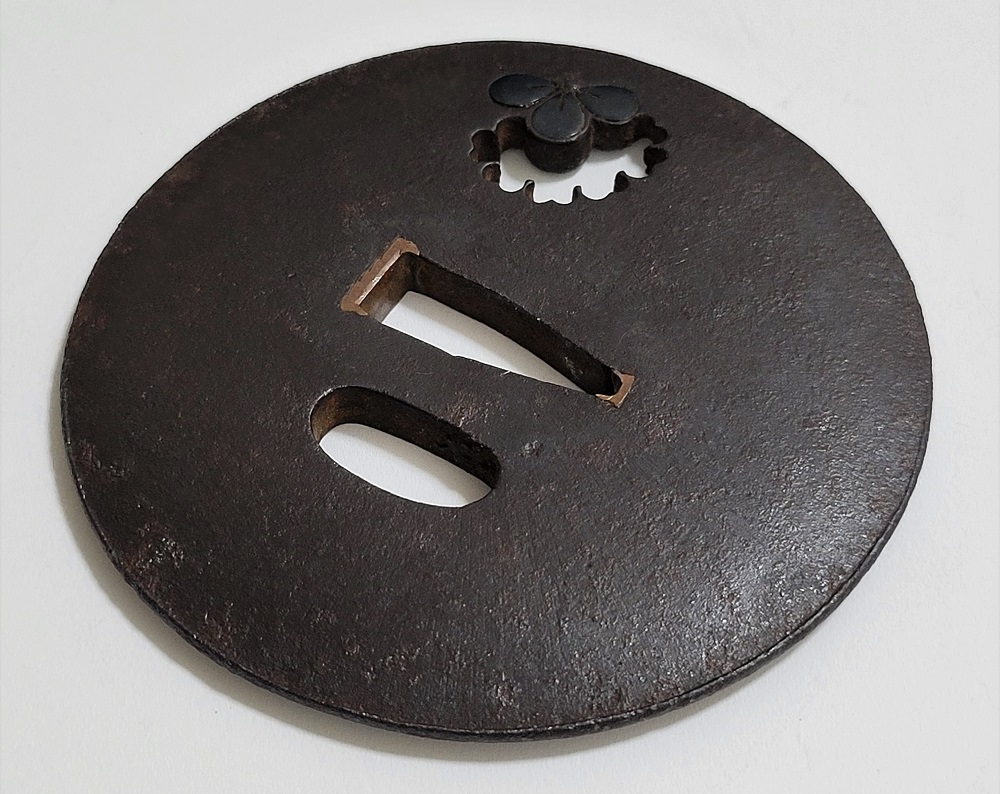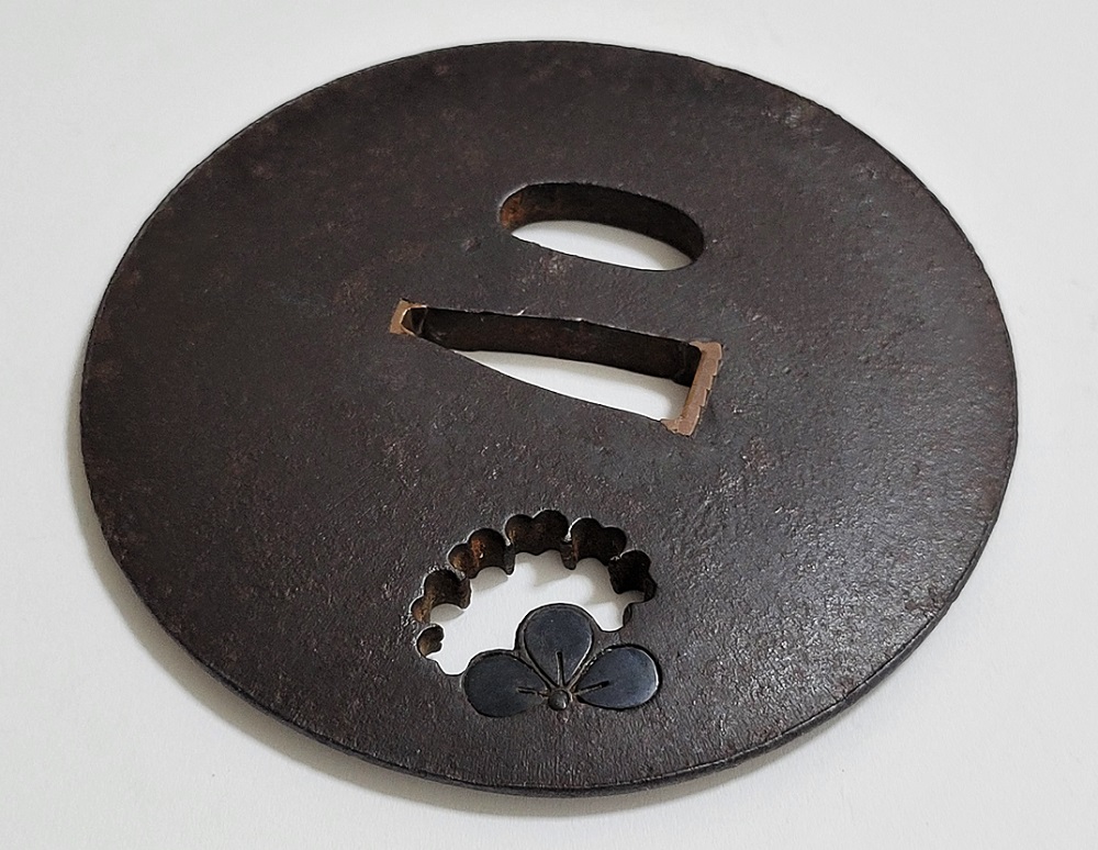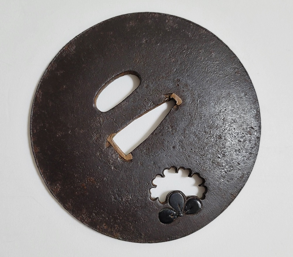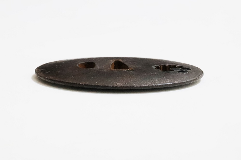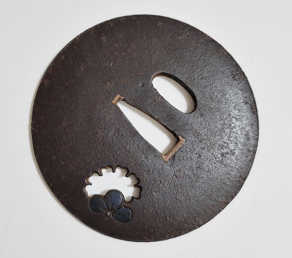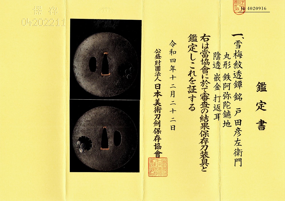 彦左衛門は戸田氏。尾張江戸期代表工の一人。小透し多く、阿弥陀鑢得意。尾張戸田村住。本作は中高の碁石形に微細な阿弥陀鑢を掛け僅かに打返し耳を付ける。精錬された鉄地には雪華紋小透と赤銅梅の花を半分づつワンポイントで配す。冬の終わりを告げる早春の図。質素ながらも気品ある鐔。2022年保存刀装具審査合格。
