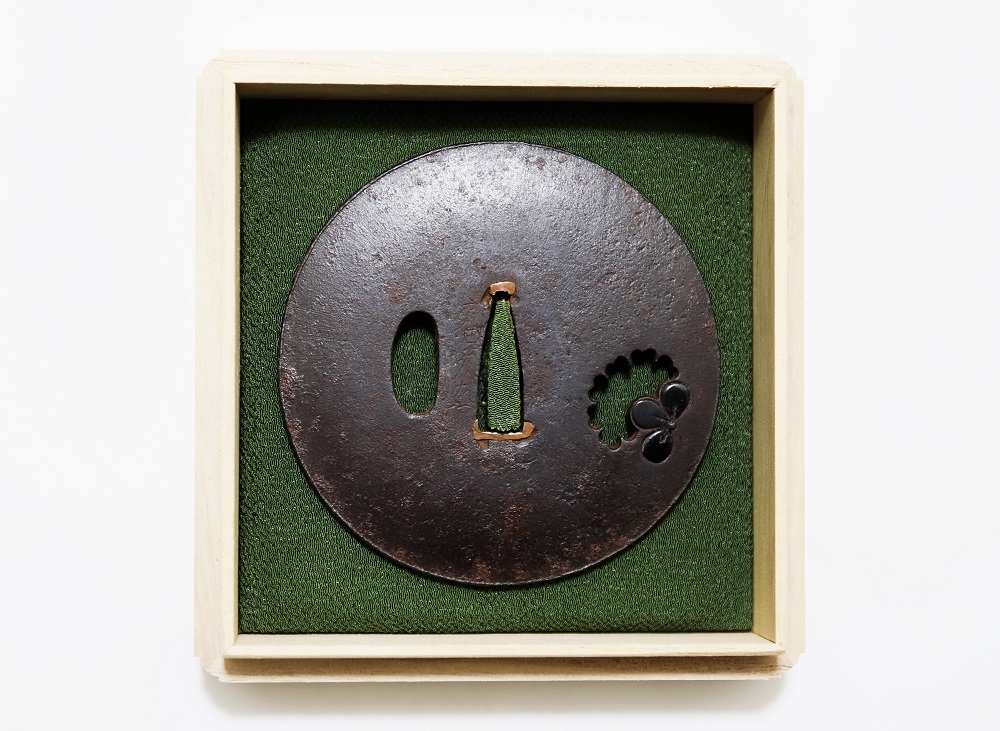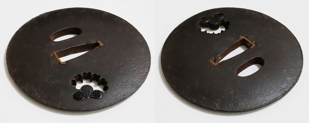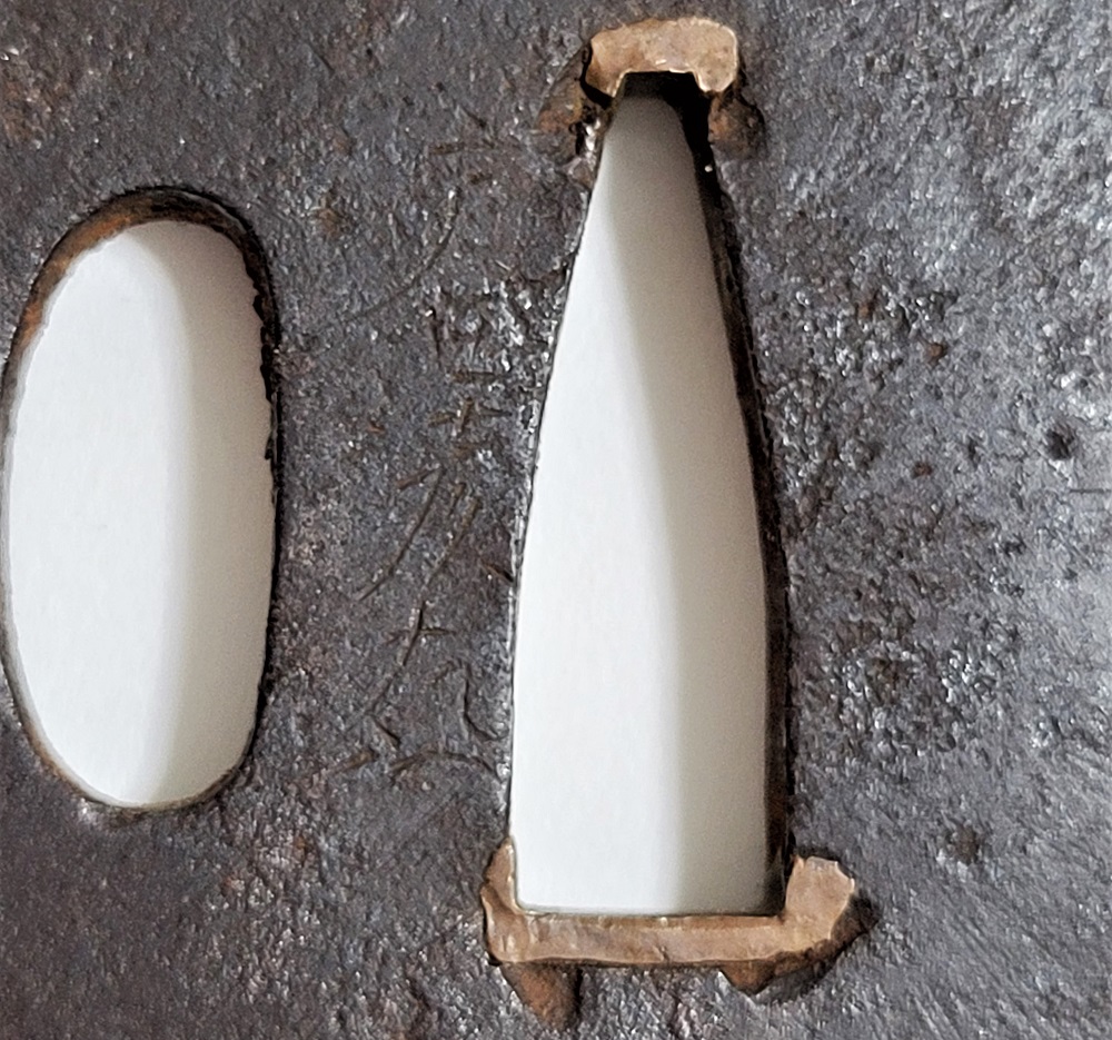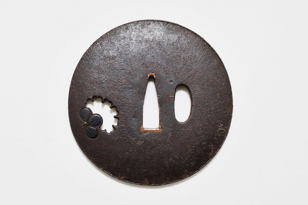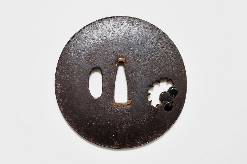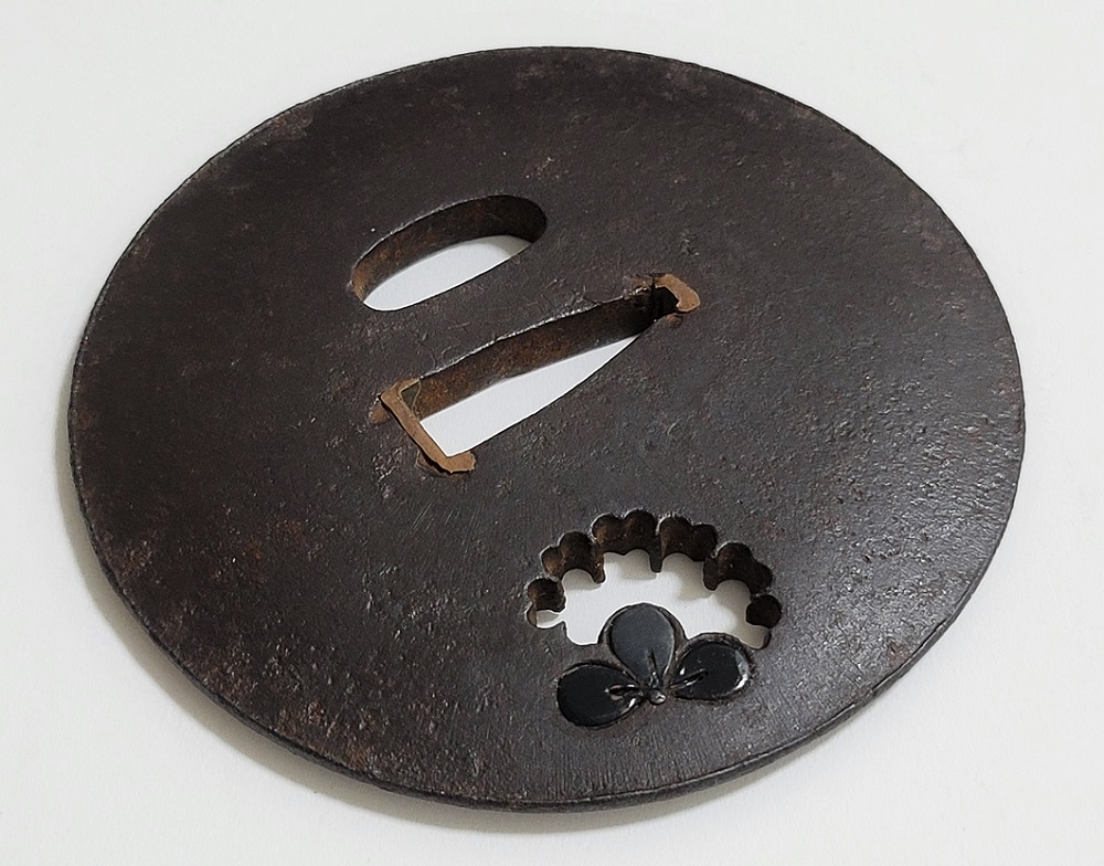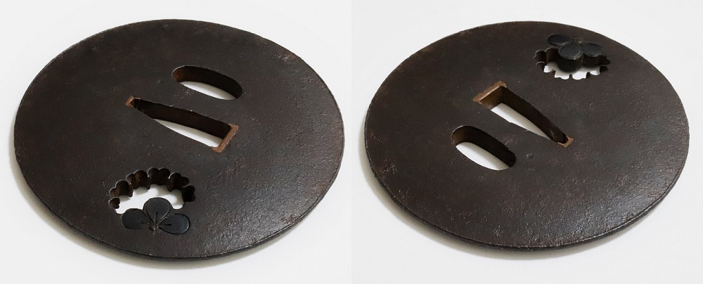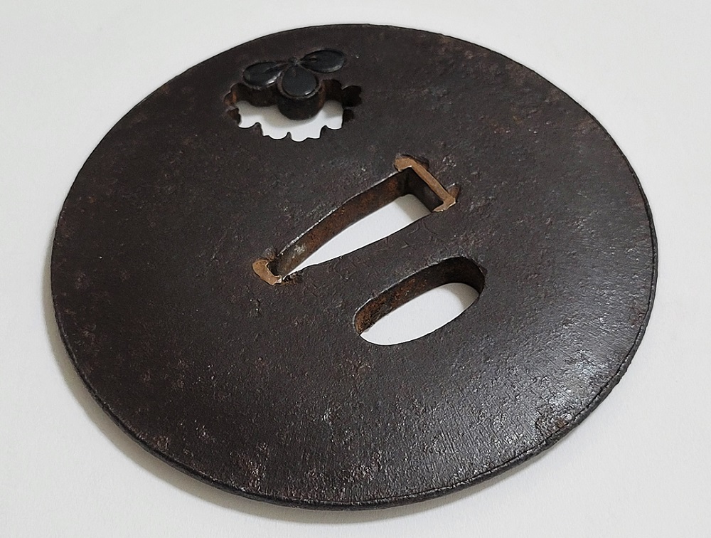 彦左衛門は戸田氏。尾張江戸期代表工の一人。小透し多く、阿弥陀鑢得意。尾張戸田村住。本作は中高の碁石形に微細な阿弥陀鑢を掛け僅かに打返し耳を付ける。精錬された鉄地には雪華紋小透と赤銅梅の花を半分づつワンポイントで配す。冬の終わりを告げる早春の図。質素ながらも気品ある鐔。2022年保存刀装具審査合格。