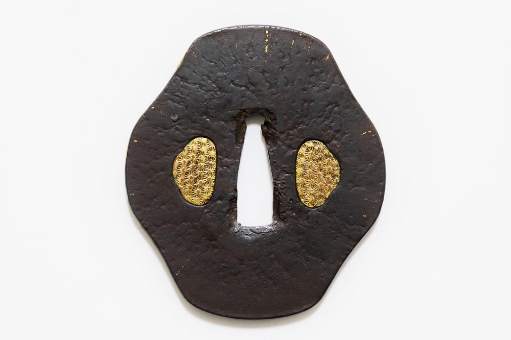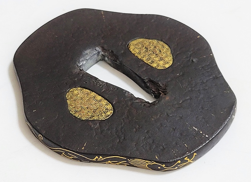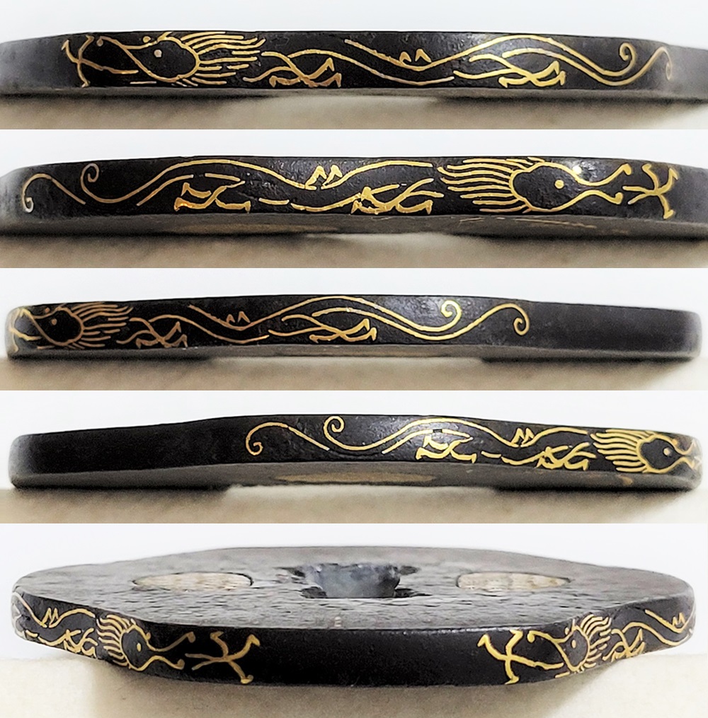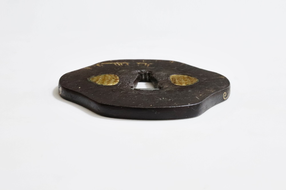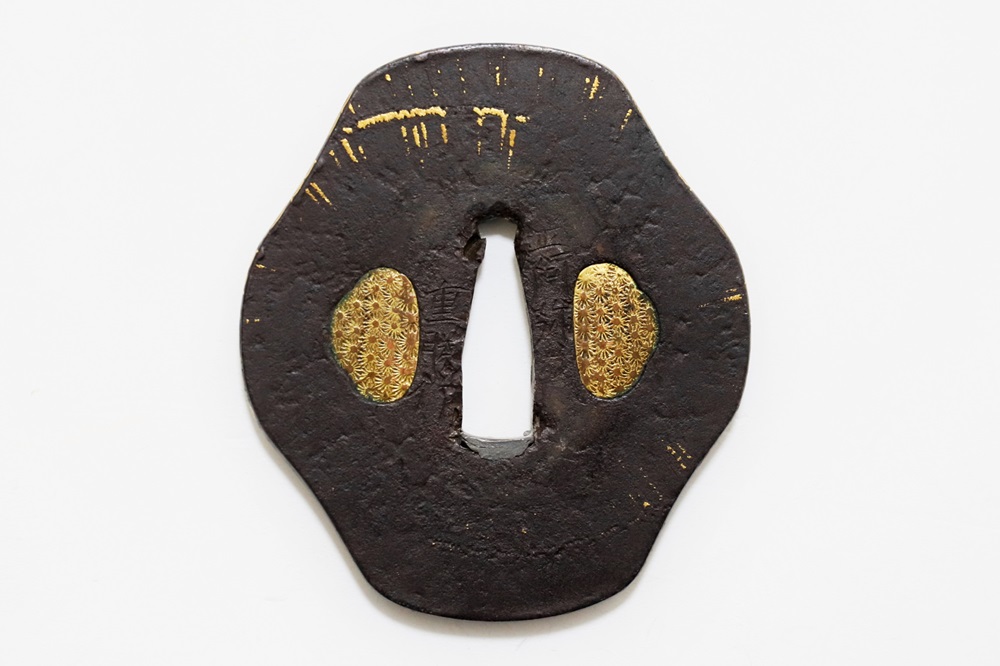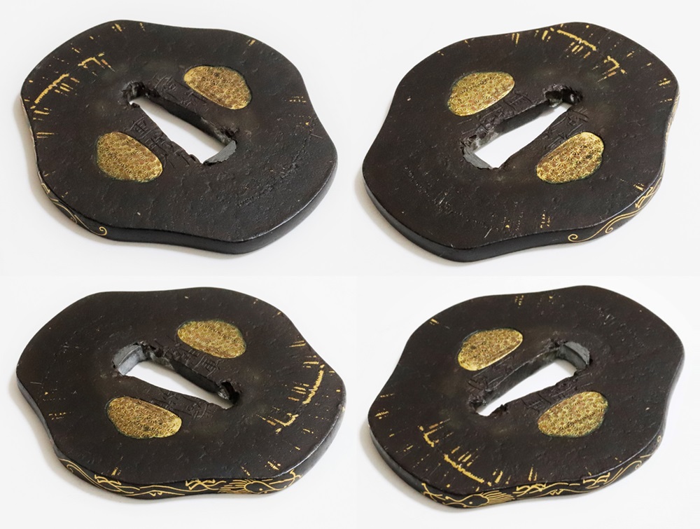 正阿弥重勝は江戸中期の会津正阿弥派。本作は、表裏に後光が差すような阿弥陀鑢風の金布目象嵌を縁際に施し、耳に平象嵌で昇る雨龍を平象嵌であらわす。洗練味ある意匠の会津正阿弥在銘鐔。2024年8月審査で保存刀装具合格。