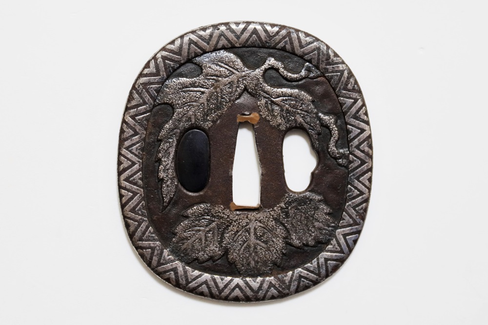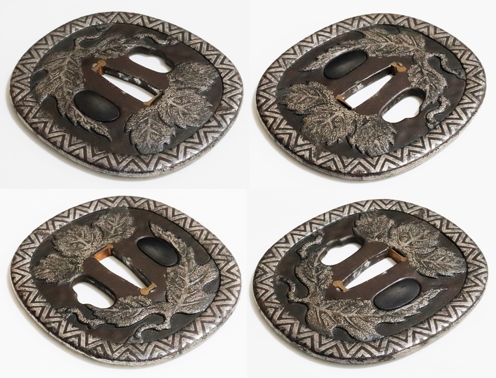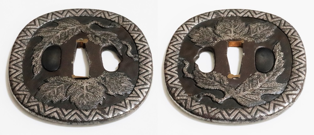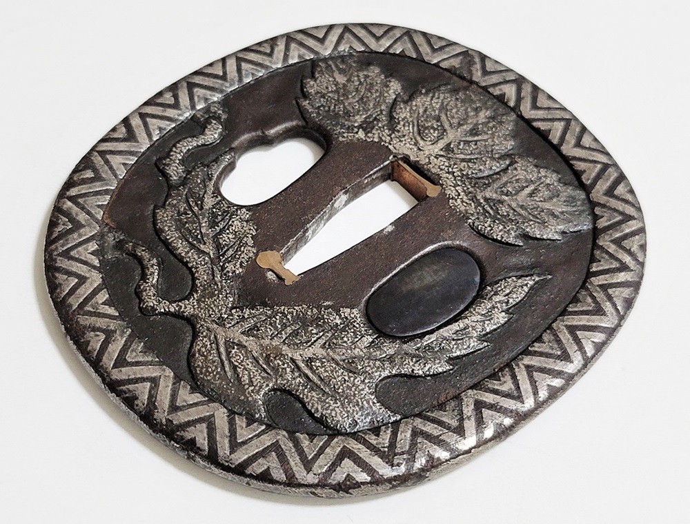 | 材質 | 鉄地 障泥形 鋤出彫 銀布目象嵌 土手耳 |