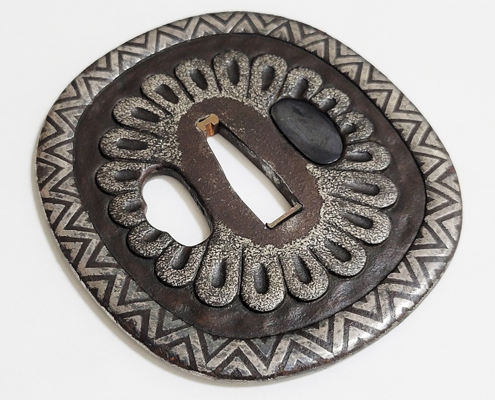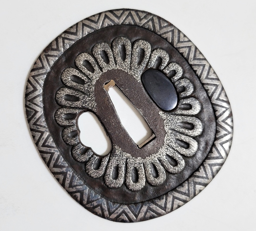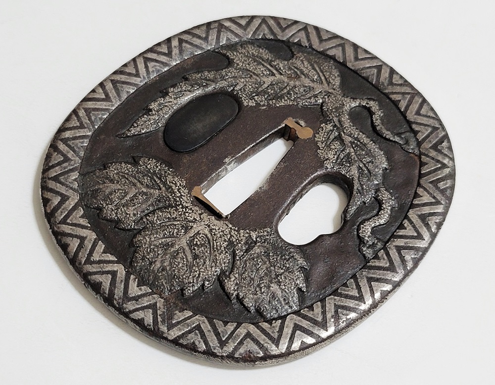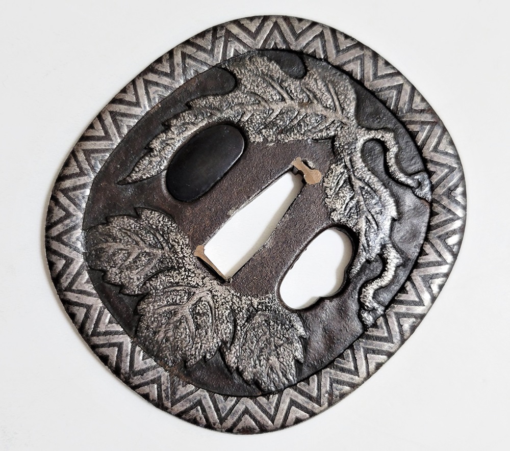 | 銀布目象嵌を大胆華やかに施した江戸肥後鐔。意匠は菊の花と葉に波線模様の土手耳であろうか。保存状態頗るよい。2024年11月刀装具審査で保存合格。 |