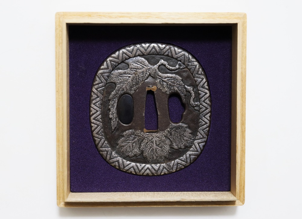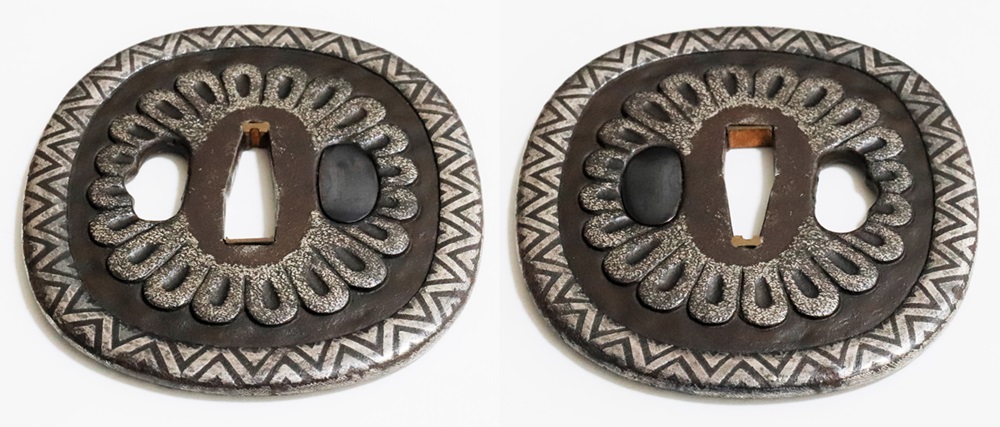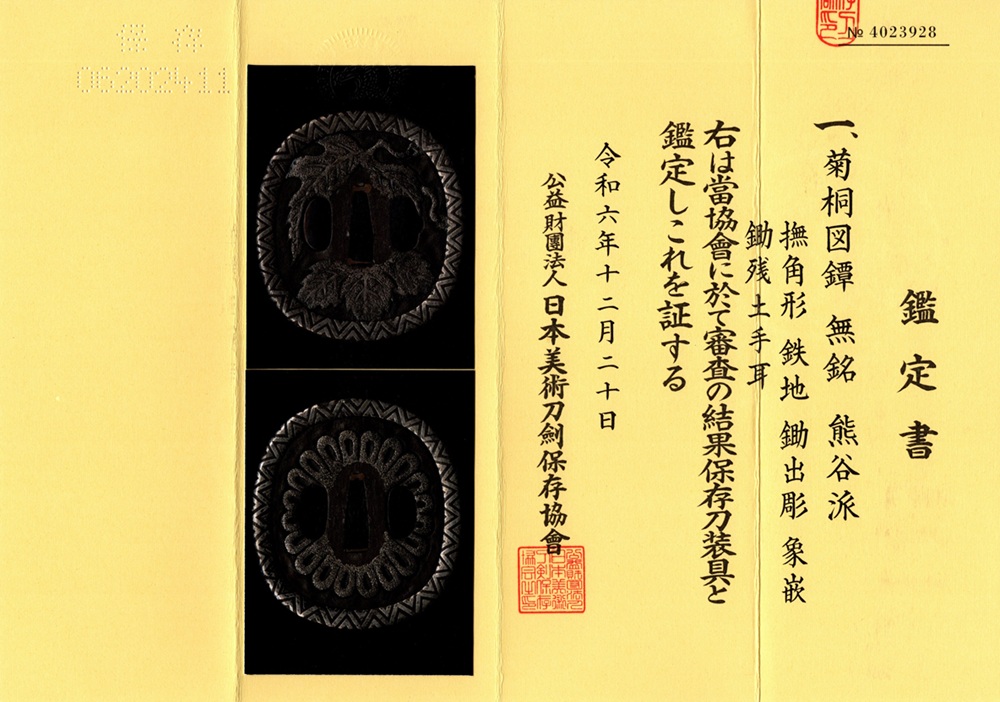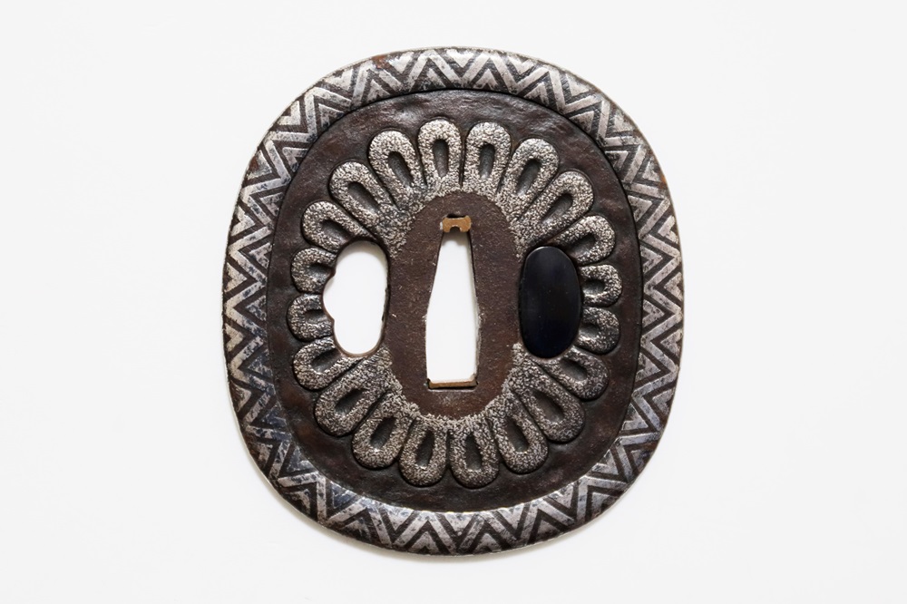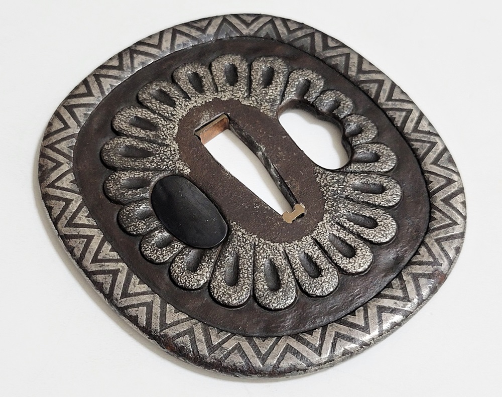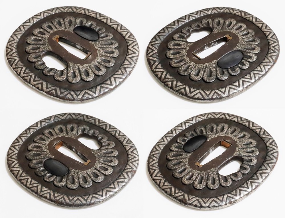 | 銀布目象嵌を大胆華やかに施した江戸肥後鐔。意匠は菊の花と葉に波線模様の土手耳であろうか。保存状態頗るよい。2024年11月刀装具審査で保存合格。 |