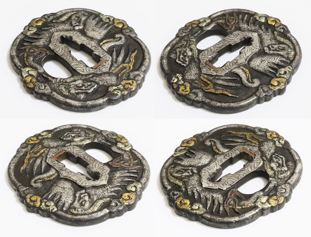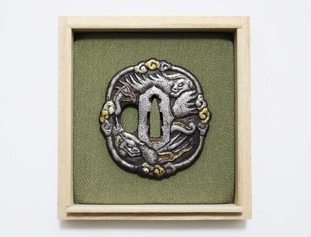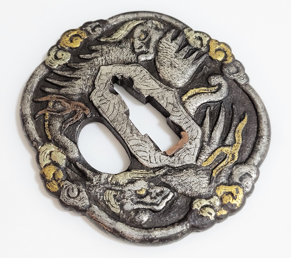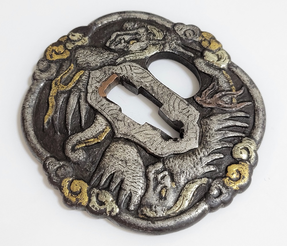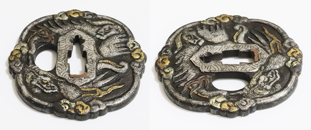 異国情緒ある南蛮鐔は、肥前国平戸や長崎で輸入され、またその製作が江戸時代後期に平戸国重一門や肥前若芝一派で盛んにおこなわれ全国に流行し、京都、江戸をはじめ各地で製作された。本作雲龍図南蛮鐔は、一般的な南蛮鐔と異なり、変り八つ木瓜形で地透はなく、高鋤彫の雲龍に金銀素銅の布目象嵌を艶やかに施す。裏は平地に鋤彫で不可思議な意匠を上下に配し布目象嵌を施す。青金、赤金の変化が華やかさを引き立てている。