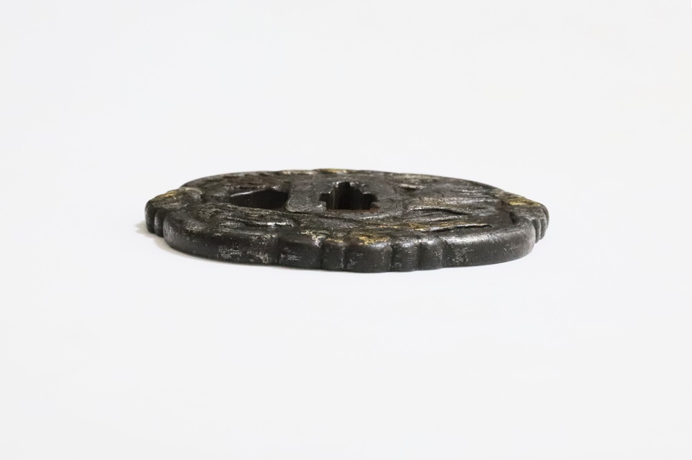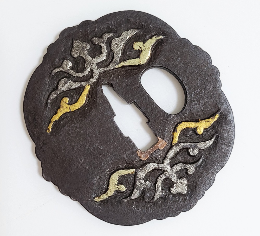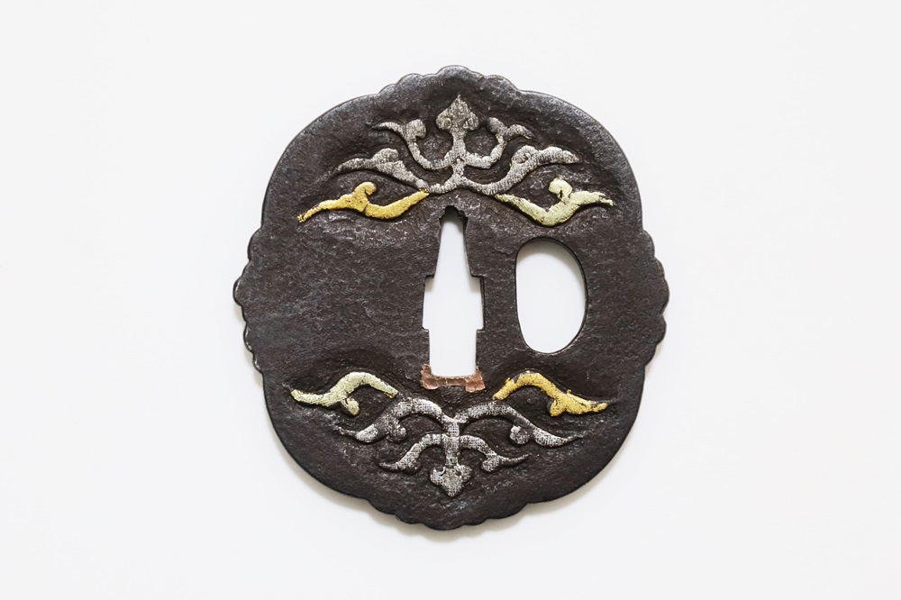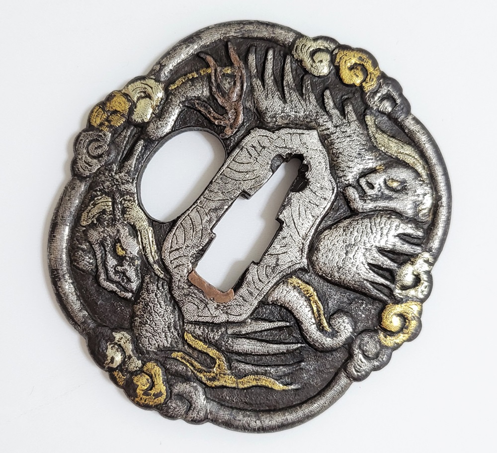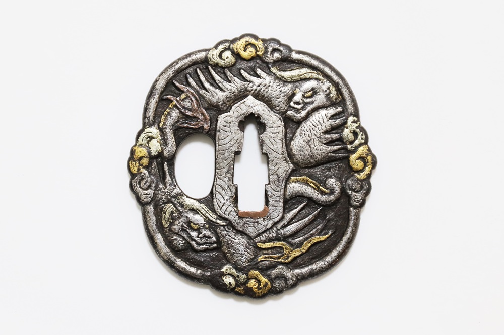 異国情緒ある南蛮鐔は、肥前国平戸や長崎で輸入され、またその製作が江戸時代後期に平戸国重一門や肥前若芝一派で盛んにおこなわれ全国に流行し、京都、江戸をはじめ各地で製作された。本作雲龍図南蛮鐔は、一般的な南蛮鐔と異なり、変り八つ木瓜形で地透はなく、高鋤彫の雲龍に金銀素銅の布目象嵌を艶やかに施す。裏は平地に鋤彫で不可思議な意匠を上下に配し布目象嵌を施す。青金、赤金の変化が華やかさを引き立てている。