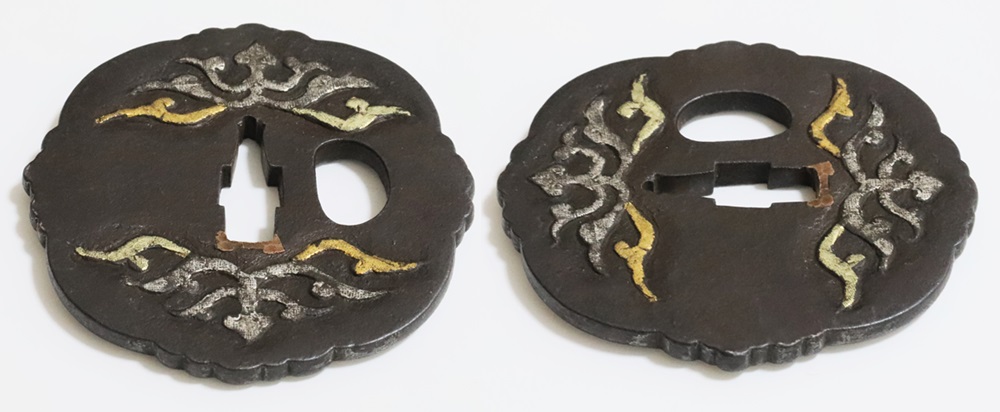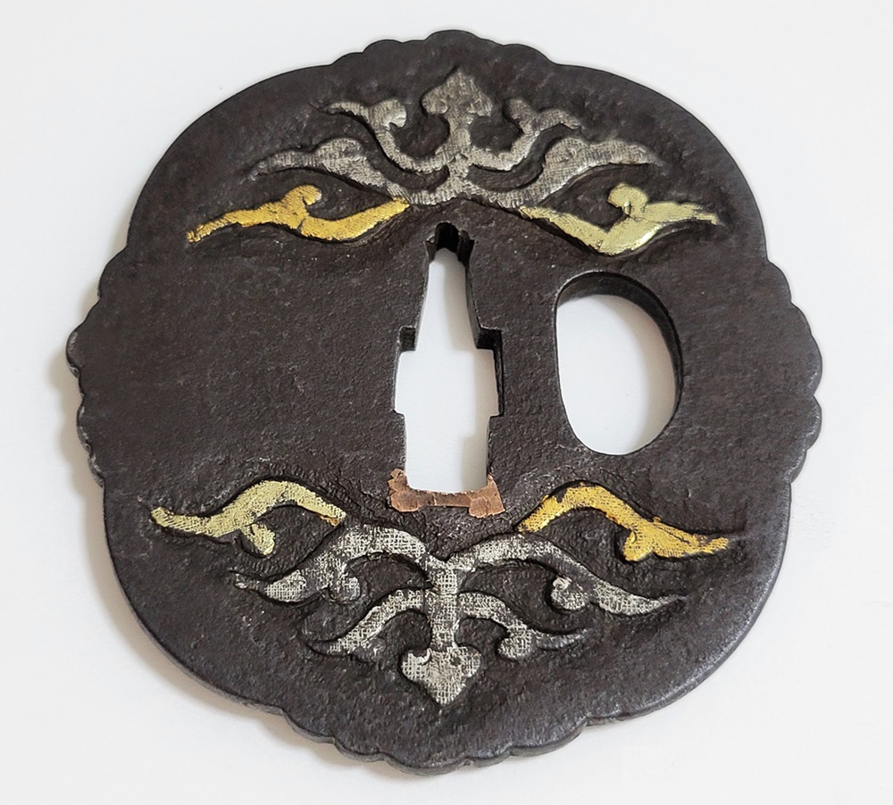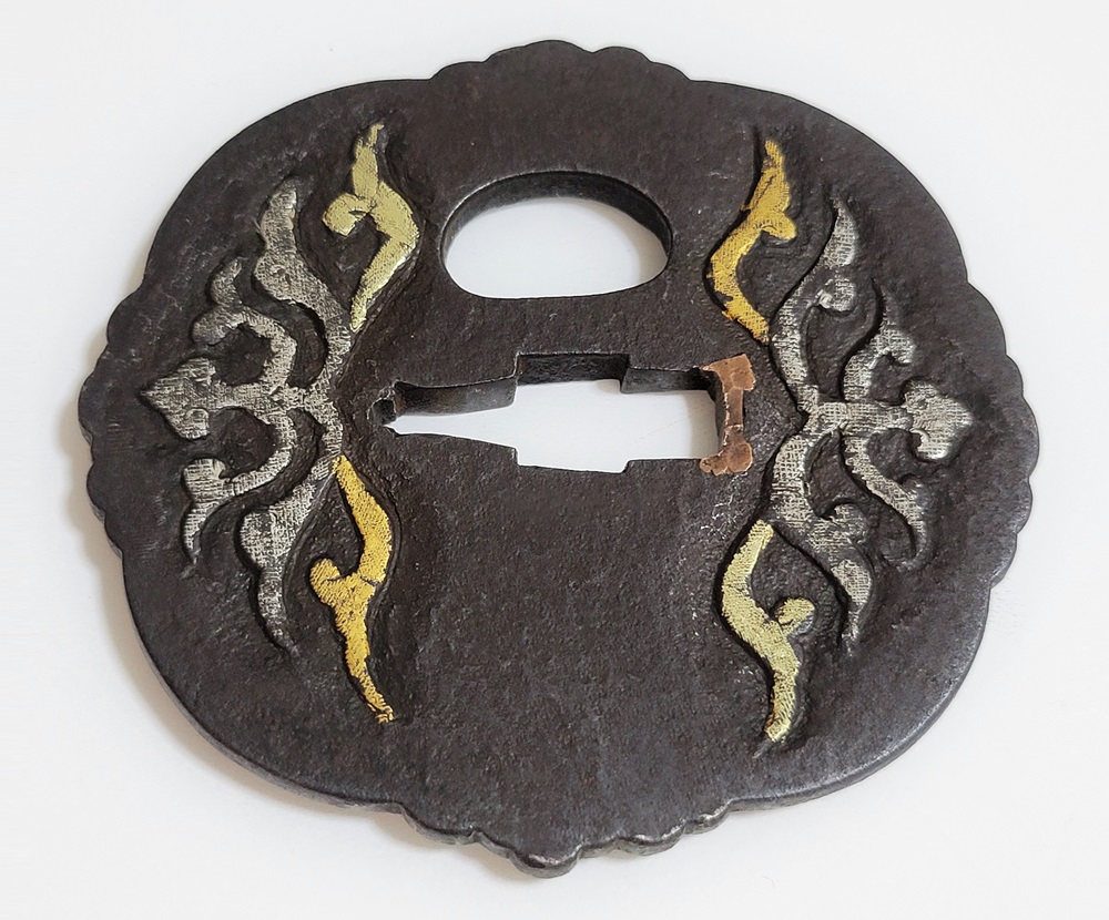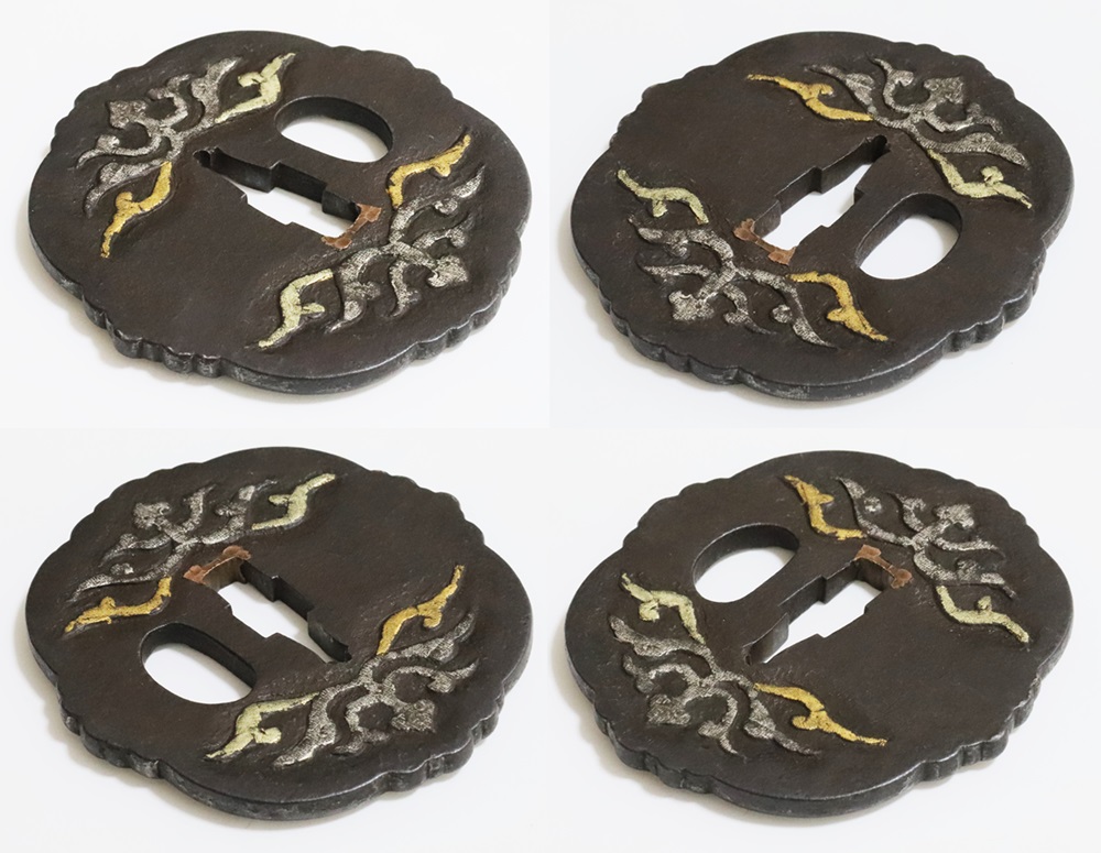 材質 鉄地 変形八つ木瓜形 高鋤彫 金銀素銅布目象嵌