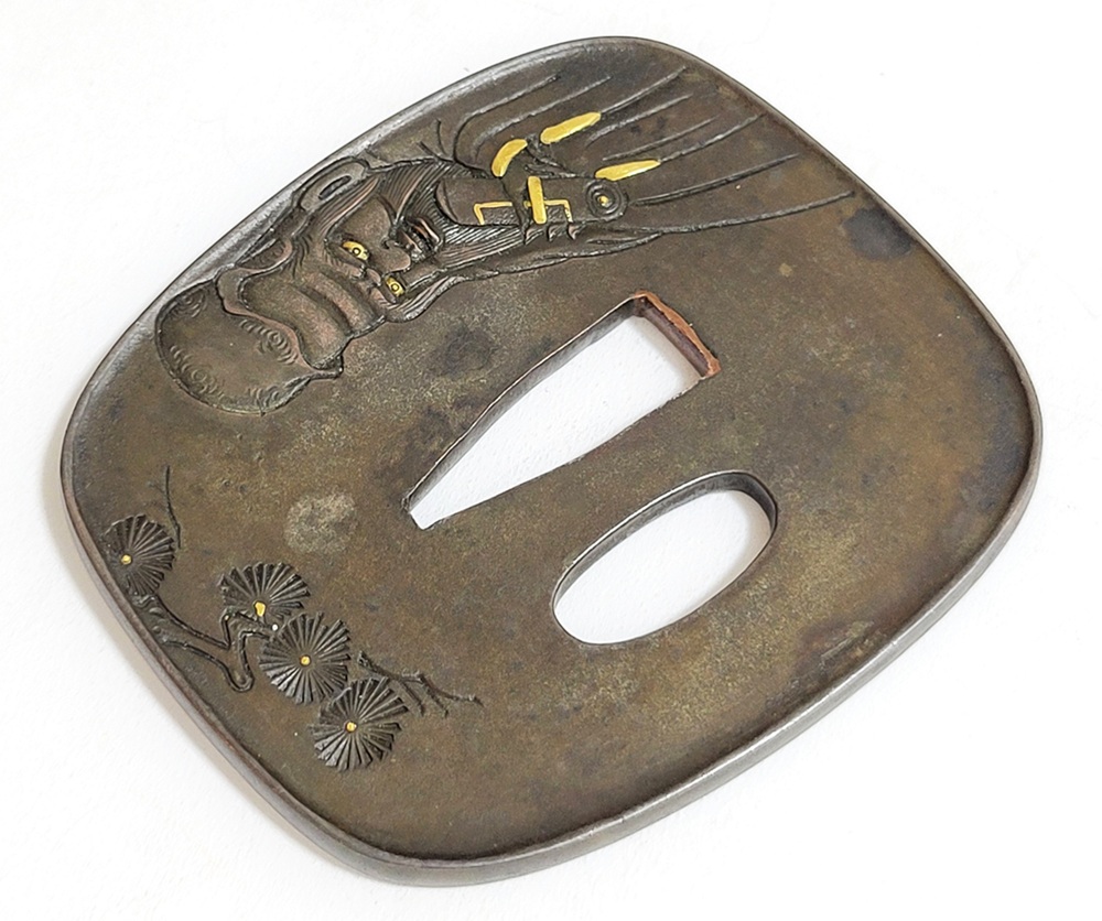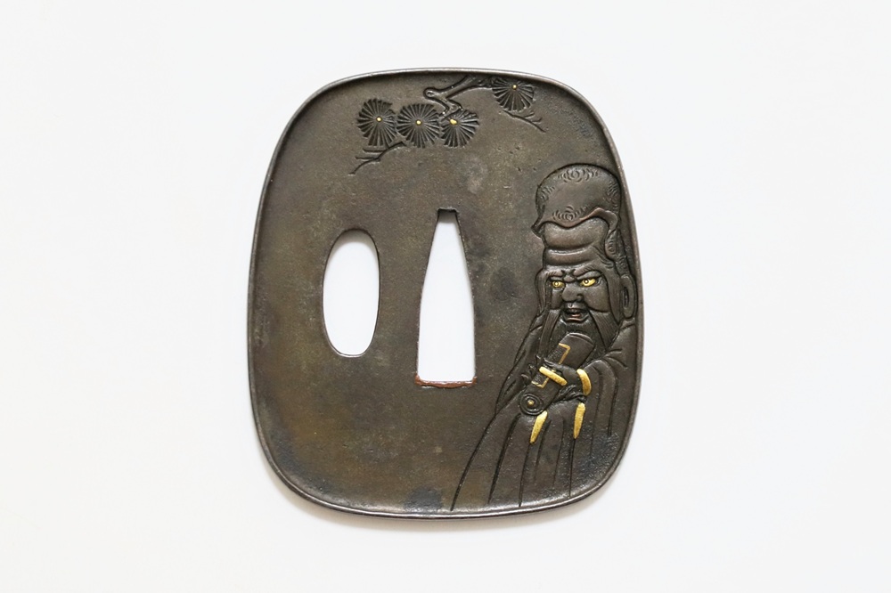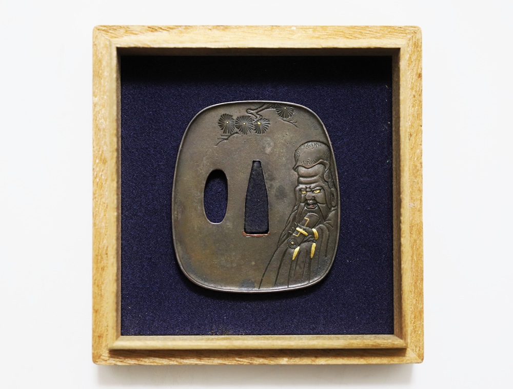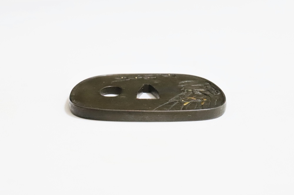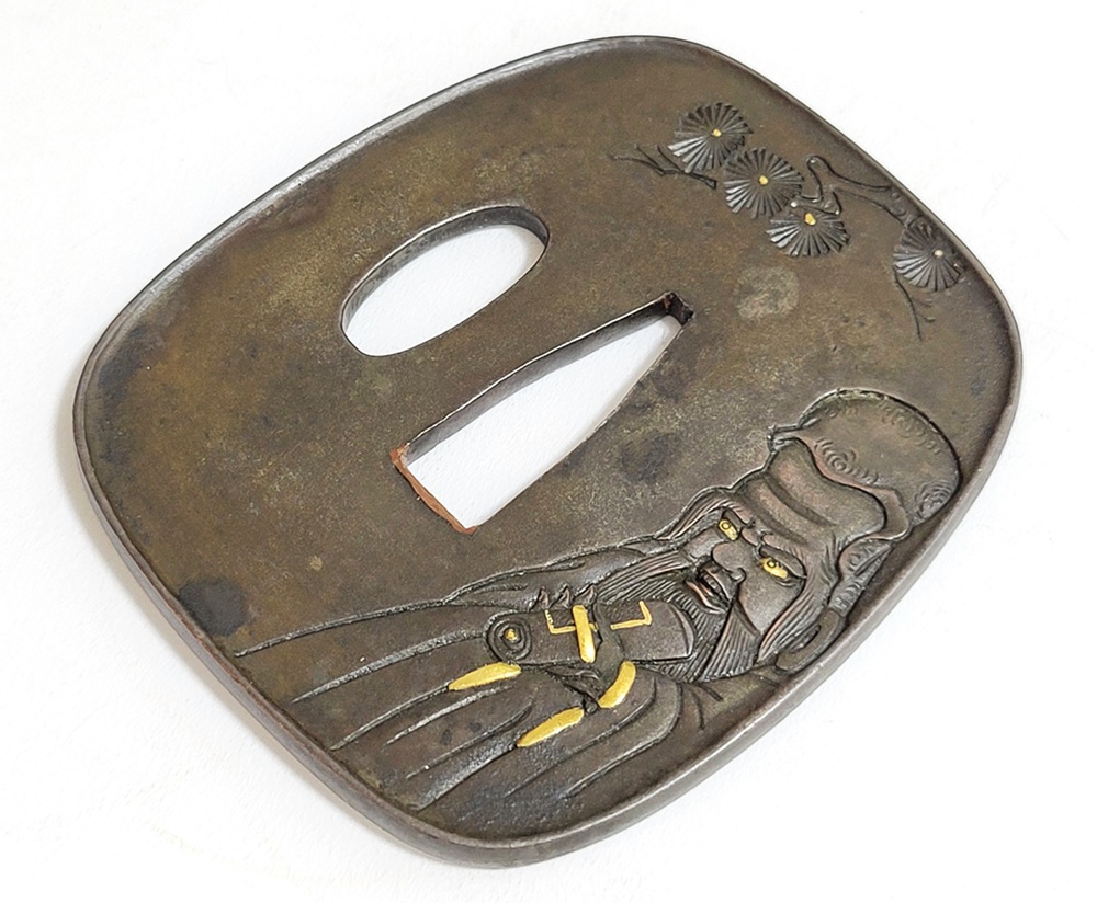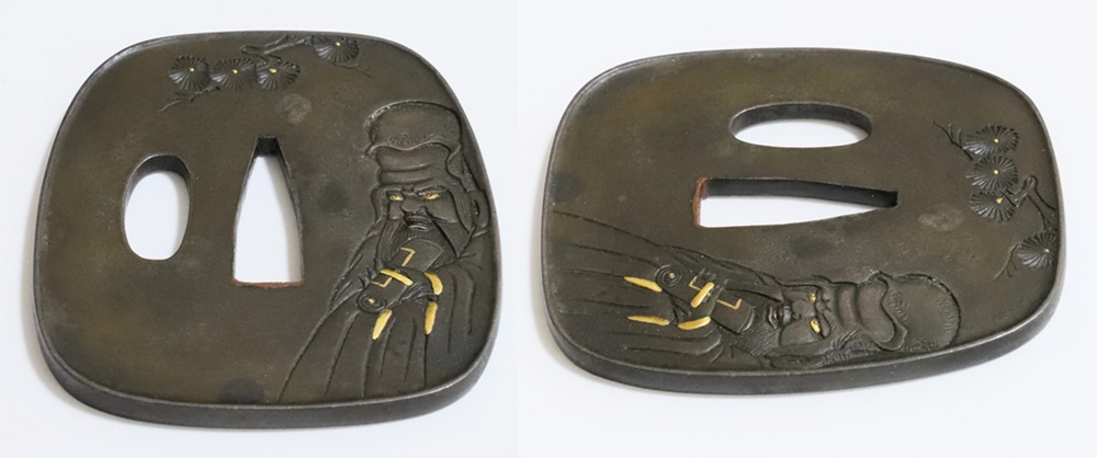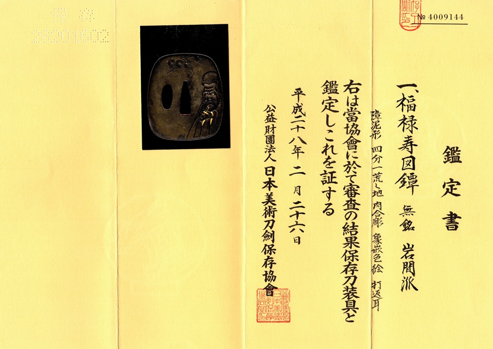 無銘ながら岩間派と極められた福禄寿鐔。岩間派は浜野本家で学んだ岩間政盧(まさよし)(明和元年1764・江戸下谷生)を祖とし、信随(のぶゆき)、信盧(のぶよし)、尚盧(たかよし)ら岩間の苗字を許された門弟と共に政随風の高彫工法で主に和漢の人物図作を成す。本作は、厳しく威厳ある顔を端正な彫であらわす。平成28年(2016)保存審査合格。