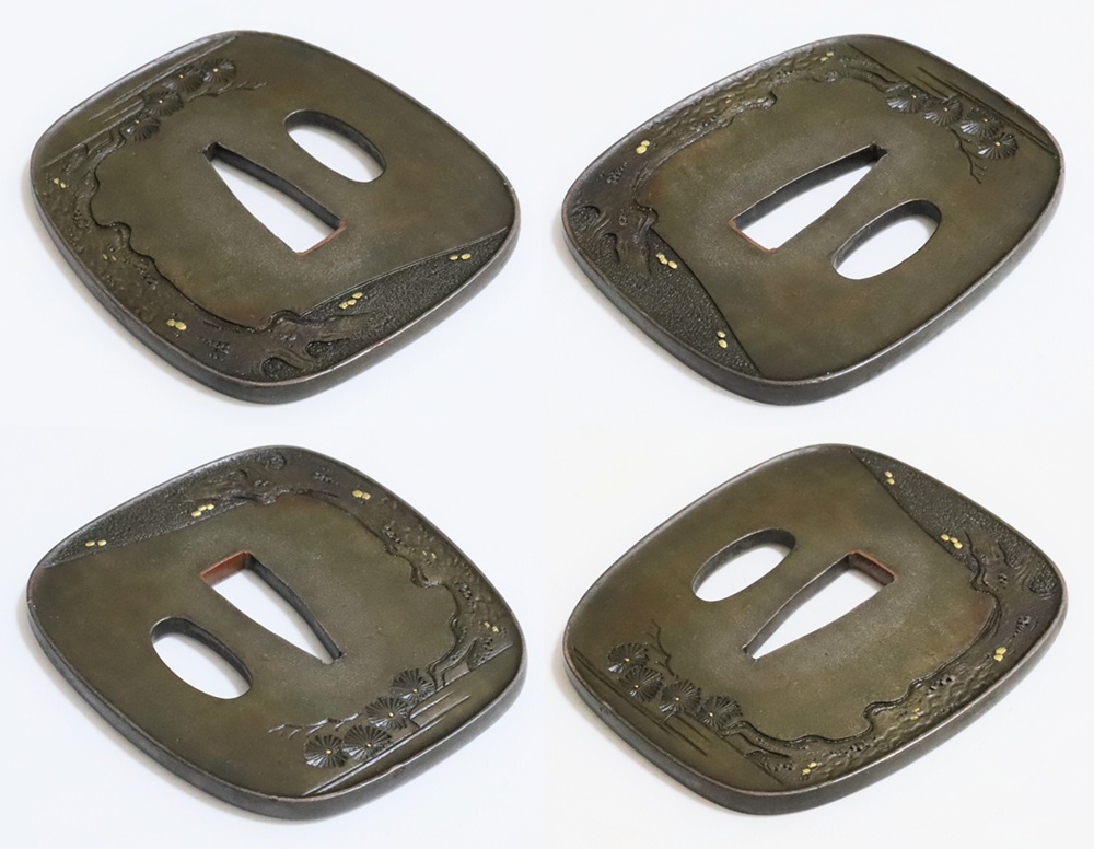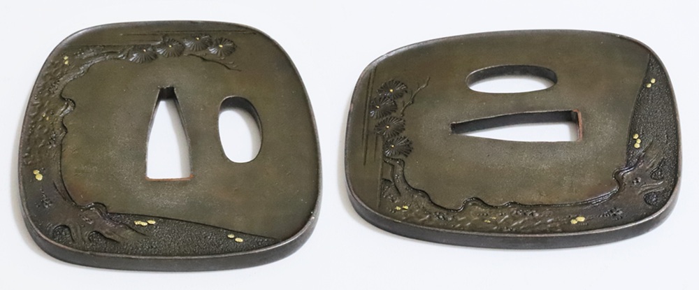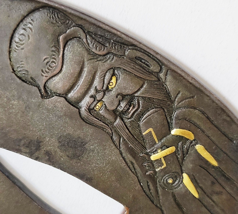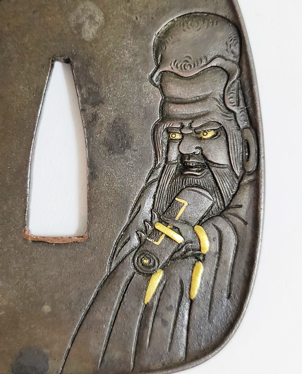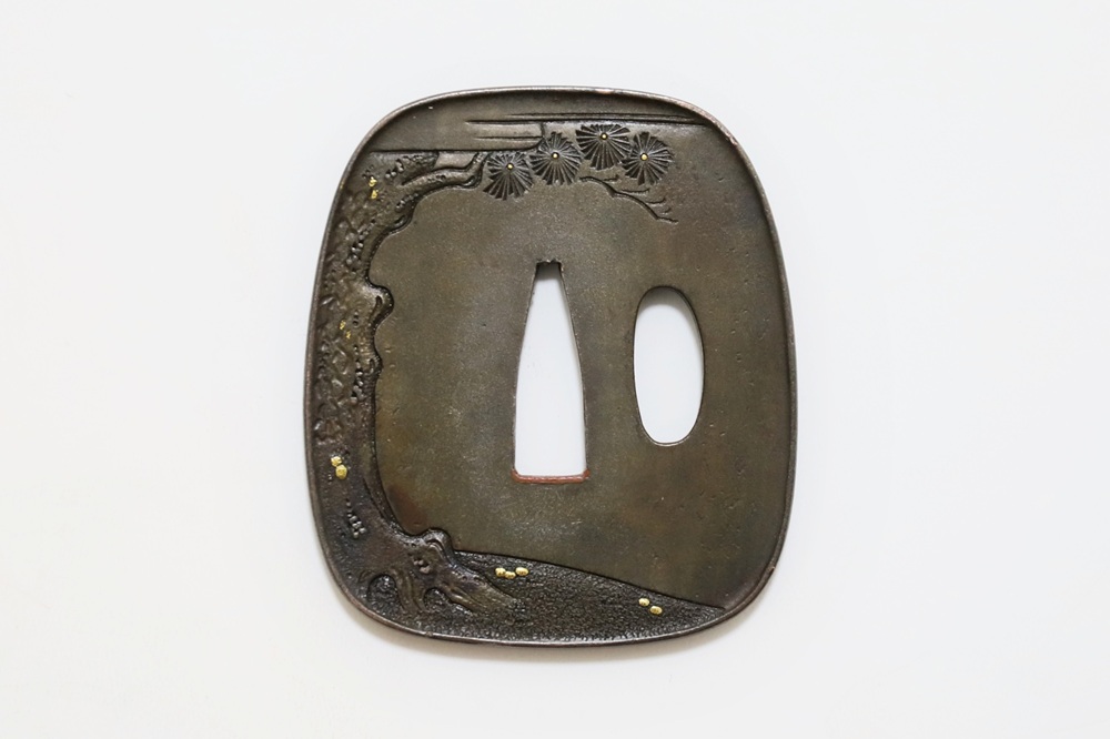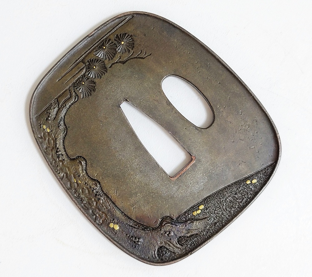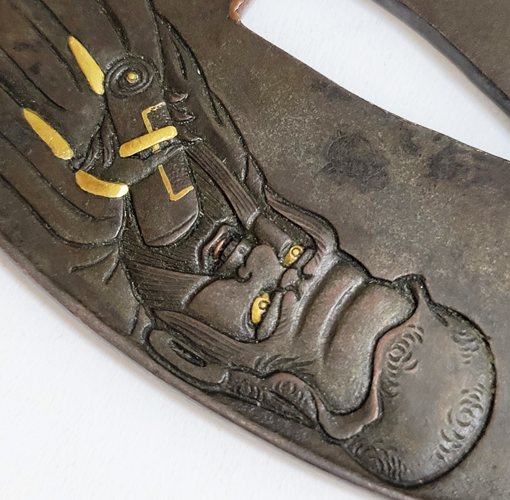 無銘ながら岩間派と極められた福禄寿鐔。岩間派は浜野本家で学んだ岩間政盧(まさよし)(明和元年1764・江戸下谷生)を祖とし、信随(のぶゆき)、信盧(のぶよし)、尚盧(たかよし)ら岩間の苗字を許された門弟と共に政随風の高彫工法で主に和漢の人物図作を成す。本作は、厳しく威厳ある顔を端正な彫であらわす。平成28年(2016)保存審査合格。