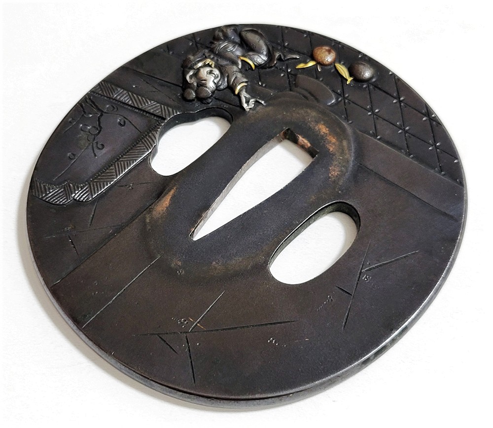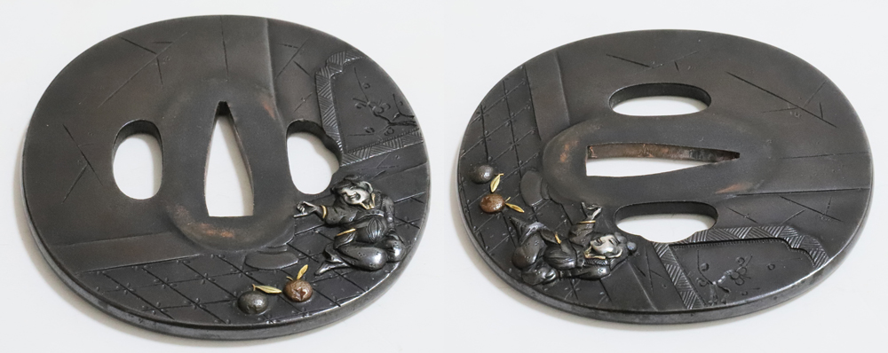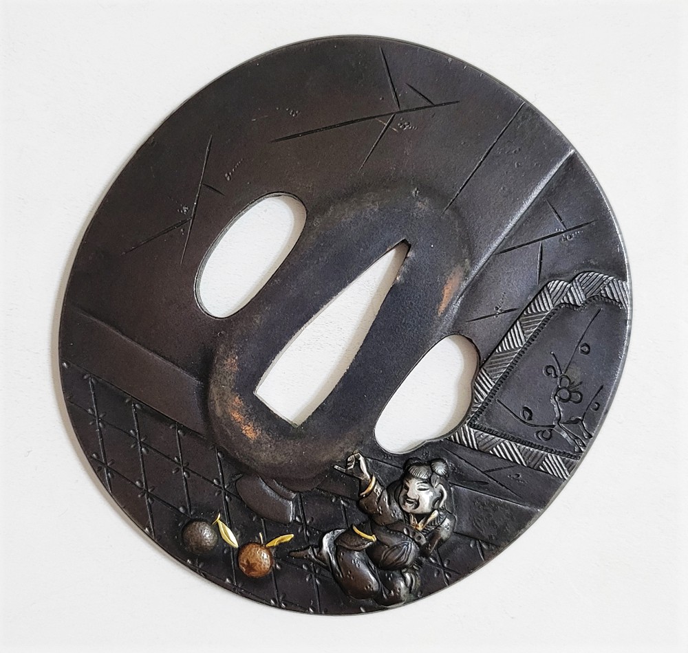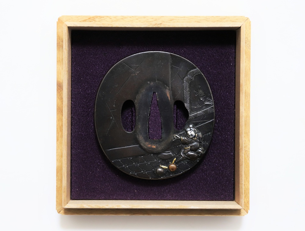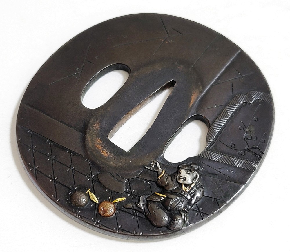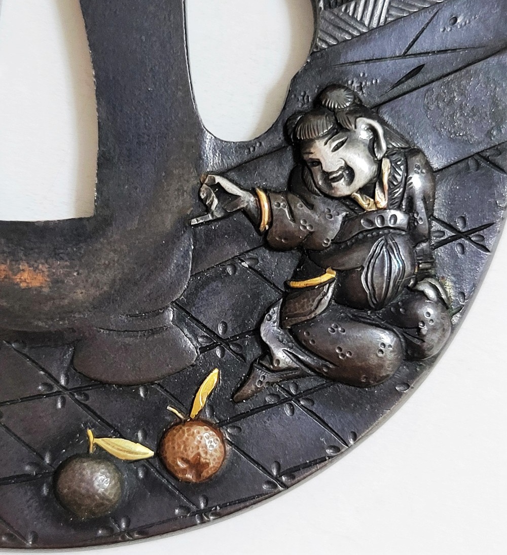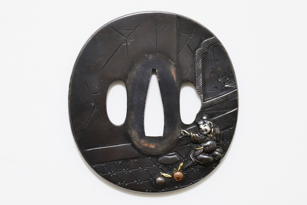 | 唐子とは中国の衣装を着て、髪の毛を頭の上や左右で結い、それ以外の毛を剃り落とした子供。中国唐王朝時代に子供を描いた図柄が盛んに描かれ、日本にも唐子の遊戯図が伝わった。本作は唐子が節句で遊ぶ図で慶賀や吉祥をあらわす。作柄より名の知れた水戸金工の作と思われる。 |