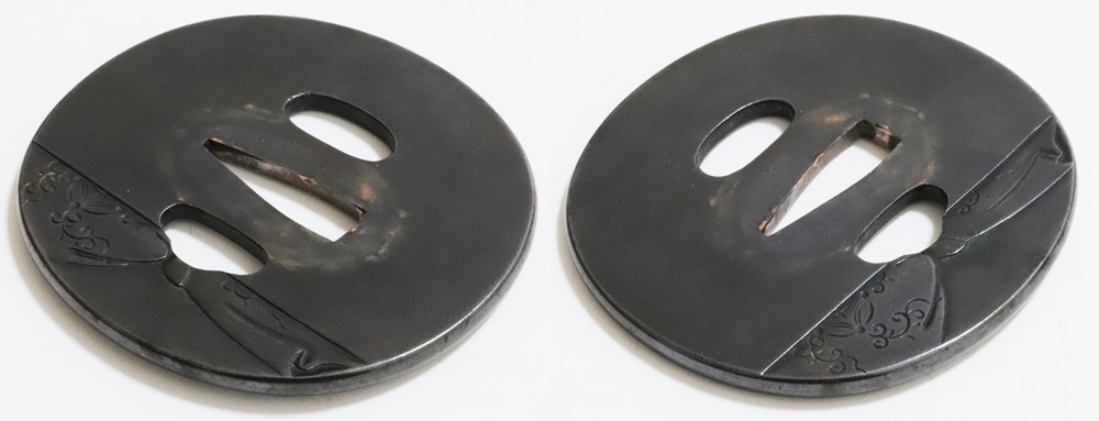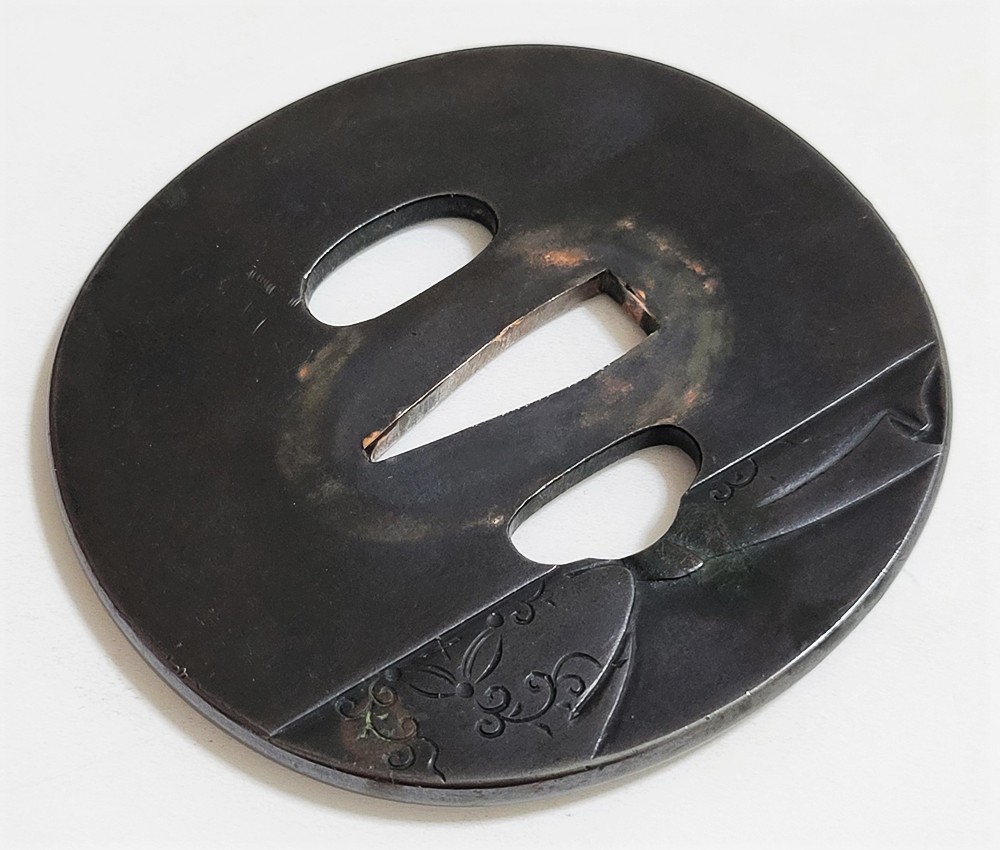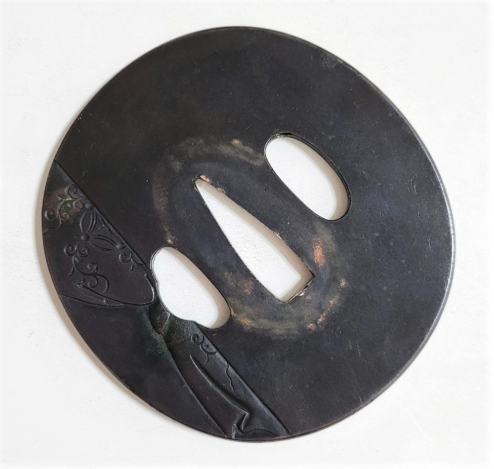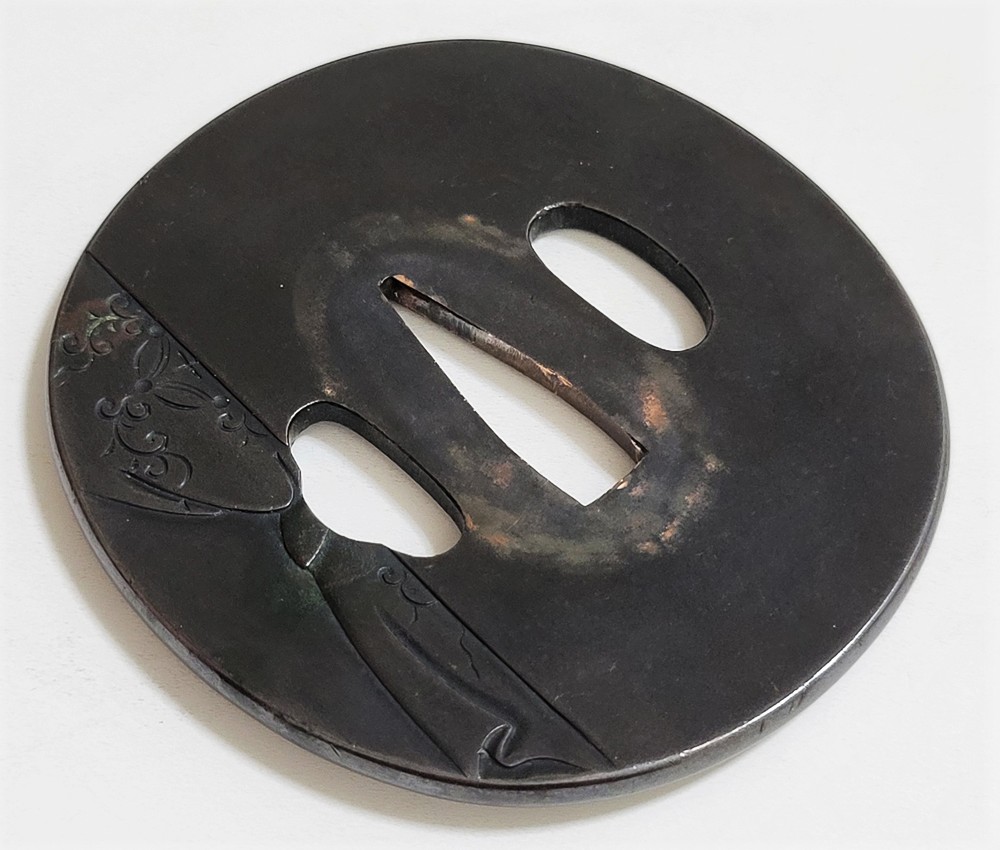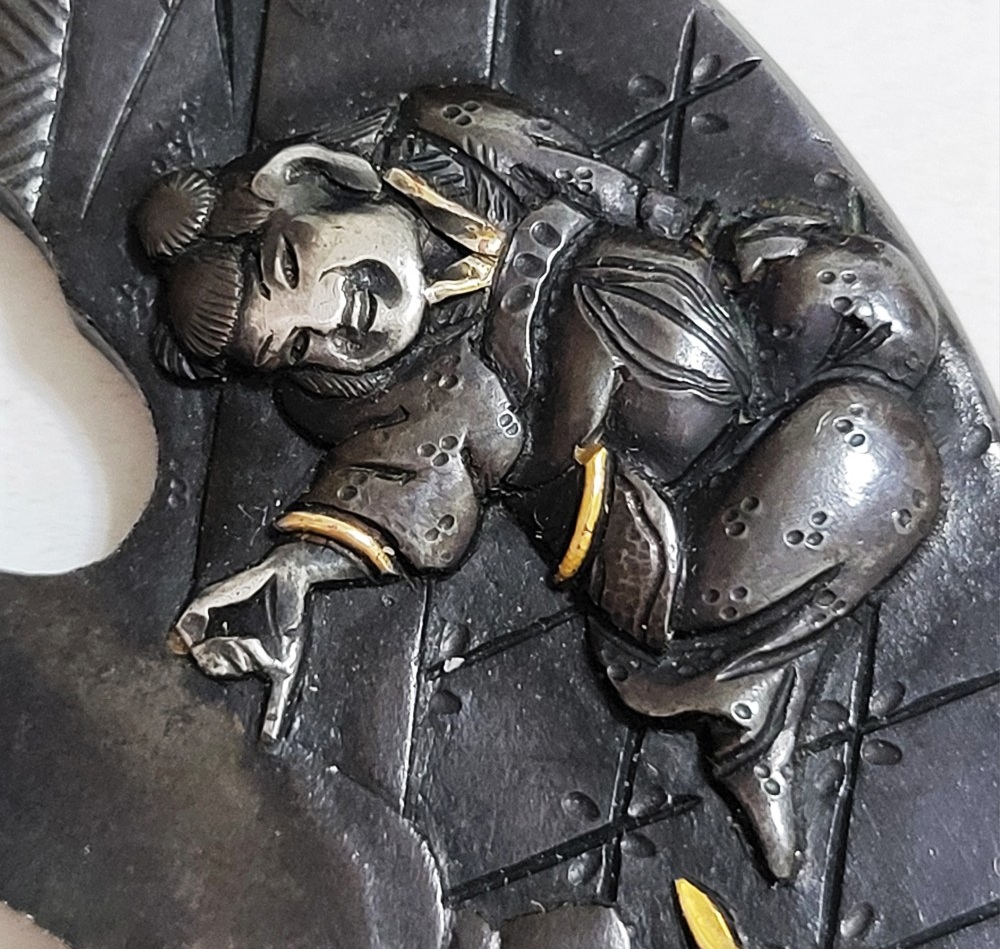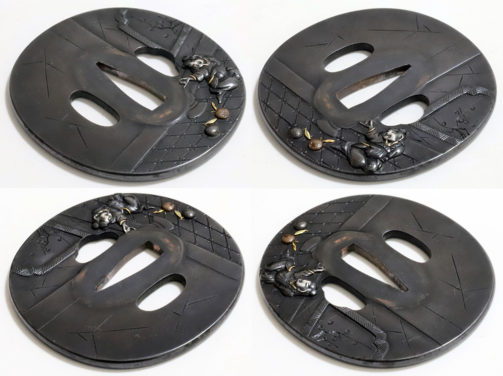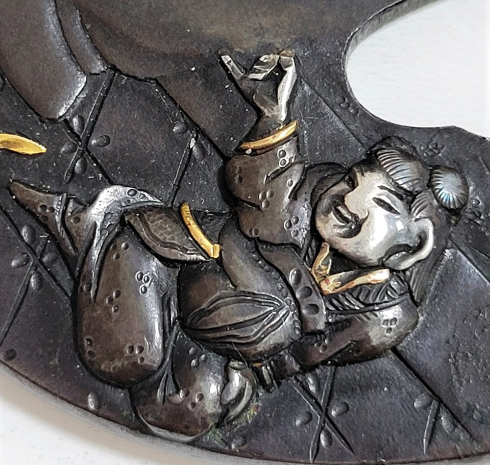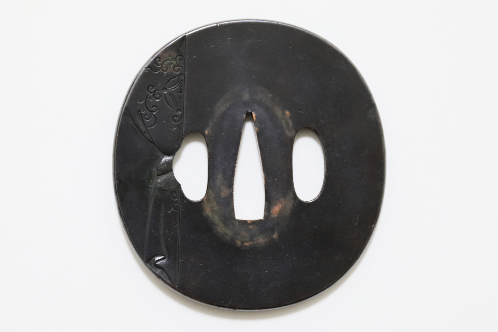 | 唐子とは中国の衣装を着て、髪の毛を頭の上や左右で結い、それ以外の毛を剃り落とした子供。中国唐王朝時代に子供を描いた図柄が盛んに描かれ、日本にも唐子の遊戯図が伝わった。本作は唐子が節句で遊ぶ図で慶賀や吉祥をあらわす。作柄より名の知れた水戸金工の作と思われる。 |