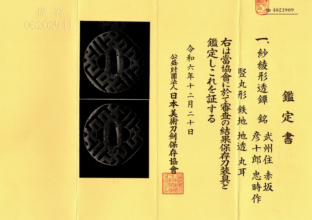 | 本作は、「表:武州住 赤坂、裏:彦十郎 忠時作」長銘鐔。赤坂忠時は、赤坂四代より九代まで代々忠時の工銘を用い、彦十郎を襲名する。忠時頃より本来の赤坂風でなく、肥後や伊藤など他派の影響を受けた作柄になる。初代忠時(赤坂四代)延享三年1746没、二代忠時・明和元年1764没、三代忠時・寛政八年1796没、四代忠時・文化二年1805没、五代忠時と六代忠時は没年不明。本作は左右櫃孔大きさが異なり銘振りは二代忠時と近似する。洗練味ある沙綾形透鐔。2024年保存刀装具審査合格。 |