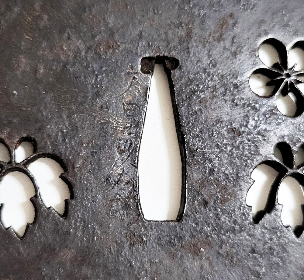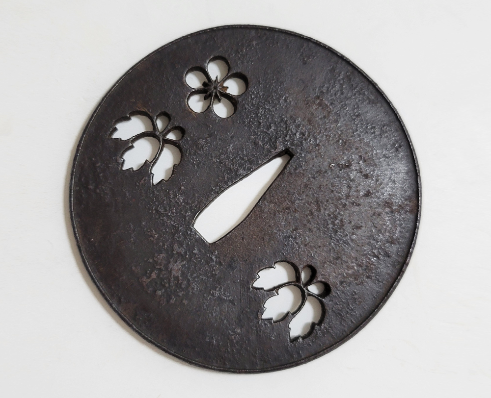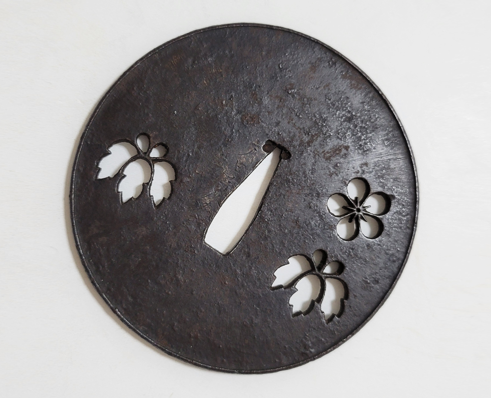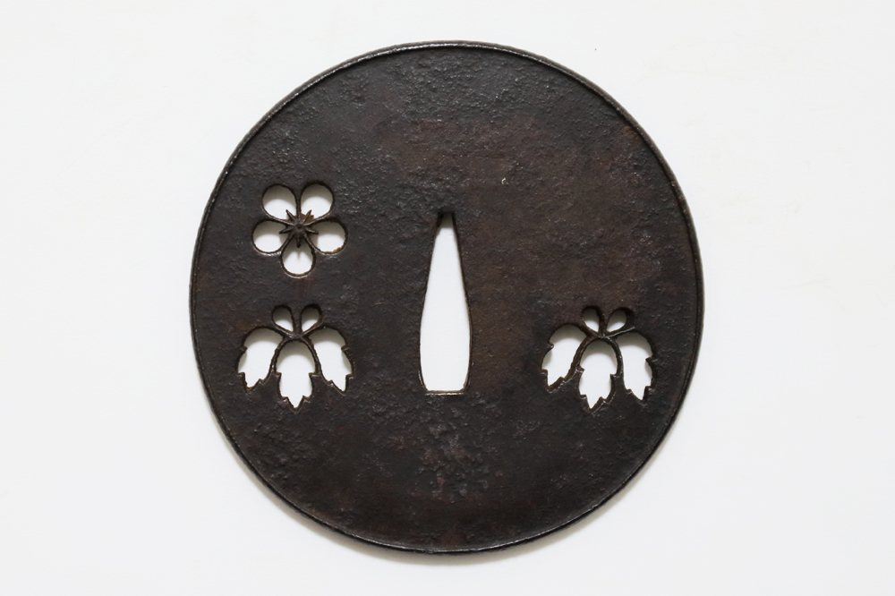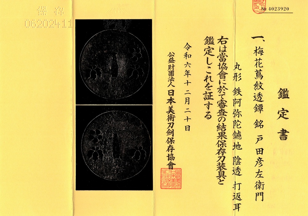 | 戸田彦左衛門は尾張江戸期代表工の一人。小透し多く、阿弥陀鑢得意。尾張戸田村住。本作は微細な阿弥陀鑢を掛け打返し耳を付ける。精錬された肉置きある平地鉄には梅花と蔦紋の小透を施す。梅は陽気な春の到来を知らせ、蔦は蔓を成長させる吉祥の図。質素ながらも気品ある鐔。2024年保存刀装具審査合格。 |