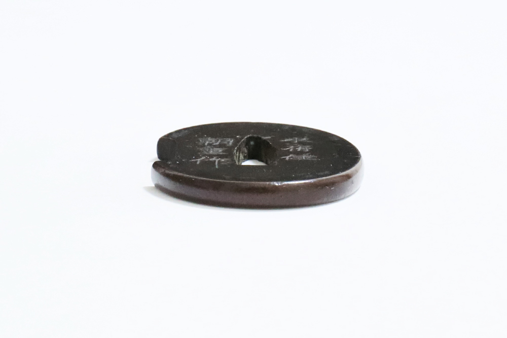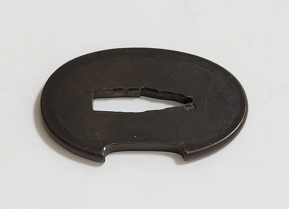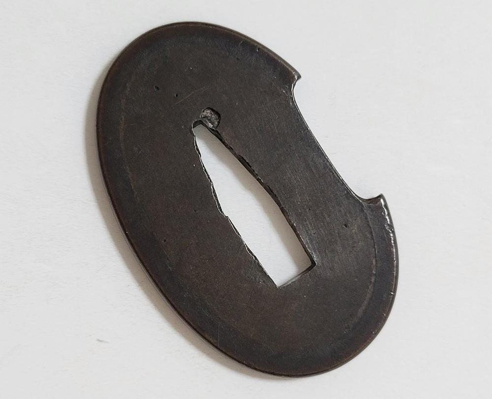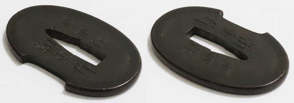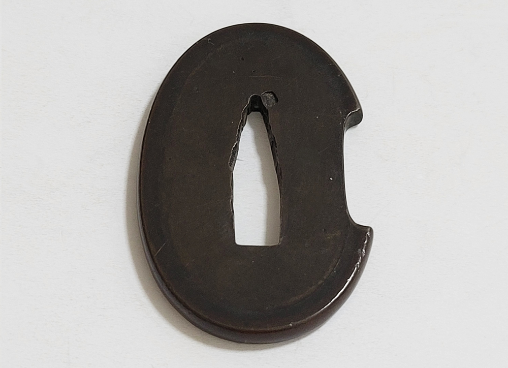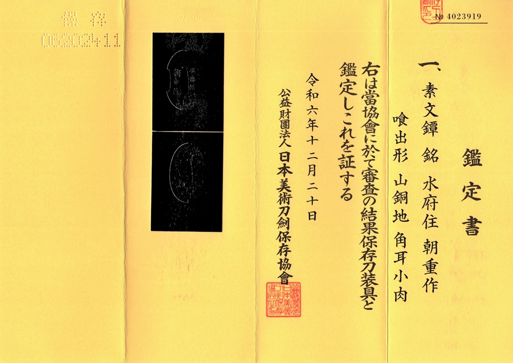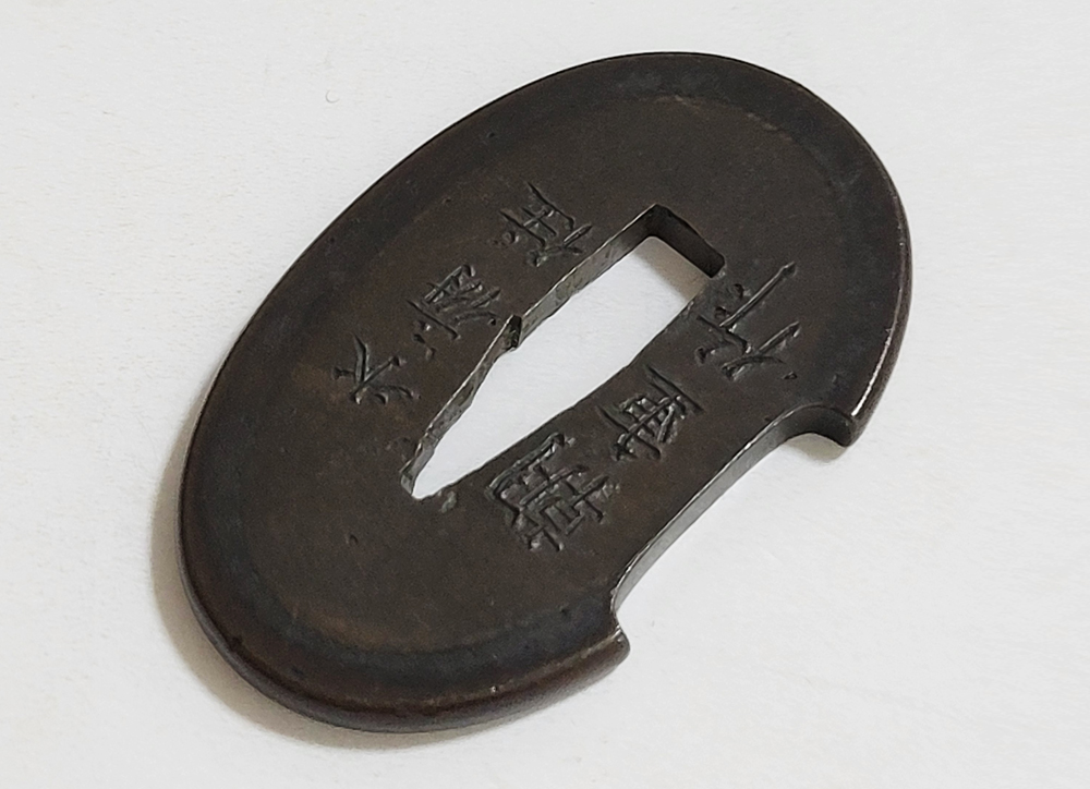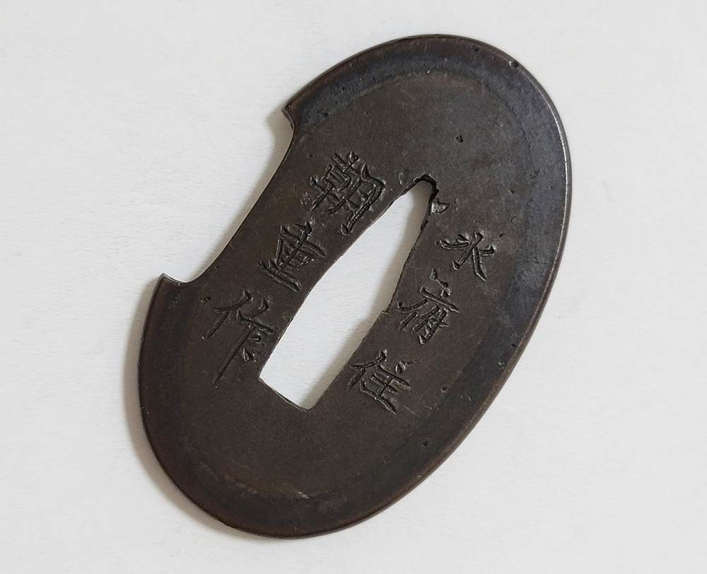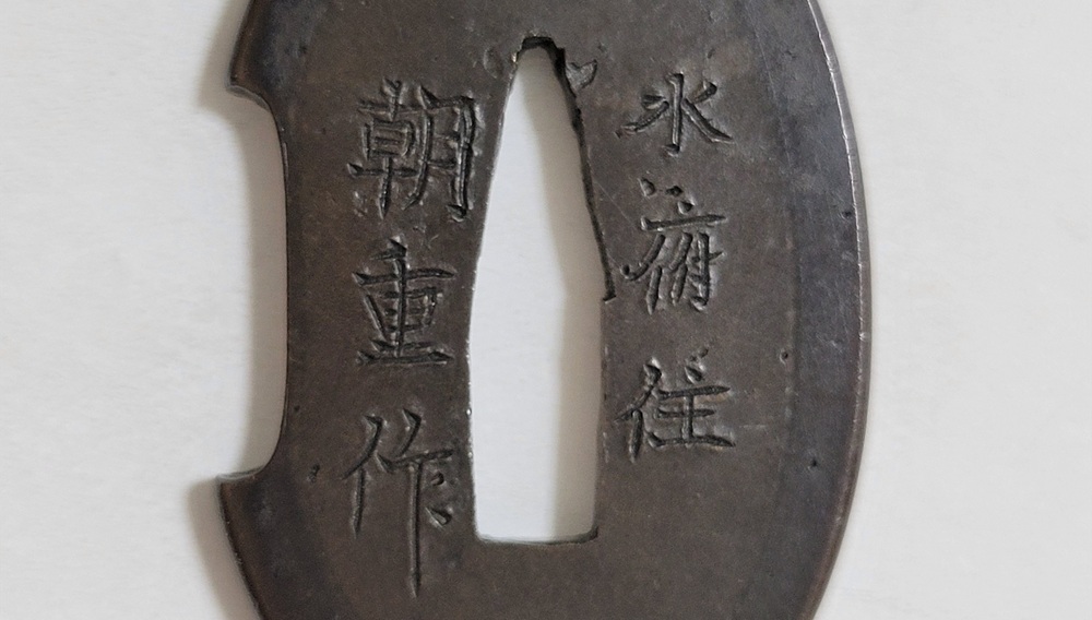 | 喰出素紋鐔に「水府住 朝重作」と毅然とした銘を刻す。水戸藩士の余技作であろうか。探求心が湧く。2024年保存刀装具審査合格。 |