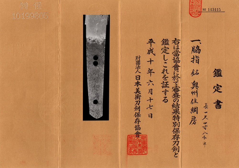 | 綱房は会津古川家の兼定系二代。初め兼定と銘を切っていたが、蒲生秀行が関が原合戦の戦功によって陸奥国会津藩主として慶長六年(1601)再び入封になると兼定は俸禄を賜り、併せて秀行の命により「綱房」と改銘した。寛永十四年(1637)没。本作は力強い慶長新刀姿の平造り脇指。1998年特別保存刀剣審査合格。 |