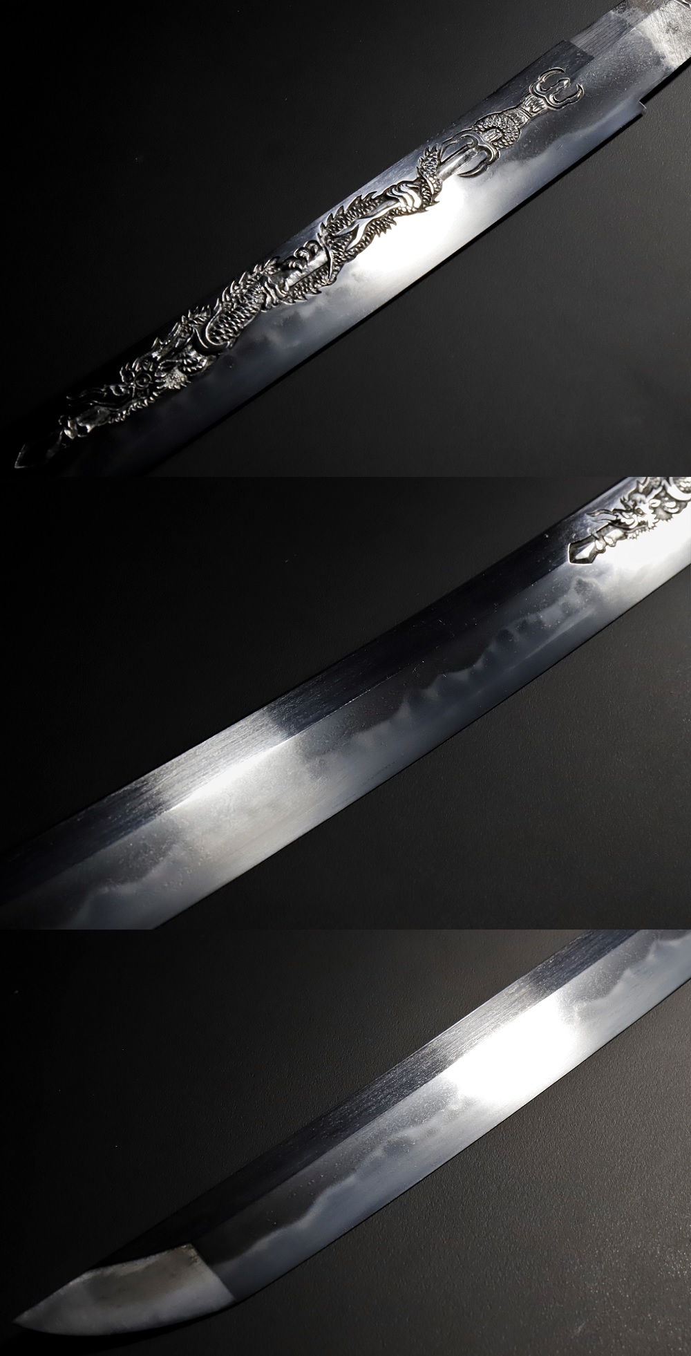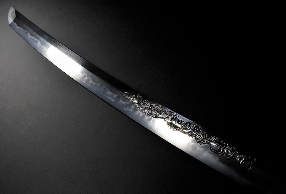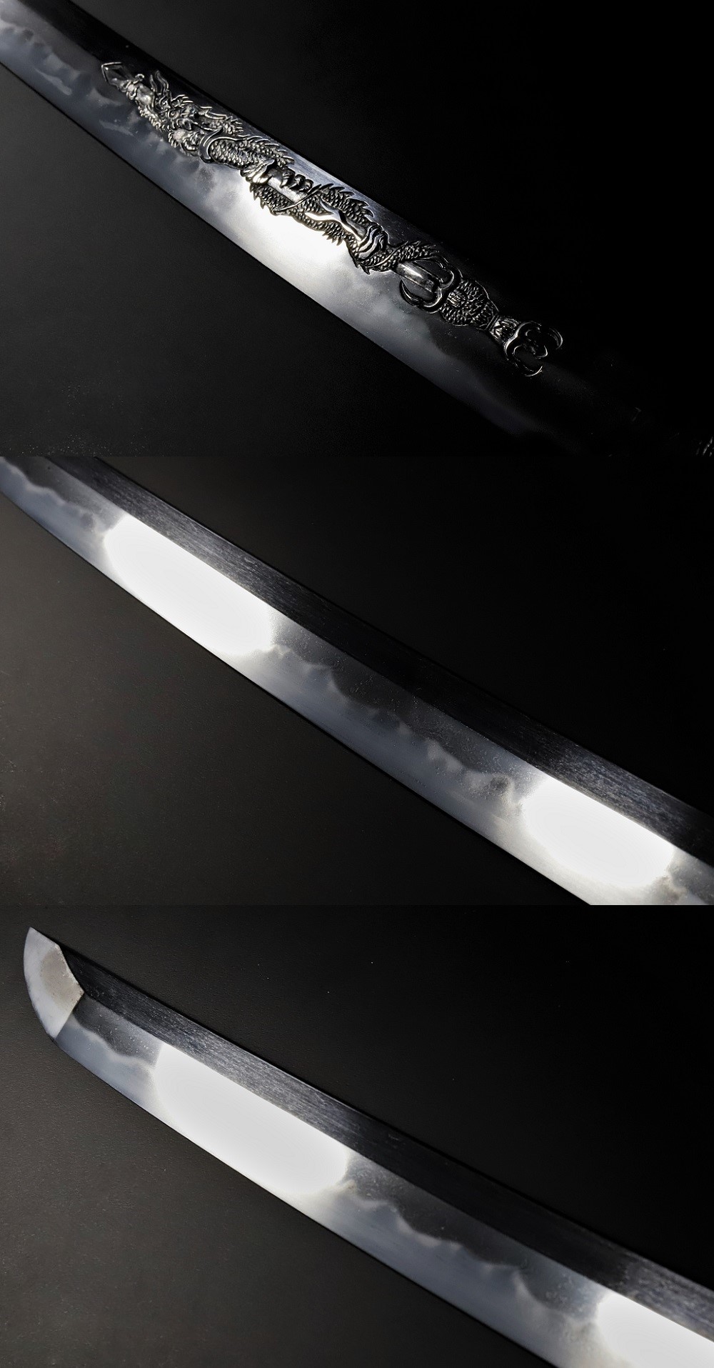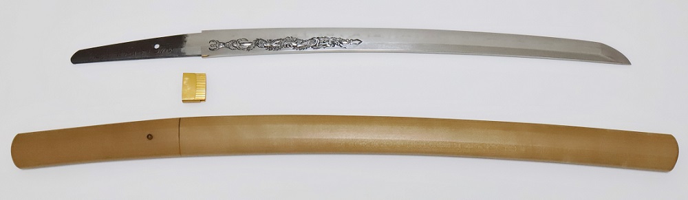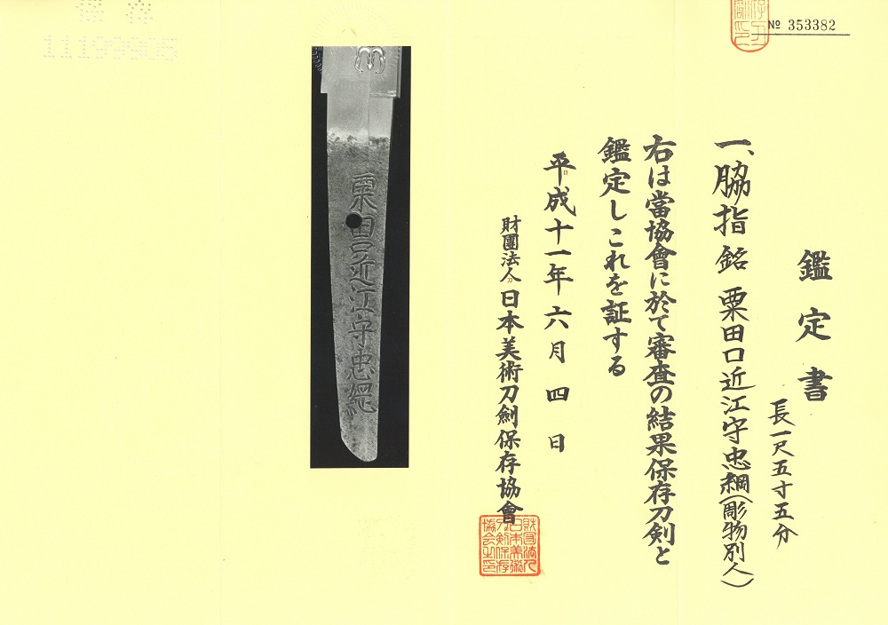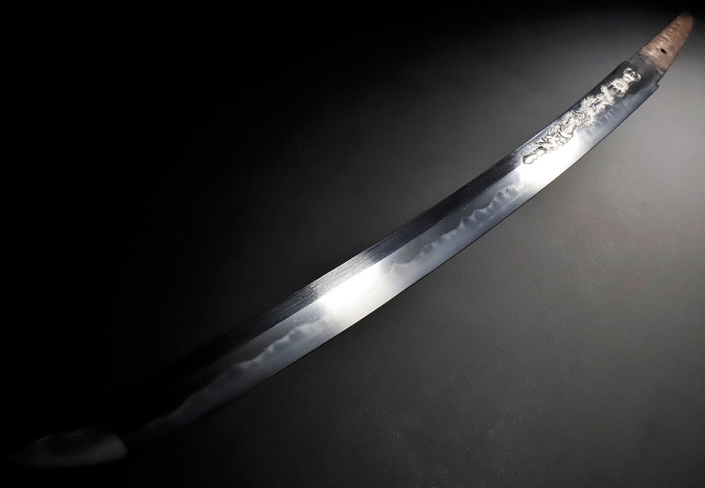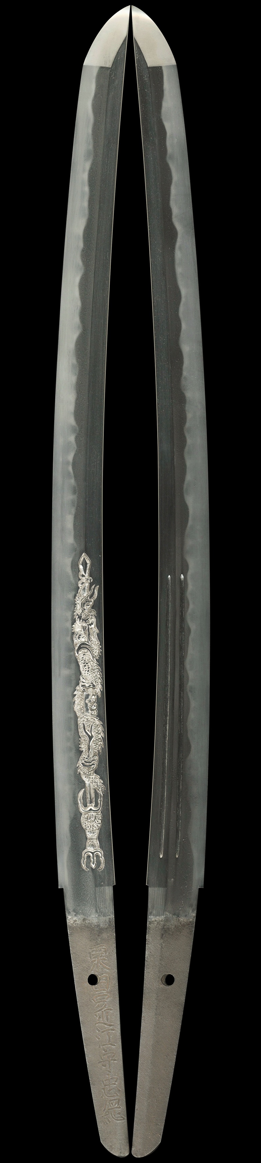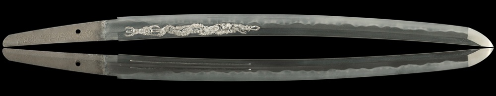 | 本作は銘振りの特徴より一竿子忠綱(二代忠綱)。一竿子忠綱は初代粟田口近江守忠綱の子で父と同様近江守を受領。技量は父に優り、彫刻の名人としても名高い。津田助廣、井上真改と共に大阪新刀の三傑と称されている。本作には表に見事な真の剣巻龍、裏に護摩箸の刀身彫りがあるが一竿子の龍とは異なる。「彫同作」「彫物同作」と添銘なく刀身彫刻は別人。しかしながら大きな欠点はなく、地刃共に健全で優れた脇指といえる。1999年保存刀剣審査合格。 |