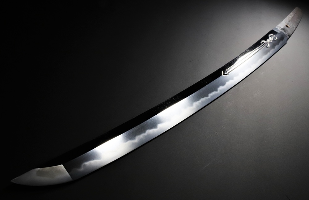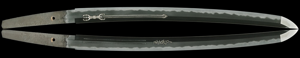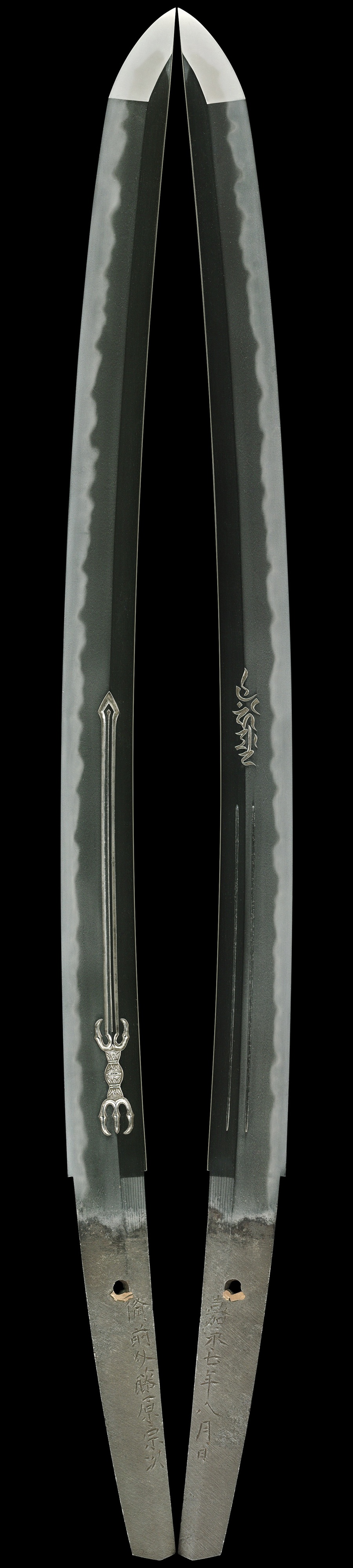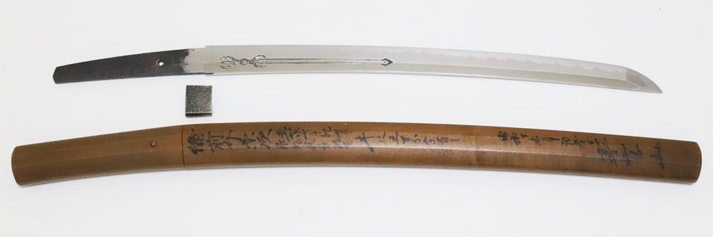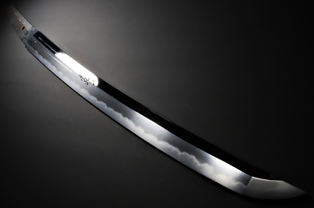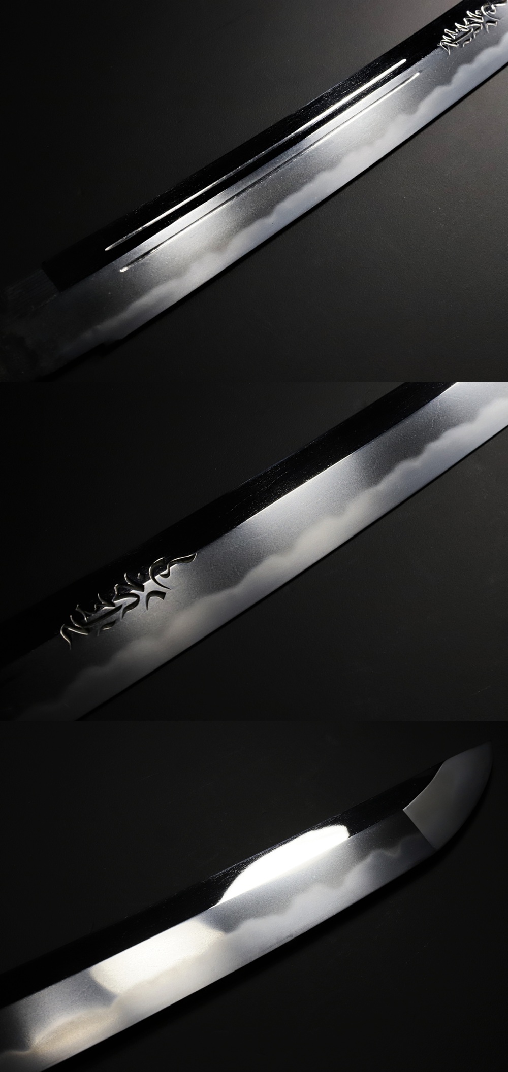 | 固山宗次は享和三年(1803)陸奥国白河生まれ。師匠は米沢の刀工加藤綱英といわれるが実際には丁子刃を多く焼いた綱英弟の長運斎綱俊に多大な影響を受けたと思われる。初め白河藩松平家に抱えられ、文政六年(1823)松平家の伊勢転封にともない時を置いて文政十二年(1829)頃桑名に移住。天保二年(1831)頃江戸に出て鍛刀。弘化二年(1845)42歳時に備前介を受領する。新々刀期の上々作刀工で備前伝の第一人者と評される。本作は応永備前写しを念頭に置いた作であろう。宗次51歳壮年期の名品。寒山先生鞘書「備前介宗次 嘉永七年紀有之 彫物見事珍重 壱尺五寸分余有之 昭和丁未(42・1967)年初春日 寒山誌(花押)」あり。2020年特別保存刀剣審査合格。 |